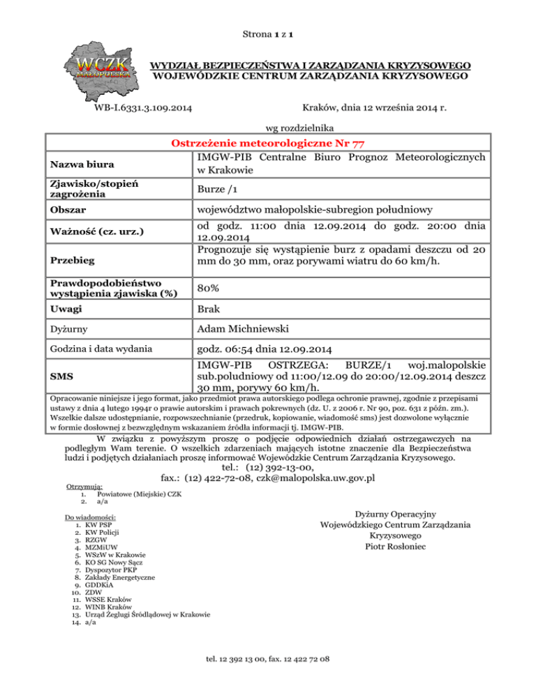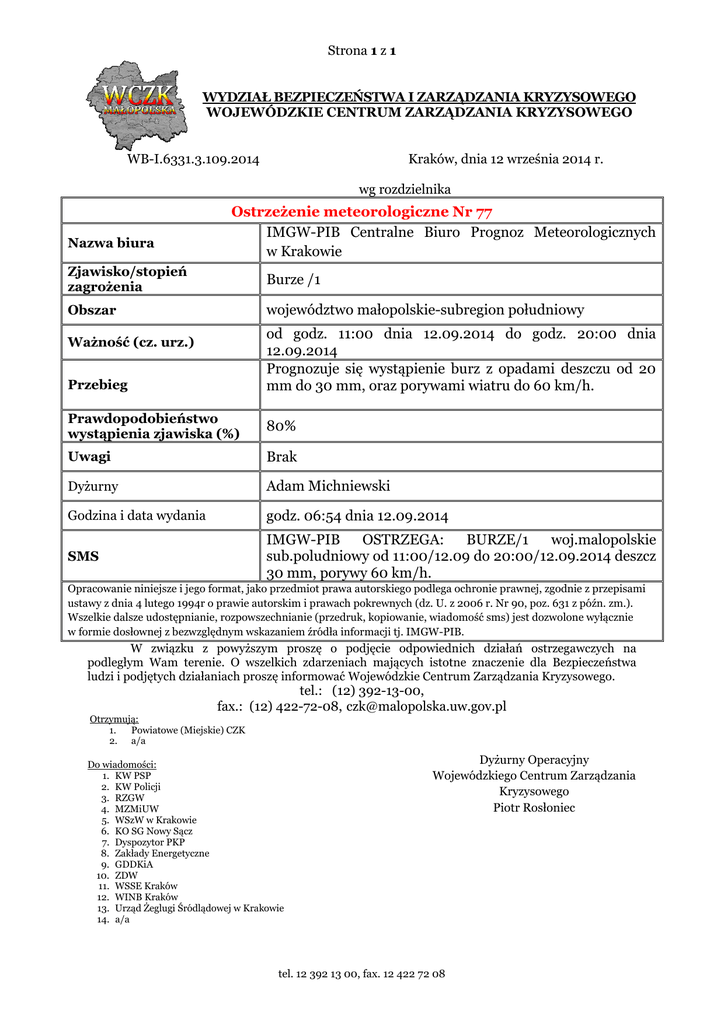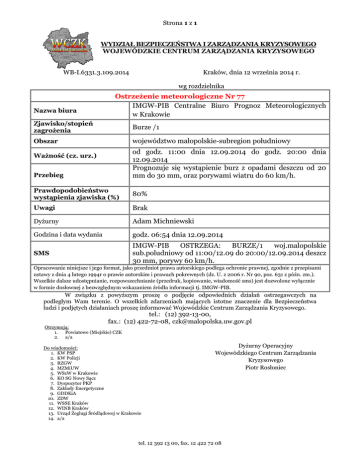 Strona 1 z 1 WYDZIAŁ BEZPIECZEŃSTWA I ZARZĄDZANIA KRYZYSOWEGO WOJEWÓDZKIE CENTRUM ZARZĄDZANIA KRYZYSOWEGO WB-I.6331.3.109.2014 Kraków, dnia 12 września 2014 r. wg rozdzielnika Nazwa biura Ostrzeżenie meteorologiczne Nr 77 IMGW-PIB Centralne Biuro Prognoz Meteorologicznych w Krakowie Zjawisko/stopień zagrożenia Burze /1 Obszar województwo małopolskie-subregion południowy od godz. 11:00 dnia 12.09.2014 do godz. 20:00 dnia 12.09.2014 Prognozuje się wystąpienie burz z opadami deszczu od 20 mm do 30 mm, oraz porywami wiatru do 60 km/h. Ważność (cz. urz.) Przebieg Prawdopodobieństwo wystąpienia zjawiska (%) 80% Uwagi Brak Dyżurny Adam Michniewski Godzina i data wydania godz. 06:54 dnia 12.09.2014 SMS IMGW-PIB OSTRZEGA: BURZE/1 woj.malopolskie sub.poludniowy od 11:00/12.09 do 20:00/12.09.2014 deszcz 30 mm, porywy 60 km/h. Opracowanie niniejsze i jego format, jako przedmiot prawa autorskiego podlega ochronie prawnej, zgodnie z przepisami ustawy z dnia 4 lutego 1994r o prawie autorskim i prawach pokrewnych (dz. U. z 2006 r. Nr 90, poz. 631 z późn. zm.). Wszelkie dalsze udostępnianie, rozpowszechnianie (przedruk, kopiowanie, wiadomość sms) jest dozwolone wyłącznie w formie dosłownej z bezwzględnym wskazaniem źródła informacji tj. IMGW-PIB. W związku z powyższym proszę o podjęcie odpowiednich działań ostrzegawczych na podległym Wam terenie. O wszelkich zdarzeniach mających istotne znaczenie dla Bezpieczeństwa ludzi i podjętych działaniach proszę informować Wojewódzkie Centrum Zarządzania Kryzysowego. tel.: (12) 392-13-00, fax.: (12) 422-72-08, [email protected] Otrzymują: 1. Powiatowe (Miejskie) CZK 2. a/a Do wiadomości: 1. KW PSP 2. KW Policji 3. RZGW 4. MZMiUW 5. WSzW w Krakowie 6. KO SG Nowy Sącz 7. Dyspozytor PKP 8. Zakłady Energetyczne 9. GDDKiA 10. ZDW 11. WSSE Kraków 12. WINB Kraków 13. Urząd Żeglugi Śródlądowej w Krakowie 14. a/a Dyżurny Operacyjny Wojewódzkiego Centrum Zarządzania Kryzysowego Piotr Rosłoniec tel. 12 392 13 00, fax. 12 422 72 08