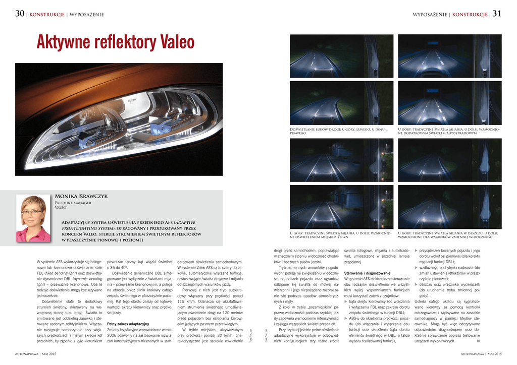 30 | KONSTRUKCJE | WYPOSAŻENIE WYPOSAŻENIE | KONSTRUKCJE | 31 Aktywne reflektory Valeo Doświetlanie łuków drogi; u góry: lewego, u dołu: prawego U góry: tradycyjne światła mijania, u dołu: wzmocnione dodatkowym światłem autostradowym U góry: tradycyjne światła mijania, u dołu: wzmocnione oświetleniem miejskim Town U góry: tradycyjne światła mijania w deszczu, u dołu: wzmocnione dla warunków zmiennej widoczności Monika Krawczyk Produkt manager Valeo Autonaprawa | Maj 2015 poszerzać łączny kąt wiązki świetlnej o 35 do 40º. Doświetlenie dynamiczne DBL zintegrowane jest wyłącznie z światłami mijania – przeważnie ksenonowymi, a polega na obrocie przez silnik krokowy całego zespołu świetlnego w płaszczyźnie poziomej. Kąt tego obrotu zależy od kątowej wartości skrętu kierownicy oraz prędkości jazdy. Pełny zakres adaptacyjny Zmiany legislacyjne wprowadzone w roku 2006 pozwoliły na zastosowanie rozwiązań konstrukcyjnych nieznanych w stan- dardowym oświetleniu samochodowym. W systemie Valeo AFS są to cztery dodatkowe, automatycznie włączane funkcje, dostosowujące światła drogowe i mijania do szczególnych warunków jazdy. Pierwszą z nich jest tryb autostradowy włączany przy prędkości ponad 115 km/h. Odznacza się ukształtowaniem strumienia świetlnego umożliwiającym oświetlenie drogi na 120 metrów przed pojazdem bez oślepiania kierowców jadących pasmem przeciwległym. W trybie miejskim, aktywowanym przy prędkości poniżej 30 km/h, charakterystyczne jest szerokie oświetlenie Fot. Valeo W systemie AFS wykorzystuje się halogenowe lub ksenonowe doświetlanie stałe FBL (fixed bending light) oraz doświetlanie dynamiczne DBL (dynamic bending light) – przeważnie ksenonowe. Oba te rodzaje doświetlenia mogą być używane jednocześnie. Doświetlenie stałe to dodatkowy strumień świetlny, skierowany na wewnętrzną stronę łuku drogi. Światło to emitowane jest oddzielną żarówką i sterowane osobnym odbłyśnikiem. Włączanie następuje samoczynnie przy większych prędkościach i małym skręcie kół przednich, by zgodnie z jego kierunkiem Fot. Valeo Adaptacyjny System Oświetlenia przedniego AFS (adaptive frontlighting system), opracowany i produkowany przez koncern Valeo, steruje strumieniem świetlnym reflektorów w płaszczyźnie pionowej i poziomej drogi przed samochodem, poprawiające w znacznym stopniu widoczność chodników i bocznych pasów jezdni. Tryb „zmiennych warunków pogodowych” polega na zwiększeniu widoczności po bokach pojazdu oraz ogranicza odbijanie się światła od mokrej nawierzchni i jego niepożądane rozpraszanie się podczas opadów atmosferycznych i mgły. Z kolei w trybie „pozamiejskim” poprawę widoczności podczas szybkiej jazdy zapewnia wzmocnienie intensywności i zasięgu wszystkich świateł przednich. Przy szybkiej jeździe pełne oświetlenie adaptacyjne wykorzystuje w odpowiednich konfiguracjach trzy różne źródła światła (drogowe, mijania i autostradowe), umieszczone w przedniej lampie zespolonej. Sterowanie i diagnozowanie W systemie AFS elektroniczne sterowanie obu rodzajów doświetlenia we wszystkich wyżej wspomnianych funkcjach musi korzystać zatem z czujników: kąta skrętu kierownicy (do włączania i wyłączania FBL oraz zakresu obrotu zespołu świetlnego w funkcji DBL); ABS-u do określenia prędkości pojazdu (do włączania i wyłączania obu funkcji oraz określenia kąta obrotu elementu świetlnego w DBL, a także wyboru realizowanej funkcji); przyspieszeń bocznych pojazdu i jego obrotu wokół osi pionowej (dla korekty regulacji funkcji DBL); wzdłużnego pochylenia nadwozia (do zmian ustawienia reflektorów w płaszczyźnie pionowej); deszczu oraz włącznika wycieraczek (do uruchamia trybu zmiennej po gody). Usterki całego układu są sygnalizowane kierowcy za pomocą kontrolki ostrzegawczej i zapisywane na zasadzie samodiagnozy w pamięci błędów sterownika. Mogą być więc odczytywane odpowiednim diagnoskopem oraz dokładnie sprawdzone poprzez testowanie urządzeń wykonawczych. n Autonaprawa | Maj 2015