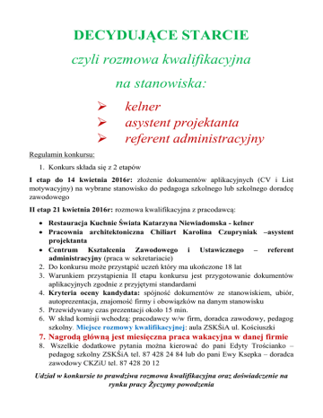 DECYDUJĄCE STARCIE czyli rozmowa kwalifikacyjna na stanowiska: kelner asystent projektanta referent administracyjny Regulamin konkursu: 1. Konkurs składa się z 2 etapów I etap do 14 kwietnia 2016r: złożenie dokumentów aplikacyjnych (CV i List motywacyjny) na wybrane stanowisko do pedagoga szkolnego lub szkolnego doradcę zawodowego II etap 21 kwietnia 2016r: rozmowa kwalifikacyjna z pracodawcą: Restauracja Kuchnie Świata Katarzyna Niewiadomska - kelner Pracownia architektoniczna Chiliart Karolina Czupryniak –asystent projektanta Centrum Kształcenia Zawodowego i Ustawicznego – referent administracyjny (praca w sekretariacie) 2. Do konkursu może przystąpić uczeń który ma ukończone 18 lat 3. Warunkiem przystąpienia II etapu konkursu jest przygotowanie dokumentów aplikacyjnych zgodnie z przyjętymi standardami 4. Kryteria oceny kandydata: spójność dokumentów ze stanowiskiem, ubiór, autoprezentacja, znajomość firmy i obowiązków na danym stanowisku 5. Przewidywany czas prezentacji około 15 min. 6. W skład komisji wchodzą: pracodawcy w/w firm, doradca zawodowy, pedagog szkolny. Miejsce rozmowy kwalifikacyjnej: aula ZSKŚiA ul. Kościuszki 7. Nagrodą główną jest miesięczna praca wakacyjna w danej firmie 8. Wszelkie dodatkowe pytania można kierować do pani Edyty Trościanko – pedagog szkolny ZSKŚiA tel. 87 428 24 84 lub do pani Ewy Ksepka – doradca zawodowy CKZiU tel. 87 428 20 12 Udział w konkursie to prawdziwa rozmowa kwalifikacyjna oraz doświadczenie na rynku pracy Życzymy powodzenia