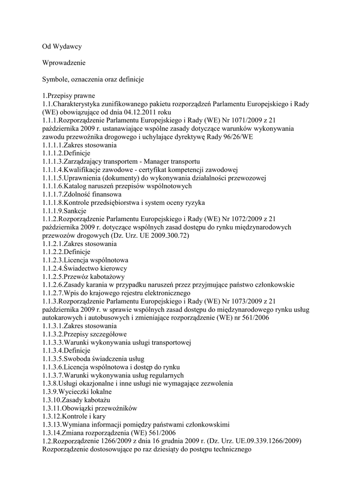 Od Wydawcy Wprowadzenie Symbole, oznaczenia oraz definicje 1.Przepisy prawne 1.1.Charakterystyka zunifikowanego pakietu rozporządzeń Parlamentu Europejskiego i Rady (WE) obowiązujące od dnia 04.12.2011 roku 1.1.1.Rozporządzenie Parlamentu Europejskiego i Rady (WE) Nr 1071/2009 z 21 października 2009 r. ustanawiające wspólne zasady dotyczące warunków wykonywania zawodu przewoźnika drogowego i uchylające dyrektywę Rady 96/26/WE 1.1.1.1.Zakres stosowania 1.1.1.2.Definicje 1.1.1.3.Zarządzający transportem - Manager transportu 1.1.1.4.Kwalifikacje zawodowe - certyfikat kompetencji zawodowej 1.1.1.5.Uprawnienia (dokumenty) do wykonywania działalności przewozowej 1.1.1.6.Katalog naruszeń przepisów wspólnotowych 1.1.1.7.Zdolność finansowa 1.1.1.8.Kontrole przedsiębiorstwa i system oceny ryzyka 1.1.1.9.Sankcje 1.1.2.Rozporządzenie Parlamentu Europejskiego i Rady (WE) Nr 1072/2009 z 21 października 2009 r. dotyczące wspólnych zasad dostępu do rynku międzynarodowych przewozów drogowych (Dz. Urz. UE 2009.300.72) 1.1.2.1.Zakres stosowania 1.1.2.2.Definicje 1.1.2.3.Licencja wspólnotowa 1.1.2.4.Świadectwo kierowcy 1.1.2.5.Przewóz kabotaŜowy 1.1.2.6.Zasady karania w przypadku naruszeń przez przyjmujące państwo członkowskie 1.1.2.7.Wpis do krajowego rejestru elektronicznego 1.1.3.Rozporządzenie Parlamentu Europejskiego i Rady (WE) Nr 1073/2009 z 21 października 2009 r. w sprawie wspólnych zasad dostępu do międzynarodowego rynku usług autokarowych i autobusowych i zmieniające rozporządzenie (WE) nr 561/2006 1.1.3.1.Zakres stosowania 1.1.3.2.Przepisy szczegółowe 1.1.3.3.Warunki wykonywania usługi transportowej 1.1.3.4.Definicje 1.1.3.5.Swoboda świadczenia usług 1.1.3.6.Licencja wspólnotowa i dostęp do rynku 1.1.3.7.Warunki wykonywania usług regularnych 1.3.8.Usługi okazjonalne i inne usługi nie wymagające zezwolenia 1.3.9.Wycieczki lokalne 1.3.10.Zasady kabotaŜu 1.3.11.Obowiązki przewoźników 1.3.12.Kontrole i kary 1.3.13.Wymiana informacji pomiędzy państwami członkowskimi 1.3.14.Zmiana rozporządzenia (WE) 561/2006 1.2.Rozporządzenie 1266/2009 z dnia 16 grudnia 2009 r. (Dz. Urz. UE.09.339.1266/2009) Rozporządzenie dostosowujące po raz dziesiąty do postępu technicznego rozporządzenie Rady (EWG) nr 3821/85 w sprawie urządzeń rejestrujących stosowanych w transporcie drogowym 1.2.1.Zakres stosowania 1.2.2.Definicje 1.2.3.Zmiany wprowadzone przez rozporządzenie 1266/2009 1.2.3.1.Anulowanie trybu praca 1.2.3.2.Rejestracja odpoczynku podczas jazdy 1.2.3.3.Istotne zmiany w wymaganiach Podsumowanie Literatura 2.Międzynarodowe reguły realizacji kontraktu handlowego 2.1.Formuła Incoterms 2.1.1.Formuła Incoterms 2000 2.1.1.1.Interpretacja formuł Incoterms 2000 2.1.2.Incoterms 2010 2.1.2.1.Edycja Incoterms9 2010 Literatura 3.Systemy pobierania opłat za infrastrukturę drogową w Europie 3.1.Podstawy prawne funkcjonowania systemów opłat drogowych w Europie 3.2.Zasady ustalania opłat drogowych 3.3.Rodzaje systemów opłat drogowych 3.4.Elektroniczny system opłat drogowych 3.5.Rodzaje urządzeń słuŜące do poboru opłat drogowych 3.6.System pobierania opłat drogowych na terytorium Niemiec 3.6.1.Podstawy prawne 3.6.2.Pojazdy objęte obowiązkiem płacenia myta 3.6.3.Pojazdy zwolnione od obowiązku płacenia myta 3.6.4.Sieć dróg podlegająca opłacie 3.6.5.Klasyfikacja myta [1] 3.6.6.Kontrola płatności myta 3.6.7.Charakterystyka systemu moŜliwości poboru myta firmy Toll Collect GmbH 3.6.8.Zasady funkcjonowania automatycznego systemu księgowania myta 3.6.9.Zasady funkcjonowania ręcznego systemu księgowania myta 3.6.10.Czynności kierowcy przy opłacie myta przez terminal w systemie ręcznym 3.6.11.Zasady funkcjonowania ręcznego księgowania myta przez Internet 3.6.12.Awaryjny sposób opłaty myta w Niemczech 3.6.13.System kontrolny dotyczący płacenia myta 3.6.14.Inne opłaty za infrastrukturę w Niemczech 3.7.System pobierania opłat drogowych (GO) na terytorium Austrii 3.7.1.Podstawowe wiadomości o systemie 3.7.2.Sieć dróg objęta systemem opłat drogowych 3.7.3.Budowa systemu pobierania opłat (GO) 3.7.4.Charakterystyka urządzenia GO-BOX 3.7.5.Sposoby elektronicznego pobierania opłat 3.7.6.Zasada działania systemu 3.7.7.Istotne informacje dla kierowcy z urządzenia GO-BOX w czasie jazdy (funkcjonowania systemu) 3.7.8.Kontrola systemu opłat drogowych 3.7.9.Kary dla przewoźników 3.7.10.RóŜnice i podobieństwa w pobieraniu opłaty za korzystanie z infrastruktury liniowej pomiędzy Niemcami i Austrią 3.7.11.Inne opłaty za infrastrukturę w Austrii 3.8.System pobierania opłat drogowych na terytorium Republiki Czeskiej 3.8.1.Elektroniczna opłata drogowa 3.8.2.Zasady naliczania opłat 3.8.3.Sposoby zapłaty myta 3.8.4.Kontrola opłat drogowych 3.8.5.Kontrola wykonania opłat drogowych 3.8.6.Sieć dróg objęta systemem opłat drogowych 3.9.System pobierania opłat drogowych na terytorium Francji 3.9.1.Ramy prawne regulujące pobieranie opłat za przejazdy francuskimi autostradami 3.9.2.Zarządcy francuskich autostrad 3.9.3.Zasada działania systemu 3.9.4.Pojazdy objęte obowiązkiem płacenia myta 3.9.5.Pojazdy zwolnione z obowiązku płacenia myta 3.9.6.Zalety systemu 3.9.7.Sieć dróg objętych opłatą 3.9.8.Wysokość naleŜnych opłat 3.9.9.Zasady naliczania opłat 3.9.10.Postępowanie awaryjne 3.9.11.Wysokość zniŜek ustalonych przez poszczególnych operatorów 3.10.System pobierania opłat drogowych na terytorium Słowacji 3.10.1.Przepisy prawne regulujące pobieranie opłat 3.10.2.Pojazdy objęte obowiązkiem płacenia myta 3.10.3.Pojazdy zwolnione z obowiązku płacenia myta 3.10.4.Pojazdy zwolnione od opłat drogowych mające obowiązek rejestracji 3.10.5.Stawki opłaty drogowej 3.10.6.Sposoby płatności opłaty drogowej 3.10.7.Zasada działania i budowa jednostki pokładowej 3.11.System pobierania opłat drogowych na terytorium Włoch 3.11.1.Kategorie pojazdów 3.11.2.Rodzaje dróg objętych mytem 3.12.