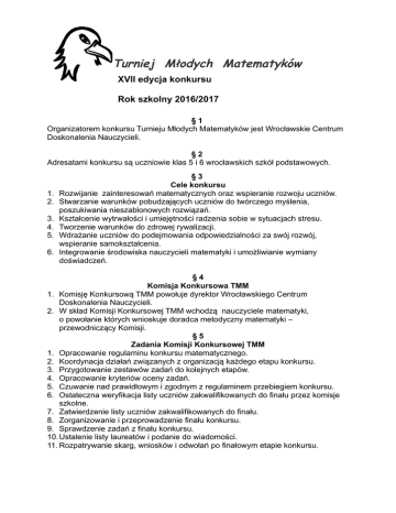 Turniej Młodych Matematyków XVII edycja konkursu Rok szkolny 2016/2017 §1 Organizatorem konkursu Turnieju Młodych Matematyków jest Wrocławskie Centrum Doskonalenia Nauczycieli. §2 Adresatami konkursu są uczniowie klas 5 i 6 wrocławskich szkół podstawowych. 1. 2. 3. 4. 5. 6. §3 Cele konkursu Rozwijanie zainteresowań matematycznych oraz wspieranie rozwoju uczniów. Stwarzanie warunków pobudzających uczniów do twórczego myślenia, poszukiwania nieszablonowych rozwiązań. Kształcenie wytrwałości i umiejętności radzenia sobie w sytuacjach stresu. Tworzenie warunków do zdrowej rywalizacji. Wdrażanie uczniów do podejmowania odpowiedzialności za swój rozwój, wspieranie samokształcenia. Integrowanie środowiska nauczycieli matematyki i umożliwianie wymiany doświadczeń. §4 Komisja Konkursowa TMM 1. Komisję Konkursową TMM powołuje dyrektor Wrocławskiego Centrum Doskonalenia Nauczycieli. 2. W skład Komisji Konkursowej TMM wchodzą nauczyciele matematyki, o powołanie których wnioskuje doradca metodyczny matematyki – przewodniczący Komisji. §5 Zadania Komisji Konkursowej TMM 1. Opracowanie regulaminu konkursu matematycznego. 2. Koordynacja działań związanych z organizacją każdego etapu konkursu. 3. Przygotowanie zestawów zadań do kolejnych etapów. 4. Opracowanie kryteriów oceny zadań. 5. Czuwanie nad prawidłowym i zgodnym z regulaminem przebiegiem konkursu. 6. Ostateczna weryfikacja listy uczniów zakwalifikowanych do finału przez komisje szkolne. 7. Zatwierdzenie listy uczniów zakwalifikowanych do finału. 8. Zorganizowanie i przeprowadzenie finału konkursu. 9. Sprawdzenie zadań z finału konkursu. 10. Ustalenie listy laureatów i podanie do wiadomości. 11. Rozpatrywanie skarg, wniosków i odwołań po finałowym etapie konkursu. §6 Szkolna Komisja Konkursowa 1. Dyrektor szkoły powołuje Szkolną Komisję Konkursową, przewodniczącego komisji oraz nauczyciela - koordynatora ds. udziału szkoły w Turnieju Młodych Matematyków. 2. Przewodniczący komisji odpowiada za przebieg konkursu zgodnie z niniejszym regulaminem, w szczególności za: zgłoszenie szkoły do udziału w TMM, zorganizowanie etapu szkolnego, dostarczenie protokołu z tego etapu wraz z listą uczniów zakwalifikowanych do finału, pracami uczniów i zgodami na przetwarzanie danych osobowych. 1. 2. 3. 4. 5. §7 Zgłoszenie szkoły/uczniów do konkursu Koordynator ds. udziału szkoły w TMM dostarcza do dnia 10.02.2017 r. do Komisji Konkursowej TMM zgłoszenie szkoły do udziału w konkursie podpisane przez dyrektora szkoły wg formularza „Załącznik 1.” Szkoła, która nie dokona zgłoszenia w wyznaczonym terminie, nie może uczestniczyć w konkursie. Koordynator ds. udziału szkoły w TMM dostarcza do Komisji Konkursowej TMM protokół ze szkolnego etapu konkursu wg formularza „Załącznik 2.”, listę uczniów zakwalifikowanych przez Szkolną Komisję Konkursową do udziału w finale konkursu wg formularza „Załącznik 2a.” wraz z pracami uczniów i zgodami na przetwarzanie danych osobowych. Koordynator ds. udziału szkoły w TMM dostarcza Komisji Konkursowej zgody nauczycieli i rodziców/prawnych opiekunów uczniów na przetwarzanie danych osobowych w zakresie związanym z konkursem odpowiednio wg formularzy „Załącznik 3.” i „Załącznik 4.” Koordynator dostarcza dokumenty opisane w punktach 1, 3, 4 na adres: Wrocławskie Centrum Doskonalenia Nauczycieli ul. Swobodna 73a, 50-089 Wrocław, z dopiskiem: Turniej Młodych Matematyków 1. 2. 3. 4. 5. 6. 7. §8 Zadania Szkolnej Komisji Konkursowej: Rozpropagowanie konkursu wśród uczniów i rodziców oraz stworzenie uczniom warunków do udziału w szkolnym etapie konkursu. Wybór uczniów do szkolnego etapu konkursu. Zapewnienie poufności zestawu zadań konkursowych od czasu pobrania do rozpoczęcia etapu szkolnego. Powielenie listy zadań w ilości odpowiedniej do ilości uczestników konkursu. Przygotowanie i przeprowadzenie szkolnego etapu konkursu w sposób zapewniający samodzielną pracę uczniów. Dopilnowanie, aby uczestnicy podczas konkursu nie korzystali z kalkulatorów ani urządzeń telekomunikacyjnych. Sprawdzenie prac uczniów zgodnie z kryteriami opracowanymi przez Komisję Konkursową TMM i podanymi na stronie internetowej WCDN: www.wcdn.wroc.pl 8. Sporządzenie i przekazanie protokołu z etapu szkolnego do Komisji Konkursowej TMM wraz z listą uczniów zakwalifikowanych do finału (załączniki 2. i 2a.) oraz pracami uczniów zakwalifikowanych przez Szkolną Komisję Konkursową do finału konkursu TMM oraz zgodami na przetwarzanie danych osobowych (załączniki 3. i 4.) 1. 2. 3. 4. 1. 2. 3. 4. 5. §9 Kryteria kwalifikowania Szkolna Komisja Konkursowa TMM decyduje o wyborze uczniów do szkolnego etapu konkursu wg własnych kryteriów. Szkolna Komisja Konkursowa kwalifikuje do finału konkursu uczniów, którzy zdobyli co najmniej 70% punktów możliwych do uzyskania w szkolnym etapie konkursu. Jeśli nie ma uczniów, którzy zdobyli co najmniej 70% punktów, Szkolna Komisja Konkursowa TMM kwalifikuje do finału konkursu jednego ucznia z największą liczbą punktów w szkole, ale nie mniejszą niż 50% punktów możliwych do uzyskania. Komisja Konkursowa TMM zastrzega sobie prawo do zmiany minimalnej liczby punktów wymaganej do zakwalifikowania ucznia do finału konkursu. § 10 Tryb odwoławczy Odwołanie od przebiegu i wyników konkursu może wnosić rodzic lub prawny opiekun ucznia. Odwołanie po szkolnym etapie konkursu wnosi się na piśmie do Przewodniczącego Szkolnej Komisji Konkursowej TMM. Odwołanie po finale konkursu wnosi się na piśmie do Przewodniczącego Komisji Konkursowej TMM WCDN, ul. Swobodna73a, 50-089 Wrocław, Turniej Młodych Matematyków w nieprzekraczalnym terminie 3 dni od dnia ogłoszenia wyników. Odwołanie rozpatrywane jest w ciągu 7 dni, licząc od dnia wpływu. Odwołania nie mające formy pisemnej nie będą rozpatrywane. §11 Harmonogram Zgłoszeni