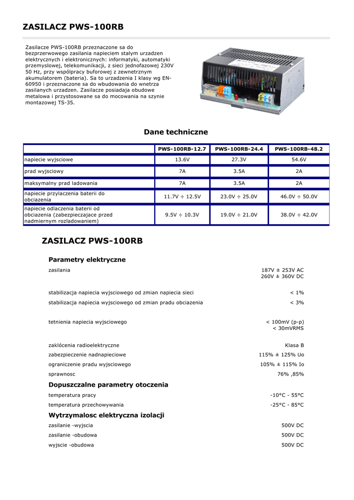 ZASILACZ PWS-100RB Zasilacze PWS-100RB przeznaczone sa do bezprzerwowego zasilania napieciem stalym urzadzen elektrycznych i elektronicznych: informatyki, automatyki przemyslowej, telekomunikacji, z sieci jednofazowej 230V 50 Hz, przy wspólpracy buforowej z zewnetrznym akumulatorem (bateria). Sa to urzadzenia I klasy wg EN60950 i przeznaczone sa do wbudowania do wnetrza zasilanych urzadzen. Zasilacze posiadaja obudowe metalowa i przystosowane sa do mocowania na szynie montazowej TS-35. Dane techniczne PWS-100RB-12.7 PWS-100RB-24.4 PWS-100RB-48.2 13.6V 27.3V 54.6V prad wyjsciowy 7A 3.5A 2A maksymalny prad ladowania 7A 3.5A 2A napiecie przylaczenia baterii do obciazenia 11.7V ÷ 12.5V 23.0V ÷ 25.0V 46.0V ÷ 50.0V napiecie odlaczenia baterii od obciazenia (zabezpieczajace przed nadmiernym rozladowaniem) 9.5V ÷ 10.3V 19.0V ÷ 21.0V 38.0V ÷ 42.0V napiecie wyjsciowe ZASILACZ PWS-100RB Parametry elektryczne zasilania 187V ± 253V AC 260V ± 360V DC stabilizacja napiecia wyjsciowego od zmian napiecia sieci < 1% stabilizacja napiecia wyjsciowego od zmian pradu obciazenia < 3% tetnienia napiecia wyjsciowego zaklócenia radioelektryczne < 100mV (p-p) < 30mVRMS Klasa B zabezpieczenie nadnapieciowe 115% ± 125% Uo ograniczenie pradu wyjsciowego 105% ± 115% Io sprawnosc 76% ,85% Dopuszczalne parametry otoczenia temperatura pracy -10°C - 55°C temperatura przechowywania -25°C - 85°C Wytrzymalosc elektryczna izolacji zasilanie -wyjscia 500V DC zasilanie -obudowa 500V DC wyjscie -obudowa 500V DC