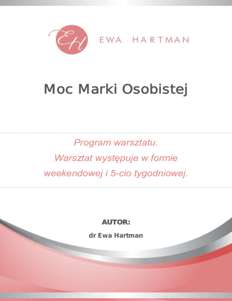 Moc Marki Osobistej Program warsztatu. Warsztat występuje w formie weekendowej i 5-cio tygodniowej. AUTOR: dr Ewa Hartman Moc Marki Osobistej Jedynym z bardzo skutecznych i trwałych sposobów budowania relacji z klientem jak i kontrahentem jest zdobycie zaufania opartego na profesjonalizmie. Drogą do wypracowania sobie pozycji profesjonalisty godnego zaufania jest silna marka osobista. A budowanie marki osobistej, z kolei to: samoświadomość, dbałość o rozwój, najwyższą jakość usług, oraz doskonalenie komunikacji werbalnej jak i niewerbalnej. Celem warsztatu jest pokazanie Ci czym jest marka osobista, jak się ją buduje i o nią dba, po to by realizowała swoje założenie – dostarczała poczucie wyjątkowości temu kto ją prezentuje i temu kto z niej korzysta. 1. GŁÓWNE KORZYŚCI Z POSIADANIA MARKI OSOBISTEJ: Większa skuteczność w budowaniu i utrzymywaniu relacji, w efekcie większa liczba pozyskiwanych referencji Realizowanie poczucia wyjątkowości zarówno przez oferenta marki jak i odbiorcę marki Większa odporność na wypalenie zawodowe Umiejętność budowania swojej pozycji eksperta 1 2. PLAN WARSZTATU: Szkolenie występuje w wersji weekendowej i w wersji 5-cio tygodniowej: 5 spotkań, raz w tygodniu, trwających 3h. I. Wprowadzenie. Czym jest marka osobista i dlaczego jej budowanie jest ważne Wartości, mocne strony, pasje Autentyczność, spójność, stałość II. Zaplanuj siebie. Dokąd zmierzasz, co chcesz osiągnąć na swoim stanowisku, w swojej strukturze, na swojej ścieżce kariery Misja, wizja, cele Twoja droga do mistrzostwa, czyli budowanie pozycji eksperta III. Kształtowanie marki osobistej - czyli operacjonalizacja. Komunikowanie pozycji eksperta za pomocą mediów Dbanie o relacje i ich profesjonalizacja Czym jest raport z klientem i dlaczego jest ważny Wizerunek jako kategoria poznawcza Sztuka słuchania IV. Zawodowo vs prywatnie. Przeciwdziałanie wypaleniu zawodowemu Sztuka łączenia pracy z życiem prywatnym Podstawowe techniki relaksacji i wizualizacji V. Profesjonalista a wykonawca. Pojęcie profesjonalizmu na różnych szczeblach kariery Marka osobista bez profesjonalizmu czy to możliwe Zbiór dobrych praktyk 2 3. PO UKOŃCZENIU WARSZTATU: I. Nabędziesz wiedzę o: koncepcji marki w odniesieniu do profesjonalisty wpływie specyfiki współczesnego rynku pracy na powstanie koncepcji marki osobistej wartościach i dążeniach leżących u podstaw koncepcji budowania marki osobistej mechanizmach psychologicznych związanych z pierwszym wrażeniem II. Nabędziesz umiejętności aktywnego słuchania tworzenia raportu z klientem rozpoznawania korzyści i zagrożeń wynikających z obecności w sieci przeciwdziałania wypaleniu zawodowemu III. Pogłębisz kompetencje związane z: troską o wizerunek własny i wizerunek firmy komunikowaniem siebie jako profesjonalisty oraz aktywnym dążeniem do podnoszenia jakości swojej pracy i podnoszenia kwalifikacji pogłębianiem integracji ze ścieżką kariery i wartościami w nią wpisanymi takimi jak poszanowanie dobra pracodawcy, kontrahentów i współpracowników 3 4. O PROWADZĄCEJ dr Ewa Hartman – trenerka z zakresu budowania marki osobistej, wystąpień publicznych oraz inteligencji międzykulturowej. Doktor Bournemouth University (Wielka Brytania). Pracą w obszarze rozwoju osobistego zajmuje się od pięciu lat, przy czym naucza od piętnastu. Prowadziła liczne wykłady, wystąpienia i prezentacje, zarówno w języku polskim i angielskim, w kraju jak i za granicą (w Wielkiej Brytanii, Belgii, Finlandii), między innymi na forum Komisji Europejskiej gdzie pracowała czy w Komitecie Regionów w Brukseli. Od 3 lat jest mentorem w Szkole Trenerów Rozwoju Osobistego we Wrocławiu gdzie uczy kompetencji miękkich. Jest też pomysłodawcą i kierownikiem studiów podyplomowych w Warszawie, oraz członkiem Stowarzyszenia Network PL zrzeszającego pracowników organizacji międzynarodowych (Bruksela). Prowadzi szkolenia: - dla biznesu m. innymi Procter&Gamble, Bioderma - w ramach festiwali rozwojowych m. innymi dla Akademii Kobiet Sukcesu czy dla Festiwalu Progressteron. - dla sektora administracji publicznej współpracując m. innymi z Krajową Szkołą Administracji Publicznej w Warszawie czy Stałym Przedstawicielstwem Polski przy Unii Europejskiej w Brukseli. Ponadto pisze do portalu InnPoland, oraz do magazynu Law Business Quality, gdzie porusza tematykę marki osobistej, wizerunku, mentalności globalnej i wystąpień publicznych. 4 Ceny warsztatów: - wersja weekendowa PREMIUM* 650 zł bądź 600 zł** - wersja weekendowa 550 zł bądź 500 zł - wersja 5- cio tygodniowa*** PREMIUM 650 zł bądź 600 zł - wersja 5- cio tygodniowa 550 zł bądź 500 zł * Wersja PEMIUM obejmuje jedną konsultację indywidualną na temat związany z Twoją marką osobistą. ** Niższa cena to cena dla powracających klientów, uczestników seminarium oraz subskrybentów. *** Warsztat trwa przez pięć tygodni. Przez te pięć tygodni spotykamy się raz w tygodniu na trzy godziny. Każde spotkanie kończy się tematem do przemyślenia lub przygotowania. Warsztat ten obywa się w Kawiarni VINDA – pokój VIP, ul. Zgierska 69 w Łodzi. Dane do przelewu: 41 1140 2004 0000 3602 7604 2028 W tytule przelewu proszę podać tytuł warsztatu oraz imię i nazwisko. KONTAKT: Ewa Hartman Tel: 600 811 360 Email: [email protected] 5