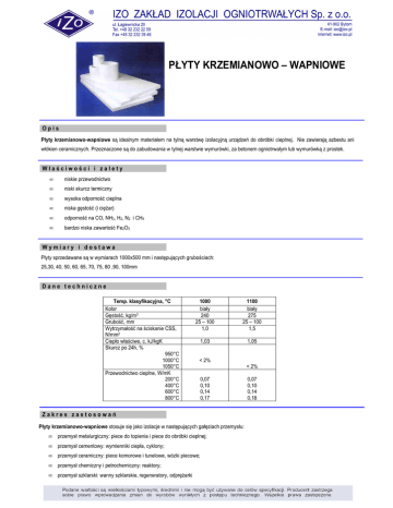 PŁYTY KRZEMIANOWO – WAPNIOWE Opis Płyty krzemianowo-wapniowe są idealnym materiałem na tylną warstwę izolacyjną urządzeń do obróbki cieplnej. Nie zawierają azbestu ani włókien ceramicznych. Przeznaczone są do zabudowania w tylnej warstwie wymurówki, za betonem ogniotrwałym lub wymurówką z prostek. Właściwości i zalety • niskie przewodnictwo • niski skurcz termiczny • wysoka odporność cieplna • niska gęstość (i cięŜar) • odporność na CO, NH3, H2, N2 i CH4 • bardzo niska zawartość Fe2O3 Wymiary i dostawa Płyty sprzedawane są w wymiarach 1000x500 mm i następujących grubościach: 25,30, 40, 50, 60, 65, 70, 75, 80 ,90, 100mm Dane techniczne Temp. klasyfikacyjna, °C Kolor Gęstość, kg/m3 Grubość, mm Wytrzymałość na ściskanie CSS, N/mm2 Ciepło właściwe, c, kJ/kgK Skurcz po 24h, % 950°C 1000°C 1050°C Przewodnictwo cieplne, W/mK 200°C 400°C 600°C 800°C 1000 biały 240 25 – 100 1,0 1100 biały 275 25 – 100 1,5 1,03 1,05 < 2% < 2% 0,07 0,10 0,14 0,17 Zakres zastosowań Płyty krzemianowo-wapniowe stosuje się jako izolacje w następujących gałęziach przemysłu: • przemysł metalurgiczny: piece do topienia i piece do obróbki cieplnej; • przemysł cementowy: wymienniki ciepła, cyklony; • przemysł ceramiczny: piece komorowe i tunelowe, wózki piecowe; • przemysł chemiczny i petrochemiczny: reaktory; • przemysł szklarski: wanny szklarskie, regeneratory, odpręŜarki 0,07 0,10 0,14 0,18