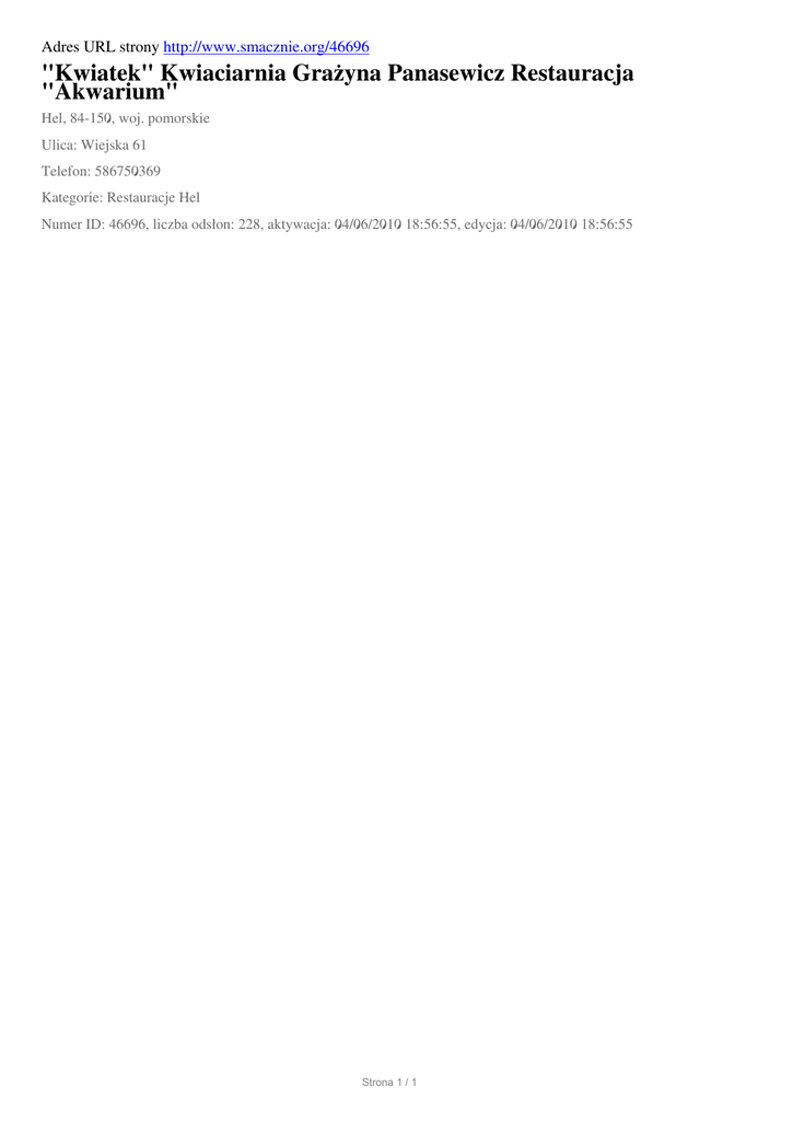 Adres URL strony http://www.smacznie.org/46696 "Kwiatek" Kwiaciarnia Grażyna Panasewicz Restauracja "Akwarium" Hel, 84-150, woj. pomorskie Ulica: Wiejska 61 Telefon: 586750369 Kategorie: Restauracje Hel Numer ID: 46696, liczba odsłon: 228, aktywacja: 04/06/2010 18:56:55, edycja: 04/06/2010 18:56:55 Strona 1 / 1