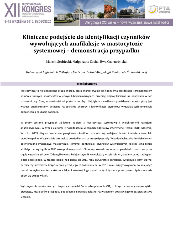 Kliniczne podejście do identyfikacji czynników wywołujących anafilaksje w mastocytozie systemowej – demonstracja przypadku Marcin Stobiecki, Małgorzata Sacha, Ewa Czarnobilska Uniwersytet Jagielloński Collegium Medicum, Zakład Alergologii Klinicznej i Środowiskowej Treść abstraktu Mastocytoza to niejednorodna grupa chorób, która charakteryzuje się nadmierną proliferacją i gromadzeniem komórek tucznych - mastocytów w jednym lub wielu narządach. Przebieg, objawy kliniczne jak i rokowanie w tym schorzeniu są różne, w zależności od postaci choroby. Najcięższym możliwym powikłaniem mastocytozy jest wstrząs anafilaktyczny. Wczesne rozpoznanie choroby i identyfikacja czynników wyzwalających umożliwia odpowiednią edukacje pacjenta. W pracy opisano przypadek 31-letniej kobiety z mastocytozą systemową i wielokrotnymi reakcjami anafilaktycznymi, w tym z ciężkimi, z hospitalizacją w ramach oddziałów intensywnej terapii (OIT) włącznie. W roku 2009 diagnozowana alergologicznie określono czynniki wyzwalające: lateks i niesterydowe leki przeciwzapalne. W wywiadzie bez reakcji po użądleniach przez osę i pszczołę. W badaniach szpiku i molekularnym potwierdzono systemową mastocytozę. Pomimo identyfikacji czynników wyzwalających kolejna silna rekcja anfilktyczna wystąpiła w 2011 roku podczas porodu. Chora wyprowadzona ze wstrząsu dziecko urodzone przez cięcie cesarskie zdrowe. Zidentyfikowano kolejny czynnik wywołujący – cefuroksym, podany przed zabiegiem cięcia cesarskiego. W trakcie opieki nad chorą od 2011 roku dwukrotnie określano, wykonując testy skórne, bezpieczny antybiotyk bezpośrednio przed jego zastosowaniem. W 2015 roku przygotowywana do kolejnego porodu – wykonano testy skórne z lekami anestezjologicznymi i antybiotykiem- poród przez cięcie cesarskie odbył się bez powikłań. Wykonywanie testów skórnych i wprowadzenie leków w zabezpieczeniu OIT, u chorych z mastocytozą o ciężkim przebiegu, może być w przypadku podejrzenia alergii IgE-zależnej rozwiązaniem poprawiającym bezpieczeństwo leczenia. .