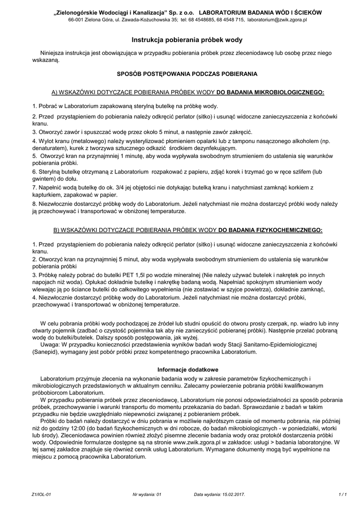 „Zielonogórskie Wodociągi i Kanalizacja” Sp. z o.o. LABORATORIUM BADANIA WÓD I ŚCIEKÓW 66-001 Zielona Góra, ul. Zawada-Kożuchowska 35; tel: 68 4548685, 68 4548 715, [email protected] Instrukcja pobierania próbek wody Niniejsza instrukcja jest obowiązująca w przypadku pobierania próbek przez zleceniodawcę lub osobę przez niego wskazaną. SPOSÓB POSTĘPOWANIA PODCZAS POBIERANIA A) WSKAZÓWKI DOTYCZĄCE POBIERANIA PRÓBEK WODY DO BADANIA MIKROBIOLOGICZNEGO: 1. Pobrać w Laboratorium zapakowaną sterylną butelkę na próbkę wody. 2. Przed przystąpieniem do pobierania należy odkręcić perlator (sitko) i usunąć widoczne zanieczyszczenia z końcówki kranu. 3. Otworzyć zawór i spuszczać wodę przez około 5 minut, a następnie zawór zakręcić. 4. Wylot kranu (metalowego) należy wysterylizować płomieniem opalarki lub z tamponu nasączonego alkoholem (np. denaturatem), kurek z tworzywa sztucznego odkazić środkiem dezynfekującym. 5. Otworzyć kran na przynajmniej 1 minutę, aby woda wypływała swobodnym strumieniem do ustalenia się warunków pobierania próbki. 6. Sterylną butelkę otrzymaną z Laboratorium rozpakować z papieru, zdjąć korek i trzymać go w ręce szlifem (lub gwintem) do dołu. 7. Napełnić wodą butelkę do ok. 3/4 jej objętości nie dotykając butelką kranu i natychmiast zamknąć korkiem z kapturkiem, zapakować w papier. 8. Niezwłocznie dostarczyć próbkę wody do Laboratorium. Jeżeli natychmiast nie można dostarczyć próbki wody należy ją przechowywać i transportować w obniżonej temperaturze. B) WSKAZÓWKI DOTYCZĄCE POBIERANIA PRÓBEK WODY DO BADANIA FIZYKOCHEMICZNEGO: 1. Przed przystąpieniem do pobierania należy odkręcić perlator (sitko) i usunąć widoczne zanieczyszczenia z końcówki kranu. 2. Otworzyć kran na przynajmniej 5 minut, aby woda wypływała swobodnym strumieniem do ustalenia się warunków pobierania próbki 3. Próbkę należy pobrać do butelki PET 1,5l po wodzie mineralnej (Nie należy używać butelek i nakrętek po innych napojach niż woda). Opłukać dokładnie butelkę i nakrętkę badaną wodą. Napełniać spokojnym strumieniem wody wlewając ją po ściance butelki do całkowitego wypełnienia (nie zostawiać w szyjce powietrza), dokładnie zamknąć, 4. Niezwłocznie dostarczyć próbkę wody do Laboratorium. Jeżeli natychmiast nie można dostarczyć próbki, przechowywać i transportować w obniżonej temperaturze. W celu pobrania próbki wody pochodzącej ze źródeł lub studni opuścić do otworu prosty czerpak, np. wiadro lub inny otwarty pojemnik (zadbać o czystość pojemnika tak aby nie zanieczyścić pobieranej próbki). Następnie przelać pobraną wodę do butelki/butelek. Dalszy sposób postępowania, jak wyżej. Uwaga: W przypadku konieczności przedstawienia wyników badań wody Stacji Sanitarno-Epidemiologicznej (Sanepid), wymagany jest pobór próbki przez kompetentnego pracownika Laboratorium. Informacje dodatkowe Laboratorium przyjmuje zlecenia na wykonanie badania wody w zakresie parametrów fizykochemicznych i mikrobiologicznych przedstawionych w aktualnym cenniku. Zalecamy powierzenie pobrania próbki kwalifkowanym próbobiorcom Laboratorium. W przypadku pobierania próbek przez zleceniodawcę, Laboratorium nie ponosi odpowiedzialności za sposób pobrania próbek, przechowywanie i warunki transportu do momentu przekazania do badań. Sprawozdanie z badań w takim przypadku nie będzie uwzględniało niepewności związanej z pobieraniem próbek. Próbki do badań należy dostarczyć w dniu pobrania w możliwie najkrótszym czasie od momentu pobrania, nie później niż do godziny 12:00 (do badań fizykochemicznych w dni robocze, do badań mikrobiologicznych - w poniedziałki, wtorki lub środy). Zleceniodawca powinien również złożyć pisemne zlecenie badania wody oraz protokół dostarczenia próbki wody. Odpowiednie formularze dostępne są na stronie www.zwik.zgora.pl w zakładce: usługi > badania laboratoryjne. W tej samej zakładce znajduje się również cennik usług Laboratorium. Wymagane dokumenty mogą być wypełnione na miejscu z pomocą pracownika Laboratorium. Z1/IOL-01 Nr wydania: 01 Data wydania: 15.02.2017. 1/1