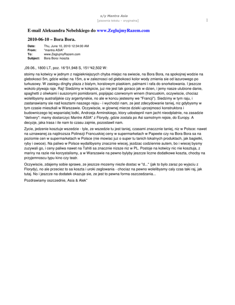 s/y Mantra Asia [pisownia tekstu – oryginalna] 1 E-mail Aleksandra Nebelskiego do www.ZeglujmyRazem.com 2010-06-10 – Bora Bora. Date: From: To: Subject: Thu, June 10, 2010 12:34:00 AM "mantra ASIA" www.ZeglujmyRazem.com Bora Bora i koszta „09.06., 1800 LT, poz. 16°31,948 S, 151°42,502 W: stoimy na kotwicy w jednym z najpiekniejszych chyba miejsc na swiecie, na Bora Bora, na spokojnej wodzie na glebokosci 5m, gdzie widac na 15m, a w zaleznosci od glebokosci kolor wody zmienia sie od lazurowego po turkusowy. W zasiegu dinghy plaza z bialym, koralowym piaskiem, palmami i rafa do snorkelowania. I jeszcze wokolo plywaja raje. Raj! Siedzimy w kokpicie, juz nie jest tak goraco jak w dzien, i jemy nasze ulubione danie, spaghetti z oliwkami i suszonymi pomidorami, popijajac czerwonym winem (francuskim, oczywiscie, chociaz wolelibysmy australijskie czy argentynskie, no ale w koncu jestesmy we "Francji"). Siedzimy w tym raju, i zastanawiamy sie nad kosztami naszego rejsu - i wychodzi nam, ze jest zdecydowanie taniej, niz gdybysmy w tym czasie mieszkali w Warszawie. Oczywiscie, w glownej mierze dzieki uprzejmosci konstruktora i budowniczego tej wspanialej lodki, Andrzeja Arminskiego, ktory udostepnil nam jacht nieodplatnie, na zasadzie "delivery": mamy dostarczyc Mantre ASIA" z Florydy, gdzie zostala po Asi samotnym rejsie, do Europy. A decyzje, jaka trasa i ile nam to czasu zajmie, pozostawil nam. Zycie, jedzenie kosztuje wszedzie - tyle, ze wszedzie tu jest taniej, czasami znaczznie taniej, niz w Polsce: nawet na uznawanej za najdrozsza Polinezji Francuskiej ceny w supermarketach w Papeete czy na Bora Bora sa na poziomie cen w supermarketach w Polsce (nie mowiac juz o super tu tanich lokalnych produktach, jak bagietki, ryby i owoce). Na paliwo w Polsce wydalibysmy znacznie wiecej, jezdzac codziennie autem, bo i wiecej bysmy zuzywali go, i ceny paliwa nawet na Tahiti sa znacznie nizsze niz w PL. Postoje na kotwicy nic nie kosztuja, z mariny na razie nie korzystalismy, a w Warszawie na pewno bylyby jeszcze liczne dodatkowe koszta, chocby na przyjemnoscu typu kino czy teatr. Oczywiscie, zdajemy sobie sprawe, ze jeszcze mozemy niezle dostac w "d..." (jak to bylo zaraz po wyjsciu z Florydy), no ale przeciez to sa koszta i uroki zeglowania - chociaz na pewno wolelibysmy caly czas taki raj, jak tutaj. No i jeszcze na dodatek okazuje sie, ze jest to pewna forma oszczedzania... Pozdrawiamy oszczednie, Asia & Alek” s/y Mantra Asia 2 http://www.worldatlas.com/webimage/countrys/oceania/bora.htm