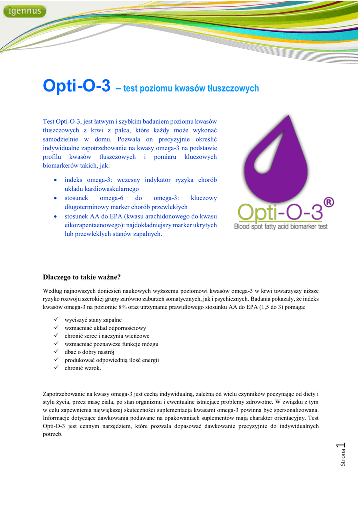 Opti-O-3 – test poziomu kwasów tłuszczowych Test Opti-O-3, jest łatwym i szybkim badaniem poziomu kwasów tłuszczowych z krwi z palca, które każdy może wykonać samodzielnie w domu. Pozwala on precyzyjnie określić indywidualne zapotrzebowanie na kwasy omega-3 na podstawie profilu kwasów tłuszczowych i pomiaru kluczowych biomarkerów takich, jak: indeks omega-3: wczesny indykator ryzyka chorób układu kardiowaskularnego stosunek omega-6 do omega-3: kluczowy długoterminowy marker chorób przewlekłych stosunek AA do EPA (kwasu arachidonowego do kwasu eikozapentaenowego): najdokładniejszy marker ukrytych lub przewlekłych stanów zapalnych. Dlaczego to takie ważne? Według najnowszych doniesień naukowych wyższemu poziomowi kwasów omega-3 w krwi towarzyszy niższe ryzyko rozwoju szerokiej grupy zarówno zaburzeń somatycznych, jak i psychicznych. Badania pokazały, że indeks kwasów omega-3 na poziomie 8% oraz utrzymanie prawidłowego stosunku AA do EPA (1,5 do 3) pomaga: wyciszyć stany zapalne wzmacniać układ odpornościowy chronić serce i naczynia wieńcowe wzmacniać poznawcze funkcje mózgu dbać o dobry nastrój produkować odpowiednią ilość energii chronić wzrok. Strona 1 Zapotrzebowanie na kwasy omega-3 jest cechą indywidualną, zależną od wielu czynników poczynając od diety i stylu życia, przez masę ciała, po stan organizmu i ewentualne istniejące problemy zdrowotne. W związku z tym w celu zapewnienia największej skuteczności suplementacja kwasami omega-3 powinna być spersonalizowana. Informacje dotyczące dawkowania podawane na opakowaniach suplementów mają charakter orientacyjny. Test Opti-O-3 jest cennym narzędziem, które pozwala dopasować dawkowanie precyzyjnie do indywidualnych potrzeb. Jak to działa. Test można wykonywać samemu w domu, bez konieczności odwiedzenia lekarza pierwszego kontaktu. Przy użyciu specjalnego ostrza jednorazowego użytku pobiera się kroplę krwi z palca a następnie przenosi ją na specjalną bibułę. Zestaw do pobrania krwi i bibuła oraz szczegółowa instrukcja dotycząca zabezpieczenia próbki stanowią integralną część naszego testu. Tak przygotowaną próbkę należy przesłać do naszego laboratorium. Wynik testu. W ciągu 21 dni zostaną ci przesłane wyniki testu wraz z informacjami dotyczącymi odpowiedniej dla ciebie suplementacji opracowanymi przez naszych specjalistów. Jeśli wykonanie testu zostało zarekomendowane przez twojego lekarza lub terapeuty, po utrzymaniu wyników umów się z nim w celu przedyskutowania rezultatów i ustalenia programu suplementacji. Monitorowanie efektu prowadzonej suplementacji dostarcza informacji czy spożywana przez ciebie dawka EPA jest zgodna z dynamiką twoich potrzeb. Z tego powodu rekomendujemy wykonanie testu Opti-O-3 ponownie po 6 miesiącach suplementacji. Pozwoli to sprawdzić postęp pozytywnych zmian w twoim organizmie i upewnić się, że twoje biomarkery są stabilne. Wyłączny dystrybutor produktów firmy Igennus w Polsce www.naturopatia-sanatum.pl [email protected] Strona 2 tel. 507 170 094