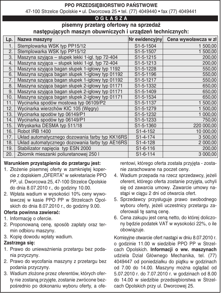 PPO PRZEDSIĘBIORSTWO PAŃSTWOWE 47-100 Strzelce Opolskie • ul. Dworcowa 25 • tel. (77) 4049440 • fax (77) 4049441 OGŁASZA pisemny przetarg ofertowy na sprzedaż następujących maszyn obuwniczych i urządzeń technicznych: Lp. 1. 2. 3. 4. 5. 6. 7. 8. 9. 10. 11. 12. 13. 14. 15. 16. 17. 18. 19. 20. Nazwa maszyny Nr ewidencyjny Cena wywoławcza w zł Stemplowarka WSK typ PP15/12 S1-5-1504 1 500‚00 Stemplowarka WSK typ PP15/12 S1-5-1507 1 500‚00 Maszyna szyjąca – słupek lekki 1-igł. typ 72-404 S1-5-1215 200‚00 Maszyna szyjąca – słupek lekki 1-igł. typ 72-404 S1-5-1213 200‚00 Maszyna szyjąca bagan słupek 1-igłowy typ 1192 S1-5-1228 550‚00 Maszyna szyjąca bagan słupek 1-igłowy typ 01192 S1-5-1196 550‚00 Maszyna szyjąca bagan słupek 1-igłowy typ 01192 S1-5-1217 550‚00 Maszyna szyjąca bagan słupek 2-igłowy typ 01171 S1-5-1332 650‚00 Maszyna szyjąca bagan słupek 2-igłowy typ 01171 S1-5-1409 650‚00 Maszyna szyjąca bagan słupek 2-igłowy typ 01171 S1-5-1534 650‚00 Wycinarka spodów mostowa typ 06109/P2 S1-5-1137 1 500‚00 Wycinarka wierzchów KIC 105 (Węgry) S1-5-1279 1 500‚00 Wycinarka spodów typ 06149/P1 S1-5-1232 1 000‚00 Wycinarka spodów typ 06149/P1 S1-5-1233 750‚00 Wtryskarka DESMA typ 511/18 S1-5-1360 220 000‚00 Robot IRB 1400 S1-4-152 10 000‚00 Układ automatycznego dozowania farby typ KK16RS S1-4-174 3 500‚00 Układ automatycznego dozowania farby typ AE16RS S1-4-128 2 000‚00 Stabilizator napięcia typ ESN 2000 S1-6-116 200‚00 Zbiornik mieszanki poliuretanowej 250 l S1-6-114 3 000‚00 Warunkiem przystąpienia do przetargu jest: 1. Złożenie pisemnej oferty w zamkniętej kopercie z dopiskiem „OFERTA” w sekretariacie PPO PP, ul. Dworcowa 25‚ 47-100 Strzelce Opolskie do dnia 8.07.2010 r.‚ do godziny 10.00. 2. Wpłata wadium w wysokości 10% ceny wywoławczej w kasie PPO PP w Strzelcach Opolskich do dnia 8.07.2010 r.‚ do godziny 9.00. Oferta powinna zawierać: 1. Informację o ofercie. 2. Proponowaną cenę‚ sposób zapłaty oraz termin odbioru maszyny. 3. Kopię dowodu wpłaty wadium. Zastrzega się: 1. Prawo do unieważnienia przetargu bez podania przyczyny. 2. Prawo do wycofania maszyny z przetargu bez podania przyczyny. 3. Wadium złożone przez oferentów‚ których oferty nie zostaną przyjęte‚ zostanie zwrócone bezpośrednio po dokonaniu wyboru oferty‚ a ofe- rentowi‚ którego oferta została przyjęta - zostanie zarachowane na poczet ceny. 4. Wadium przepada na rzecz sprzedawcy‚ jeżeli oferent‚ którego oferta zostanie przyjęta‚ uchyli się od zawarcia umowy. Zawarcie umowy nastąpi w ciągu 2 dni od otwarcia ofert. 5. Sprzedawcy przysługuje prawo swobodnego wyboru oferty‚ jeżeli uczestnicy przetargu zaoferowali tę samą cenę. 6. Cena zakupu jest ceną netto‚ do której doliczony będzie podatek VAT w wysokości 22%, o ile obowiązuje. Komisyjne otwarcie ofert nastąpi w dniu 8.07.2010 r. o godzinie 11.00 w siedzibie PPO PP w Strzelcach Opolskich. Informacji o ww. maszynach udziela Dział Głównego Mechanika, tel. (77) 4049447 od poniedziałku do piątku w godzinach od 7.00 do 14.00. Maszyny można oglądać od 5.07.2010 r. do 7.07.2010 r. w godzinach od 8.00 do 14.00 w siedzibie przedsiębiorstwa w Strzelcach Opolskich przy ul. Dworcowej 25.