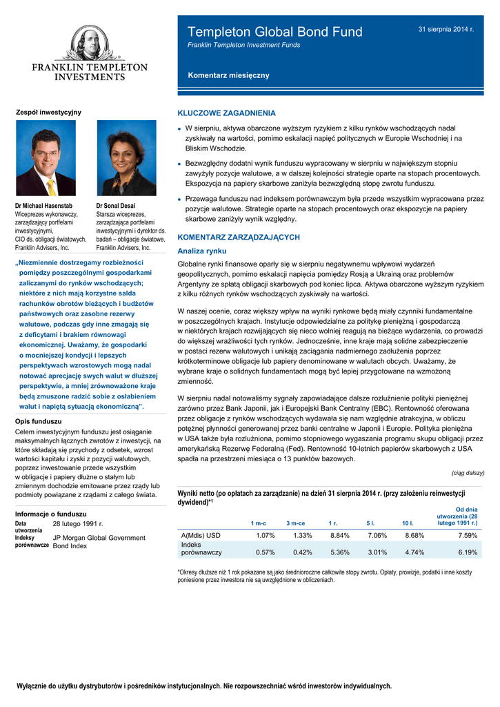 31 sierpnia 2014 r. Templeton Global Bond Fund Franklin Templeton Investment Funds Komentarz miesięczny Zespół inwestycyjny KLUCZOWE ZAGADNIENIA • W sierpniu, aktywa obarczone wyższym ryzykiem z kilku rynków wschodzących nadal zyskiwały na wartości, pomimo eskalacji napięć politycznych w Europie Wschodniej i na Bliskim Wschodzie. • Bezwzględny dodatni wynik funduszu wypracowany w sierpniu w największym stopniu zawyżyły pozycje walutowe, a w dalszej kolejności strategie oparte na stopach procentowych. Ekspozycja na papiery skarbowe zaniżyła bezwzględną stopę zwrotu funduszu. Dr Michael Hasenstab Wiceprezes wykonawczy, zarządzający portfelami inwestycyjnymi, CIO ds. obligacji światowych, Franklin Advisers, Inc. Dr Sonal Desai Starsza wiceprezes, zarządzająca portfelami inwestycyjnymi i dyrektor ds. badań – obligacje światowe, Franklin Advisers, Inc. „Niezmiennie dostrzegamy rozbieżności pomiędzy poszczególnymi gospodarkami zaliczanymi do rynków wschodzących; niektóre z nich mają korzystne salda rachunków obrotów bieżących i budżetów państwowych oraz zasobne rezerwy walutowe, podczas gdy inne zmagają się z deficytami i brakiem równowagi ekonomicznej. Uważamy, że gospodarki o mocniejszej kondycji i lepszych perspektywach wzrostowych mogą nadal notować aprecjację swych walut w dłuższej perspektywie, a mniej zrównoważone kraje będą zmuszone radzić sobie z osłabieniem walut i napiętą sytuacją ekonomiczną”. Opis funduszu Celem inwestycyjnym funduszu jest osiąganie maksymalnych łącznych zwrotów z inwestycji, na które składają się przychody z odsetek, wzrost wartości kapitału i zyski z pozycji walutowych, poprzez inwestowanie przede wszystkim w obligacje i papiery dłużne o stałym lub zmiennym dochodzie emitowane przez rządy lub podmioty powiązane z rządami z całego świata. • Przewaga funduszu nad indeksem porównawczym była przede wszystkim wypracowana przez pozycje walutowe. Strategie oparte na stopach procentowych oraz ekspozycje na papiery skarbowe zaniżyły wynik względny. KOMENTARZ ZARZĄDZAJĄCYCH Analiza rynku Globalne rynki finansowe oparły się w sierpniu negatywnemu wpływowi wydarzeń geopolitycznych, pomimo eskalacji napięcia pomiędzy Rosją a Ukrainą oraz problemów Argentyny ze spłatą obligacji skarbowych pod koniec lipca. Aktywa obarczone wyższym ryzykiem z kilku różnych rynków wschodzących zyskiwały na wartości. W naszej ocenie, coraz większy wpływ na wyniki rynkowe będą miały czynniki fundamentalne w poszczególnych krajach. Instytucje odpowiedzialne za politykę pieniężną i gospodarczą w niektórych krajach rozwijających się nieco wolniej reagują na bieżące wydarzenia, co prowadzi do większej wrażliwości tych rynków. Jednocześnie, inne kraje mają solidne zabezpieczenie w postaci rezerw walutowych i unikają zaciągania nadmiernego zadłużenia poprzez krótkoterminowe obligacje lub papiery denominowane w walutach obcych. Uważamy, że wybrane kraje o solidnych fundamentach mogą być lepiej przygotowane na wzmożoną zmienność. W sierpniu nadal notowaliśmy sygnały zapowiadające dalsze rozluźnienie polityki pieniężnej zarówno przez Bank Japonii, jak i Europejski Bank Centralny (EBC). Rentowność oferowana przez obligacje z rynków wschodzących wydawała się nam względnie atrakcyjna, w obliczu potężnej płynności generowanej przez banki centralne w Japonii i Europie. Polityka pieniężna w USA także była rozluźniona, pomimo stopniowego wygaszania programu skupu obligacji przez amerykańską Rezerwę Federalną (Fed). Rentowność 10-letnich papierów skarbowych z USA spadła na przestrzeni miesiąca o 13 punktów bazowych. (ciąg dalszy) Wyniki netto (po opłatach za zarządzanie) na dzień 31 sierpnia 2014 r. (przy założeniu reinwestycji dywidend)*1 Informacje o funduszu Data 28 lutego 1991 r. utworzenia Indeksy JP Morgan Global Government porównawcze Bond Index 1 m-c A(Mdis) USD Indeks porównawczy 3 m-ce 1 r. 5 l. 10 l. Od dnia utworzenia (28 lutego 1991 r.) 1.07% 1.33% 8.84% 7.06% 8.68% 7.59% 0.57% 0.42% 5.36% 3.01% 4.74% 6.19% *Okresy dłuższe niż 1 rok pokazane są jako średnioroczne całkowite stopy zwrotu. Opłaty, prowizje, podatki i inne koszty poniesione przez inwestora nie są uwzględnione w obliczeniach. Wyłącznie do użytku dystrybutorów i pośredników instytucjonalnych. Nie rozpowszechniać wśród inwestorów indywidualnych. Templeton Global Bond Fund Analiza wyników Bezwzględny dodatni wynik funduszu wypracowany w sierpniu w największym stopniu zawyżyły pozycje walutowe, a w dalszej kolejności strategie oparte na stopach procentowych. Ekspozycja na papiery skarbowe zaniżyła bezwzględną stopę zwrotu funduszu. Przewaga funduszu nad indeksem porównawczym była przede wszystkim wypracowana przez pozycje walutowe. Strategie oparte na stopach procentowych oraz ekspozycje na papiery skarbowe zaniżyły wynik względny. Jeżeli chodzi o ekspozycje walutowe, bezwzględną stopę zwrotu funduszu zawyżyły pozycje walut azjatyckich (poza jenem) i amerykańskich, jak również ujemna ekspozycja netto na japońskiego jena. Ujemna ekspozycja na jena w stosunku do euro miała korzystny wpływ na wynik bezwzględny, natomiast wpływ ekspozycji na kursy walut peryferyjnych krajów europejskich do euro był neutralny. Niedoważone pozycje euro i jena w portfelu funduszu znacząco zawyżyły przewagę funduszu nad indeksem. Korzystny wpływ na wynik względny miały także przeważone pozycje walut azjatyckich (poza jenem) i amerykańskich, podobnie jak przeważona ekspozycja na kursy walut peryferyjnych krajów europejskich do euro. Fundusz utrzymał generalnie defensywne podejście do ekspozycji na wahania stóp procentowych na rynkach rozwiniętych i wschodzących. Miesięczną bezwzględną stopę zwrotu zawyżyły niektóre ekspozycje na długoterminowe papiery z Europy i Ameryki Łacińskiej. Niedoważenie eks