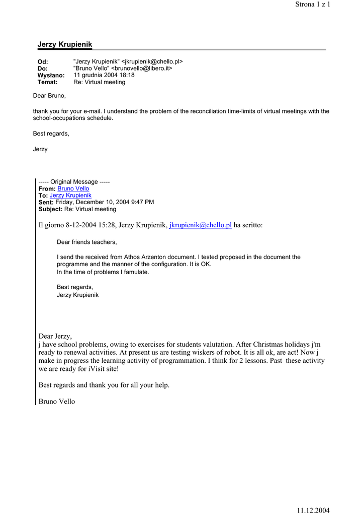 Strona 1 z 1 Jerzy Krupienik Od: Do: Wysłano: Temat: "Jerzy Krupienik" <[email protected]> "Bruno Vello" <[email protected]> 11 grudnia 2004 18:18 Re: Virtual meeting Dear Bruno, thank you for your e-mail. I understand the problem of the reconciliation time-limits of virtual meetings with the school-occupations schedule. Best regards, Jerzy ----- Original Message ----From: Bruno Vello To: Jerzy Krupienik Sent: Friday, December 10, 2004 9:47 PM Subject: Re: Virtual meeting Il giorno 8-12-2004 15:28, Jerzy Krupienik, [email protected] ha scritto: Dear friends teachers, I send the received from Athos Arzenton document. I tested proposed in the document the programme and the manner of the configuration. It is OK. In the time of problems I famulate. Best regards, Jerzy Krupienik Dear Jerzy, j have school problems, owing to exercises for students valutation. After Christmas holidays j'm ready to renewal activities. At present us are testing wiskers of robot. It is all ok, are act! Now j make in progress the learning activity of programmation. I think for 2 lessons. Past these activity we are ready for iVisit site! Best regards and thank you for all your help. Bruno Vello 11.12.2004