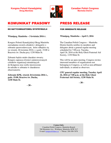 Kongres Polonii Kanadyjskiej Canadian Polish Congress Okręg Manitoba Manitoba District KOMUNIKAT PRASOWY PRESS RELEASE DO NATYCHMIASTOWEJ DYSTRYBUCJI FOR IMMEDIATE RELEASE Winnipeg, Manitoba – 3 kwietnia 2016 r. Winnipeg, Manitoba – April 3, 2016 Kongres Polonii Kanadyjskiej Okręg Manitoba zawiadamia swoich członków i delegatów o zebraniu sprawozdawczym, które odbędzie się we wtorek, 26 kwietnia 2016 r. o godz. 19.00 w Bractwie św. Ducha przy 1230 Main St. The Canadian Polish Congress – Manitoba District hereby notifies its members and delegates about a general regular meeting scheduled for 7:00 p.m. Tuesday, April 26, 2016 at the Holy Ghost Fraternal Aid Society, 1230 Main St. Zebranie będzie miało charakter otwarty. Kongres zaprasza również zainteresowanych członków organizacji nienależących do Kongresu oraz osoby niezrzeszone do udziału w zebraniu w charakterze obserwatorów. Zebranie KPK, wtorek 26 kwietnia 2016 r., godz. 19.00, Bractwo św. Ducha, 1230 Main St. This will be an open meeting. Congress invites interested members of organizations not belonging to Congress, as well as non-affiliated individuals, to attend as observers. CPC general regular meeting, Tuesday April 26, 2016 at 7:00 p.m. at the Holy Ghost Fraternal Aid Society, 1230 Main St. - 30 - 30 - Contact Info: Canadian Polish Congress, Manitoba Branch 768 Mountain Ave., Winnipeg, Manitoba, R2W 1L7 E-mail: [email protected] --- Phone: 204-589-7878
