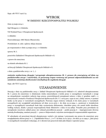 Sygn. akt VII U 2427/13 WYROK W IMIENIU RZECZYPOSPOLITEJ POLSKIEJ Dnia 15 maja 2014 r. Sąd Okręgowy w Gdańsku VII Wydział Pracy i Ubezpieczeń Społecznych w składzie: Przewodniczący: SSO Maria Ołtarzewska Protokolant: st. sekr. sądowy Alicja Jarzyna po rozpoznaniu w dniu 15 maja 2014 r. w Gdańsku sprawy M. I. przeciwko Zakładowi Ubezpieczeń Społecznych Oddział w G. o prawo do emerytury na skutek odwołania M. I. od decyzji Zakładu Ubezpieczeń Społecznych Oddział w G. z dnia 4 października 2013 r. nr (...) zmienia zaskarżoną decyzję i przyznaje ubezpieczonemu M. I. prawo do emerytury od dnia 24 października 2013r. i stwierdza, że pozwany organ rentowy nie ponosi odpowiedzialności za nie ustalenie ostatniej okoliczności niezbędnej do wydania decyzji. Sygn. akt VII U 2427/13 UZASADNIENIE Decyzją z dnia 04 października 2013 r. Zakład Ubezpieczeń Społecznych Oddział w G. odmówił ubezpieczonemu M. I. prawa do emerytury w obniżonym wieku emerytalnym z tytułu pracy w szczególnym warunkach z uwagi na niespełnienie warunków nabycia tego prawa, przewidzianych przepisami ustawy z dnia 17 grudnia 1998 r. o emeryturach i rentach z Funduszu Ubezpieczeń Społecznych (Dz. U. z 2013 poz. 1440 ze zm.), dalej: ustawa, w postaci braku 15 lat pracy w warunkach szczególnych. Pozwany organ rentowy wskazał, iż do stażu pracy w warunkach szczególnych nie uwzględnił zatrudnienia od dnia 10.01.1975 r. do dnia 31.12.1994 r., ponieważ w świadectwie pracy w szczególnych warunkach brak daty wystawienia dokumentu, charakter pracy nie został ściśle określony według wykazu, działu i pozycji rozporządzenia Rady Ministrów z dnia 07.02.1983r. Ponadto przy powołaniu na zarządzenie resortowe zakład pracy nie wskazał prawidłowej pozycji – podał pozycję 6 – impregnowanie drewna metodą dwufuzujną, zamiast pozycji 7 – praca w klejowniach z użyciem zawierających rozpuszczalniki organiczne. W odwołaniu od powyższej decyzji ubezpieczony wniósł o jej zmianę i przyznanie mu prawa do emerytury przy uwzględnieniu okresu pracy w (...) Spółdzielni Pracy (...) w T. od dnia 10.01.1975 r. do dnia 31.12.1994 r., jako pracy w szczególnych warunkach wskazując, iż w okresie tym pracował stale jako klejarz i operator prasy. W odpowiedzi na odwołanie pozwany organ rentowy wniósł o jego oddalenie, podtrzymując argumentację zaprezentowaną w zaskarżonej decyzji. Sąd ustalił następujący stan faktyczny: Ubezpieczony M. I. urodził się dnia (...) W dniu 26 września 2013 r. złożył w Zakładzie Ubezpieczeń Społecznych Oddział w G. wniosek o emeryturę w obniżonym wieku emerytalnym z tytułu pracy w szczególnym warunkach. Ubezpieczony nie jest członkiem Otwartego Funduszu Emerytalnego. Wymagany wiek 60 lat ubezpieczony ukończył w dniu 24 października 2013 r. W toku postępowania przed organem rentowym ubezpieczony udowodnił według stanu na dzień 01 stycznia 1999 r. staż sumaryczny 28 lat, 8 miesięcy i 3 dni okresów składkowych i nieskładkowych. Zaskarżoną w sprawie decyzją z dnia 04 października 2013 r. pozwany organ rentowy odmówił ubezpieczonemu prawa do emerytury w obniżonym wieku emerytalnym z tytułu pracy w szczególnym warunkach z uwagi na niespełnienie warunków nabycia tego prawa, tj. wobec nie udowodnienia 15–letniego okresu pracy w szczególnych warunkach. Od dnia 20 stycznia 1972r. ubezpieczony został zatrudniony w (...) Spółdzielni Pracy (...) w T. na stanowisku pracownika fizycznego w transporcie wewnętrznym. Następnie od dnia 10 stycznia 1975r. powierzono mu stanowisko klejarza, zaś od dnia 01 kwietnia 1982r. pracował jako operator urządzeń do okleinowania. Na tym stanowisku pracował do końca zatrudnienia w Spółdzielni (...) tj. do dnia 31 grudnia 1994r. Jako klejarz i operator prasy do okleinowania ubezpieczony rozprowadzał klej na powierzchni płyt meblowych i obsługiwał prasę, która dociskała okleinę do powierzchni płyty z warstwą kleju. Pracę tę ubezpieczony wykonywał stale i w pełnym wymiarze czasu pracy. Jako klejarz i operator prasy ubezpieczony przepracował łącznie 19 lat 11 miesięcy i 22 dni. Powyższy stan faktyczny Sąd ustalił na podstawie akt rentowych ubezpieczonego, jego akt osobowych a także zeznań świadków: K. P. i H. Ż.. Sąd dał wiarę zeznaniom świadków, bowiem ich zeznania są spójne i logiczne, pracowali oni w spornym okresie z ubezpieczonym, a nadto zeznania te znajdują potwierdzenie w dokumentacji osobowej ubezpieczonego. W aktach osobowych bowiem znajduje się pismo z dnia 27 stycznia 1975r., w którym podano, iż od dnia 10 stycznia 1975r. ubezpieczonemu proponuje się stanowisko klejarza i zaszeregowuje go do IV kat. zaszeregowania osobistego tj. 9zł za godzinę. Natomiast w angażu z 27 maja 1982r. przyznano ubezpieczonemu – jako operatorowi urządzeń do okleinowania – 8 kategorię zaszeregowania od dnia 01 kwietnia 1982r. Sąd zważył, co następuje: W świetle poczynionych ustaleń faktycznych odwołanie ubezpieczonego jest zasadne i z tego tytułu zasługuje na uwzględnienie. Ogólne zasady nabywania prawa do emerytury dla ubezpieczonych urodzonych po 1948 r. zostały uregulowane w treści art. 184 ustawy z dnia 17 grudnia 1998 r. o emeryturach i rentach z Funduszu Ubezpieczeń Społecznych (Dz. U. z 2013 poz. 1440 ze zm.), dalej: ustawa, zgodnie z którym ubezpieczonym urodzonym po dniu 31 grudnia 1948 r. przysługuje emerytura po osiągnięciu wieku przewidzianego w art. 32, 33, 39 i 40, którzy spełniają łącznie następujące warunki: 1) legitymują się okresem zatrudnienia w szczególnych warunkach lub w szczególnym charakterze wymaganym w przepisach dotychczasowych do nabycia prawa do emerytury w wieku niższym niż: 65 lat dla mężczyzn, 60 lat dla kobiet, 2) mają okres składkowy i nieskładkowy wynoszący co najmniej: 25 lat dla mężczyzn, 20 dla kobiet, 3 ) nie przystąpili do otwartego funduszu emerytalnego albo zło