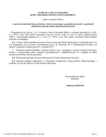 UCHWAŁA NR 417/VII/26/2016 RADY MIEJSKIEJ KONSTANCIN-JEZIORNA z dnia 14 grudnia 2016 r. w sprawie zniesienia formy ochrony z drzewa uznanego za pomnik przyrody w granicach administracyjnych Gminy Konstancin-Jeziorna Na podstawie art. 44 ust. 3, 3a i 4 ustawy z dnia 16 kwietnia 2004 r. o ochronie przyrody (t.j. w Dz. U. z 2015 r. poz. 1651z późn. zmianami ) oraz art. 18 ust. 2 pkt 15 i art. 41 ustawy z dnia 8 marca 1990 r. o samorządzie gminnym (t. j. w Dz. U. z 2016 r. poz. 446 z późn. zmianami) Rada Miejska uchwala, co następuje: § 1. 1. Znosi status pomnika przyrody brzozy omszonej (Betula pubescens) o obwodzie pnia 214 cm znajdującej się na terenie nieruchomości przy ul. Batorego 20 w Konstancinie-Jeziornie, na działce o numerze ewidencyjnym 91 z obrębu 0313. 2. Zniesienie statusu pomnika, o którym mowa w ust. 1 następuje z uwagi na utratę żywotności drzewa i bezpowrotną utratę wartości przyrodniczych i krajobrazowych, ze względu na które ustanowiono formę ochrony przyrody. § 2. Wykonanie uchwały powierza Burmistrzowi Gminy Konstancin-Jeziorna. § 3. Uchwała podlega ogłoszeniu w Dzienniku Urzędowym Województwa Mazowieckiego i wchodzi w życie po upływie 14 dni od dnia ogłoszenia. Przewodniczący Rady Miejskiej Andrzej Cieślawski Id: 66E07375-0F89-413B-B8BB-4456B3EE0621. Uchwalony Strona 1 Uzasadnienie do uchwały Nr 417/VII/26/2016 z dnia 14 grudnia 2016 roku w sprawie zniesienia formy ochrony z drzewa uznanego za pomnik przyrody w granicach administracyjnych Gminy Konstancin-Jeziorna Zgodnie z art. 44 ust. 4 ustawy z dnia 16 kwietnia 2004 r. o ochronie przyrody zniesienie formy ochrony przyrody następuje w razie utraty wartości przyrodniczych i krajobrazowych, ze względu na które ustanowiono formę ochrony przyrody. Przedmiotowa brzoza utraciła bezpowrotnie walory przyrodnicze ze względu na obumarcie i samoistne wyłamanie jednego z głównych konarów w koronie. Obecnie górna część przewodnika oraz konary szczątkowej korony pokryte są owocnikami grzybów rozkładających drewno. W pniu, na wysokości ok. 8 -10 m znajduje się rozległa dziupla. Na drzewie nie stwierdzono obecności organizmów chronionych. Drzewo zlokalizowane jest na zabudowanej działce stanowiącej własność osób prywatnych, w leśnym ogrodzie, w sąsiedztwie zabytkowej willi „Julia”. Ochronę drzewa, poprzez uznanie go za pomnik przyrody, wprowadzono orzeczeniem Wojewody Warszawskiego nr 1042 z dnia 27-12-1990 r. sygn. OSL.X-7140/38/90 ogłoszonym w Dzienniku Urzędowym Województwa Warszawskiego. Drzewo figuruje w Rejestrze Pomników Przyrody Wojewody Mazowieckiego pod nr 1170. Pomniki przyrody podlegają szczególnej ochronie prawnej. Uzyskanie zezwolenia na usunięcie drzewa objętego ochroną w formie pomnika przyrody wiąże się z koniecznością zniesienia tej formy ochrony. Zgodnie z art. 44 ust. 3 i 3a ustawy z dnia 16 kwietnia 2004 r. o ochronie przyrody zniesienie statusu pomnika przyrody dokonuje Rada Miejska w drodze uchwały, która wymaga uzgodnienia z właściwym Regionalnym Dyrektorem Ochrony Środowiska. Regionalny Dyrektor Ochrony Środowiska nie przedstawił stanowiska w terminie miesiąca od otrzymania projektu uchwały, w związku z tym, zgodnie z art. 3b ustawy z dnia 16 kwietnia 2004 r. o ochronie przyrody, projekt uchwały uważa się za uzgodniony. W świetle powyższego podjęcie przedmiotowej uchwały jest zasadne. Id: 66E07375-0F89-413B-B8BB-4456B3EE0621. Uchwalony Strona 1