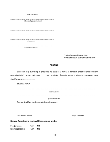 .............................................................................. Imię i nazwisko .............................................................................. Adres stałego zamieszkania .............................................................................. .............................................................................. .............................................................................. .............................................................................. Adres e-mail .............................................................................. Telefon kontaktowy Prodziekan ds. Studenckich Wydziału Nauk Ekonomicznych UW PODANIE Zwracam się z prośbą o przyjęcie na studia w WNE w ramach przeniesienia/studiów równoległych*. Mam zaliczony………….rok studiów. Średnia ocen z dotychczasowego toku studiów wynosi……………….. Studiuję na/w: ............................................................................................................................................. (nazwa uczelni) ............................................................................................................................................. (nazwa Wydziału) Forma studiów: stacjonarne/niestacjonarne*. ................................................... ................................................... Data złożenia podania Podpis kandydata Decyzja Prodziekana o zakwalifikowaniu na studia: Stacjonarne: Niestacjonarne: TAK TAK NIE NIE 1/3 ZAŁĄCZNIK Proszę wypełnid poniższe tabele. Tabela 1. Przedmioty programu Wydziału Nauk Ekonomicznych UW Lp. Nazwa przedmiotu Wydziału macierzystego Forma zajęd Liczba godzin Semestr 1. Podstawy informatyki konw. 30 I 2. Rozszerzenie ekonomii: Historia Ekonomii Historia Gospodarcza Demografia konw. 60 I 3. Wstęp do ekonomii wykł. 30 I 4. Mikroekonomia cz. I konw. 30 I 5. Algebra liniowa 6. Analiza matematyczna wykł. dwicz. wykł. dwicz. 30 60 30 30 7. Prawo z elementami prawa handlowego wykł. 60 8. Makroekonomia I 9. Mikroekonomia cz. II wykł. dwicz. wykł. dwicz. wykł. dwicz. wykł. dwicz. wykł. dwicz. wykł. dwicz. wykł. dwicz. wykł. dwicz. wykł. dwicz. wykł. dwicz. 30 30 30 30 30 30 30 30 30 30 30 30 30 30 30 30 30 30 30 30 18. Rachunkowośd konw. 30 V 19. Zarządzanie wykł. 60 VI 10. Makroekonomia II 11. Mikroekonomia cz. III 12. Rachunek prawdopodobieostwa 13. Finanse 14. Makroekonomia gospodarki otwartej 15. Ekonomia polityczna 16. Statystyka matematyczna 17. Ekonometria I I i II II II II III III III III IV IV IV V ** - wypełnia WNE UW 2/3 Forma zajęd Liczba godzin Semestr Punkty ECTS Ocena koocowa Różnica prog.** (TAK/NIE) Tabela 2. Inne przedmioty zrealizowane na Wydziale macierzystym (w tym matematyczne) Lp. Nazwa przedmiotu Forma zajęd 1. 2. 3. 4. 5. 6. 7. 8. 9. 10. ** - wypełnia WNE UW 3/3 Liczba godzin Semestr Punkty ECTS Ocena koocowa Zaliczone ** (TAK/NIE)