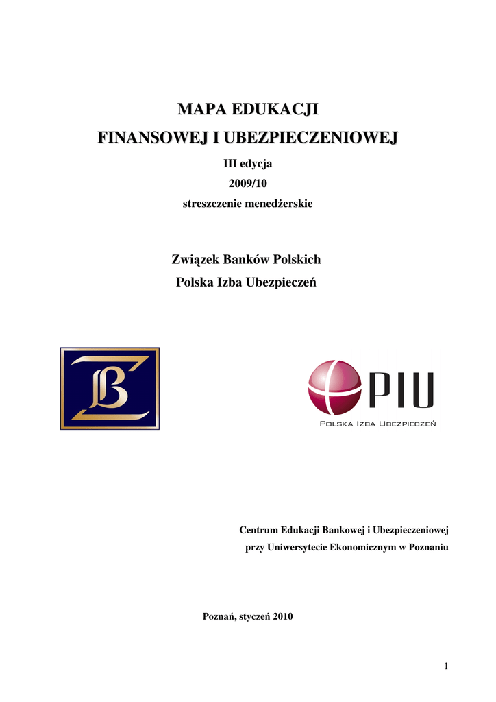 MAPA EDUKACJI FINANSOWEJ I UBEZPIECZENIOWEJ III edycja 2009/10 streszczenie menedżerskie Związek Banków Polskich Polska Izba Ubezpieczeń Centrum Edukacji Bankowej i Ubezpieczeniowej przy Uniwersytecie Ekonomicznym w Poznaniu Poznań, styczeń 2010 1 Mapa edukacji finansowej i ubezpieczeniowej 2009/10 streszczenie menedżerskie 1. Zakres przedmiotowy badania Badaniem objęto działania edukacji ekonomicznej skierowane do uczniów szkół podstawowych, gimnazjalnych, ponadgimnazjalnych i studentów: 1.1 Przedmiot „Podstawy przedsiębiorczości”, obowiązkowy w szkołach ponadgimnazjalnych (podstawę programową, programy nauczania i podręczniki do tego przedmiotu oraz zarys najważniejszych zmian spowodowanych reformą programową) 1.2 Przedsięwzięcia edukacji ekonomicznej skierowane do uczniów szkół gimnazjalnych i ponadgimnazjalnych, realizowane przez instytucje publiczne i organizacje pozarządowe: • 2 olimpiady przedmiotowe; • 18 programów edukacji ekonomicznej i 1 akcję społeczną • 17 konkursów i gier interaktywnych. 1.3 Publikacje edukacyjne z zakresu finansów i ubezpieczeń skierowane do uczniów szkół gimnazjalnych i ponadgimnazjalnych, wydawane przez instytucje publiczne i organizacje pozarządowe (m. in. Narodowy Bank Polski, Fundację Edukacji Rynku Kapitałowego, Europejski Bank Centralny): 1.4 Praktyki dla uczniów szkół gimnazjalnych, ponadgimnazjalnych i studentów 1.5 Przedsięwzięcia edukacji ekonomicznej dla studentów i absolwentów szkół wyższych, realizowane przez instytucje publiczne i organizacje pozarządowe: • 15 konkursów na najlepszą pracę naukową; • 11 konkursów i gier interaktywnych; • 2 programy edukacyjne; • 2 programy praktyk. 1.6 Przedsięwzięcia edukacji ekonomicznej i programy szkoleniowe skierowane do szkół i nauczycieli: • 3 programy edukacyjne • 7 szkoleń 1.7 Pozostałe przedsięwzięcia edukacji ekonomicznej: • 10 konkursów dla dziennikarzy, organizacji pozarządowych i instytucji szkoleniowych; • 10 szkoleń i konferencji o tematyce ekonomicznej; • 7 portali edukacji ekonomicznej; 2 • 2 programy stypendialne. Mapa edukacji finansowej i ubezpieczeniowej w Polsce przedstawia ogólnopolskie działania edukacji ekonomicznej skierowane do uczniów szkół gimnazjalnych i ponadgimnazjalnych, do studentów szkół wyższych i do multiplikatorów wiedzy. Przeprowadzając analizę, wzięto pod uwagę przede wszystkim programy edukacyjne opracowane przez instytucje pozaszkolne. Stanowiło to podstawę do sformułowania oceny tych programów i przedstawienia propozycji zmian, które mogą poprawić stan wiedzy ekonomicznej polskiego społeczeństwa i jego przygotowanie do funkcjonowania w warunkach integrującej się Europy. Nie uwzględniono w analizie programów radiowych i telewizyjnych, choć opisywane programy i projekty w pewnym stopniu wykorzystują media do osiągnięcia zaplanowanych celów. 2. Zakres aktualizacji III edycji mapy W obecnie opracowanej, trzeciej wersji mapy dokonano aktualizacji programów nauczania realizowanych w szkołach gimnazjalnych i ponadgimnazjalnych, a zawierających treści kształcenia obejmujące swoim zakresem zagadnienia związane z szeroko rozumianymi finansami, bankowością i ubezpieczeniami. Najnowsza wersja mapy przybliża również nowe przedsięwzięcia edukacji ekonomicznej, które nie były realizowane lub były dopiero w fazie wstępnych przygotowań podczas sporządzania pierwszej postaci mapy. Od pierwotnie realizowanych badań nad podjętą problematyką upłynęły ponad trzy lata, co pozwoliło zaktualizować ocenę przedsięwzięć i programów edukacji ekonomicznej realizowanych nieprzerwanie w ciągu lat 2006-2009. Umożliwiło to również sformułowanie nowych wniosków i sugestii wynikających z całokształtu prowadzonych analiz, zwłaszcza że część postulatów zgłoszonych w pierwotnej wersji mapy jest już realizowana. Różnice między III edycją mapy a dwiema poprzednimi edycjami są następujące: - w module Edukacja ekonomiczna szkół ponadgimnazjalnych – przedmiot „Podstawy przedsiębiorczości”: o przedstawiono zmiany w podstawie programowej tego przedmiotu, które wprowadzono od czasu opracowania poprzedniej edycji mapy o scharakteryzowano dwa nowe podręczniki do „Podstaw przedsiębiorczości”, które pojawiły się na rynku o przybliżono również najważniejsze założenia i elementy reformy programowej, która weszła w życie z dniem 1 września 2009 roku, ze szczególnym uwzględnieniem jej następstw dla realizacji „Podstaw przedsiębiorczości”. o podkreślono zasadniczo pozytywny kierunek zmian zachodzących w podejściu do tego przedmiotu. - dodano nowy moduł Edukacja ekonomiczna uczniów szkół podstawowych 3 - w module Edukacja ekonomiczna uczniów szkół gimnazjalnych i ponadgimnazjalnych: o zaktualizowano informacje o 16 programach edukacji ekonomicznej, dodano informacje o 5 nowych programach, o zaktualizowano informacje o 10 konkursach, dodano informacje o 7 nowych konkursach, o zaktualizowano informacje o 4 grupach publikacji, dodano informacje o 1 nowej grupie, - w module Edukacja ekonomiczna studentów: o zaktualizowano informacje o 10 konkursach, dodano informacje o 1 nowym konkursie, o zaktualizowano informacje o 2 programach edukacyjnych, o zaktualizowano informacje o 2 programach praktyk, - z modułu Pozostałe przedsięwzięcia edukacji ekonomicznej wyodrębniono nowy moduł Przedsięwzięcia edukacyjne skierowane do szkół i nauczycieli - w module Pozostałe przedsięwzięcia edukacji ekonomicznej: o zaktualizowano informacje o 9 konkursach, dodano informacje o 1 nowym konkursie, o zaktualizowano informacje o 1 programie stypendialnym, dodano informacje o 1 nowym programie stypendialnym, o zaktualizowano informacje o 10 szkoleniach, o zaktualizowano informacje o 3 portalach edukacyjnych, dodano informacje o 4 nowych portalach. 3. Wnioski i rekomendacje Przeprowadzona analiza pozw