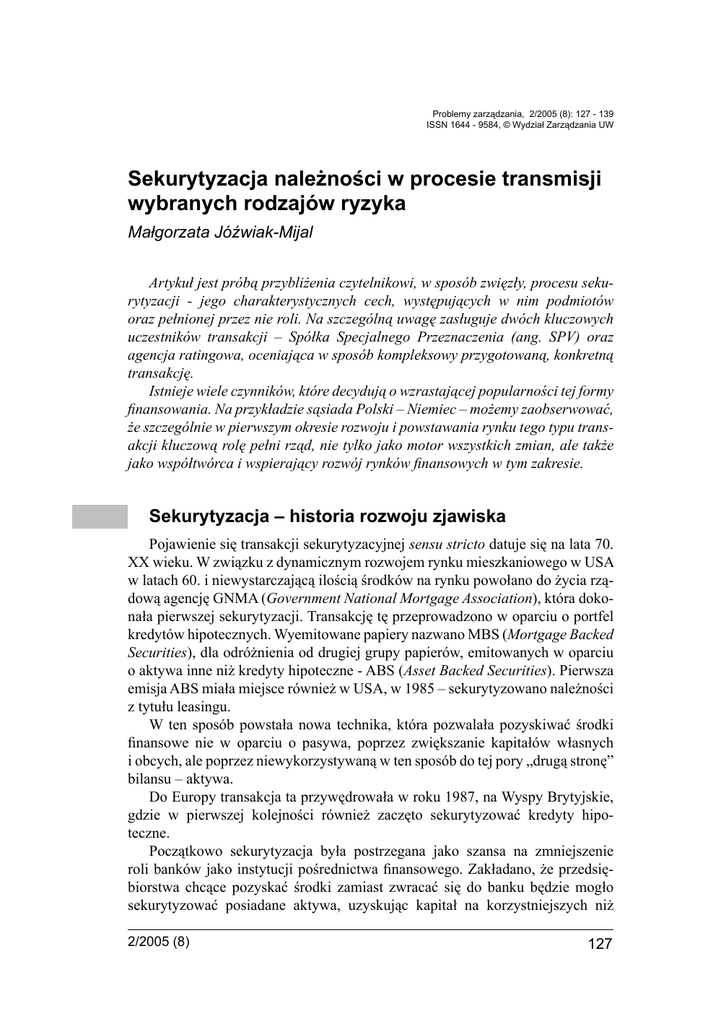 Problemy zarządzania, 2/2005 (8): 127 - 139 ISSN 1644 - 9584, © Wydział Zarządzania UW Sekurytyzacja należności w procesie transmisji wybranych rodzajów ryzyka Małgorzata Jóźwiak-Mijal Artykuł jest próbą przybliżenia czytelnikowi, w sposób zwięzły, procesu sekurytyzacji - jego charakterystycznych cech, występujących w nim podmiotów oraz pełnionej przez nie roli. Na szczególną uwagę zasługuje dwóch kluczowych uczestników transakcji – Spółka Specjalnego Przeznaczenia (ang. SPV) oraz agencja ratingowa, oceniająca w sposób kompleksowy przygotowaną, konkretną transakcję. Istnieje wiele czynników, które decydują o wzrastającej popularności tej formy finansowania. Na przykładzie sąsiada Polski – Niemiec – możemy zaobserwować, że szczególnie w pierwszym okresie rozwoju i powstawania rynku tego typu transakcji kluczową rolę pełni rząd, nie tylko jako motor wszystkich zmian, ale także jako współtwórca i wspierający rozwój rynków finansowych w tym zakresie. Sekurytyzacja – historia rozwoju zjawiska Pojawienie się transakcji sekurytyzacyjnej sensu stricto datuje się na lata 70. XX wieku. W związku z dynamicznym rozwojem rynku mieszkaniowego w USA w latach 60. i niewystarczającą ilością środków na rynku powołano do życia rządową agencję GNMA (Government National Mortgage Association), która dokonała pierwszej sekurytyzacji. Transakcję tę przeprowadzono w oparciu o portfel kredytów hipotecznych. Wyemitowane papiery nazwano MBS (Mortgage Backed Securities), dla odróżnienia od drugiej grupy papierów, emitowanych w oparciu o aktywa inne niż kredyty hipoteczne - ABS (Asset Backed Securities). Pierwsza emisja ABS miała miejsce również w USA, w 1985 – sekurytyzowano należności z tytułu leasingu. W ten sposób powstała nowa technika, która pozwalała pozyskiwać środki finansowe nie w oparciu o pasywa, poprzez zwiększanie kapitałów własnych i obcych, ale poprzez niewykorzystywaną w ten sposób do tej pory „drugą stronę” bilansu – aktywa. Do Europy transakcja ta przywędrowała w roku 1987, na Wyspy Brytyjskie, gdzie w pierwszej kolejności również zaczęto sekurytyzować kredyty hipoteczne. Początkowo sekurytyzacja była postrzegana jako szansa na zmniejszenie roli banków jako instytucji pośrednictwa finansowego. Zakładano, że przedsiębiorstwa chcące pozyskać środki zamiast zwracać się do banku będzie mogło sekurytyzować posiadane aktywa, uzyskując kapitał na korzystniejszych niż 2/2005 (8) 127