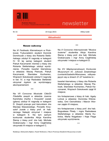 Nr 15 19 maja 2015 AMuz Łódź Aktualności Nasze sukcesy *** Na XI Festiwalu Klarnetowym w Piotrkowie Trybunalskim student Dominik Domińczak z klasy dra Roberta Stefańskiego zdobył III nagrodę w kategorii IV. W tej samej kategorii student Patryk Kaczmarek również z klasy dra Roberta Stefańskiego zdobył wyróżnienie. Ponadto kwartet klarnetowy w składzie: Maciej Pietrzak, Patryk Kaczmarek, Stanisław Kochaniec, Wojciech Sokołowski zdobył II nagrodę w kat. IV, a mgr Radosław Stefański otrzymał dyplom za wyróżniający akompaniament. Na X Concorso Internazionale "Musica Insieme" studentka Alicja Karolina Ślemp z klasy prof. dra hab. Michała Grabarczyka i mgr Anny Ceglińskiej otrzymała I miejsce w kategorii D. *** Na VII Concorso Musicale Citta'Di Filadelfia zespół w składzie Joanna Kamińska (harfa) i Krzysztof Jusiak (gitara) zdobył III nagrodę w kategorii D. Zespół pracuje pod kierunkiem dra Macieja Staszewskigo. Ponadto Krzysztof Jusiak z klasy prof. dr hab. Jerzego Nalepki otrzymał I miejsce w kategorii E. Na tym samym konkursie studentka Alicja Karolina Ślemp z klasy prof. dra hab. Michała Grabarczyka i mgr Anny Ceglińskiej otrzymała III miejsce w kategorii C. *** Na XV Międzynarodowym Konkursie Muzycznym im. Juliusza Zarębskiego Łomianki/Izabelin/Warszawa, odbywającym się w dniach 21-27 kwietnia br.: kwartet klarnetowy z klasy dra Roberta Stefańskiego w składzie: Maciej Pietrzak, Stanisław Kochaniec, Patryk Kaczmarek, Wojciech Sokołowski zajął III miejsce; trio fortepianowe z klasy dr hab. Agaty Lichoś w składzie: Dominika Wiśniewska, Omi Osmolińska i Marcin Werner zajęło III miejsce; trio fortepianowe z klasy prof. dra hab. Bogusława Pikały i mgra Radosława Stefańskiego w składzie: Marta Kubicka, Marta Nojgebaor i Kaja Flaga otrzymało wyróżnienie. *** Redakcja: Aleksandra Bęben, Paweł Wołowicz / Biuro Promocji Akademii Muzycznej w Łodzi Podczas Forum Kameralnego Muzyki Dawnej odbywającego się w Akademii Muzycznej w Poznaniu w dniach 19-21 kwietnia br., zespół "Cordatus" w składzie: Ewa Gubiec – flet traverso, Justyna Skatulnik – skrzypce barokowe, Joanna Cyrulik – klawesyn/pozytyw zdobył I miejsce. *** Na XXV Concorso Internazionale per Giovanni Musicisti "Citta di Barletta" studentka Magdalena Wiśniewska z klasy skrzypiec prof. dr hab. Izabeli Ceglińskiej i mgr Anny Ceglińskiej zdobyła II nagrodę. Informator koncertowy Wirtuoz fortepianu Już dziś z recitalem fortepianowym wystąpi znany wszystkim melomanom, znakomity pianista Edward Wolanin, który w naszej Akademii gościć będzie na zaproszenie Katedry Fortepianu. W jego interpretacji będzie można usłyszeć chopinowskie nokturny i polonezy w różnych odsłonach (m.in. Andante Spianato i Wielki Polonez Esdur op. 22 czy Polonez-Fantazja op. 61). Wydarzenia tego nie wolno przegapić, dlatego radzę dobrze zapamiętać: 19 maja 2015 roku, wtorek, godz. 18.00, Sala koncertowa AM, ul. Żubardzka 2a. A jeżeli będą Państwo ciekawi, jak wygląda praca prof. Wolanina ze studentami, to zapraszamy na Mistrzowski kurs fortepianowy z Profesorem, który odbywać się będzie następnego dnia, tj. 20 maja (środa). Edward Wolanin, zdjęcie ze zbiorów artysty Joanna Kamińska i Krzysztof Jusiak, fot. Dariusz Kulesza Gitara i harfa w rolach głównych Również dziś, aczkolwiek w Sali kameralnej przy al. 1 Maja 4 o godz. 19.00 organizowany będzie ostatni w tym roku akademickim Koncert gitarowy. Mamy nadzieję, że publiczność nie zawiedzie naszych oczekiwań i jak zawsze pojawi się licznie. W programie kompozycje na gitarę lub harfę solo (Tansman, Glinka), jak i utwory kameralne (Guridi, Ibert, Grzeszczak, Boccherini, Ferrante). Szykuje się zatem ciekawy wieczór z atrakcyjnymi propozycjami muzycznymi. Redakcja: Aleksandra Bęben, Paweł Wołowicz / Biuro Promocji Akademii Muzycznej w Łodzi Organowe B-A-C-H Laureaci ogólnopolskich i międzynarodowych konkursów – Patryk Podwojski i Viktoria Koshuba, studiujący w klasie organów prof. dra hab. Romana Peruckiego w Akademii Muzycznej im. S. Moniuszki w Gdańsku będą gośćmi specjalnymi, których usłyszeć będzie można podczas najbliższego koncertu z cyklu Organy, klawesyn i muzyka dawna. Monumentalne i szlachetne brzmienie organów w kompozycjach J. S. Bacha, F. Liszta, N. Bruhnsa i J. Alaina wypełni Salę organową w środę 20 maja o godz. 18.15 w Pałacu AM przy ul. Gdańskiej. Serdecznie zapraszamy! i wyróżnienia na konkursach muzyki kameralnej. W czwartek 21 maja o godz. 18.00 w Sali koncertowej AM przy ul. Żubardzkiej kompozycje Karola Szymanowskiego, Petera Hope i Roberta Schumanna zinterpretują zespoły z Akademii Muzycznej w Łodzi (duet: Alina Adamska-Raitarovskyi – sopran i Marta Kubicka – fortepian, trio: Magdalena Maniewska – obój, Hipolit Wróblewski – fagot, Michał Chojnacki – fortepian) oraz z warszawskiego Uniwersytetu Muzycznego (trio: Katarzyna Denkiewicz – skrzypce, Antonina Przybyszewska – wiolonczela, Maurycy Stawujak – fortepian). Na koncert obowiązuje wstęp wolny. Teoria afektów Znajomość teorii afektów to podstawa w wykonawstwie wokalnym muzyki dawnej. A to właśnie wokalne utwory z dawnych epok takich kompozytorów, jak F. Landino, G. P. da Palestrina, C. Monteverdi, J. Dowland, J. B. Lully czy J. Ph. Rameau będą wykonywane podczas Koncertu Studentów IV roku Wydziału Wokalno-Aktorskiego. Towarzyszyć im będą Aleksandra Hanus, Malwina Borkowicz, Michał Sobiech (Zespół Muzyki Dawnej „Anturium”) oraz Joanna Cyrulik i Natalia Kuźmińska. Wydarzenie to będzie mieć miejsce w pięknej Sali klawesynowej im. Emmy Altberg w Pałacu AM przy ul. Gdańskiej 20 maja br. (środa) o godz. 16.00. Gorąco polecamy nie tylko miłośnikom muzyki dawnej! Estrada Młodych Laureatów Kolejna odsłona Estrady Młodych będzie koncertową prezentacją utalentowanych młodych muzyków, którzy w ostatnim czasie zdobyli nagrody Prezentacja interp