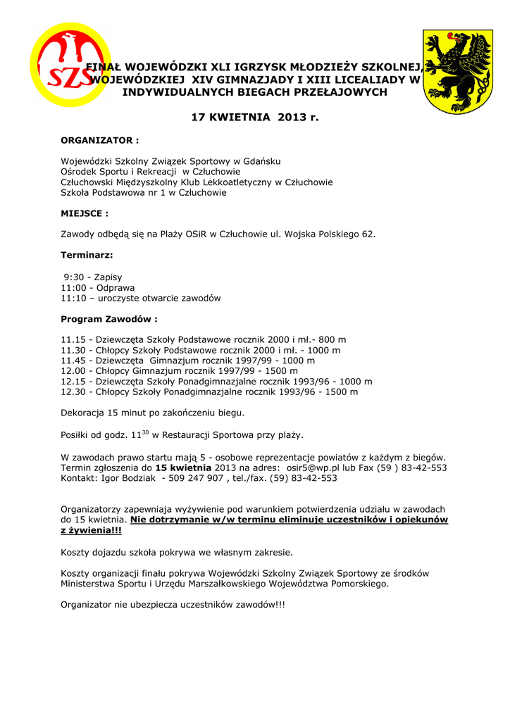 FINAŁ WOJEWÓDZKI XLI IGRZYSK MŁODZIEŻY SZKOLNEJ, WOJEWÓDZKIEJ XIV GIMNAZJADY I XIII LICEALIADY W INDYWIDUALNYCH BIEGACH PRZEŁAJOWYCH 17 KWIETNIA 2013 r. ORGANIZATOR : Wojewódzki Szkolny Związek Sportowy w Gdańsku Ośrodek Sportu i Rekreacji w Człuchowie Człuchowski Międzyszkolny Klub Lekkoatletyczny w Człuchowie Szkoła Podstawowa nr 1 w Człuchowie MIEJSCE : Zawody odbędą się na Plaży OSiR w Człuchowie ul. Wojska Polskiego 62. Terminarz: 9:30 - Zapisy 11:00 - Odprawa 11:10 – uroczyste otwarcie zawodów Program Zawodów : 11.15 11.30 11.45 12.00 12.15 12.30 - Dziewczęta Szkoły Podstawowe rocznik 2000 i mł.- 800 m Chłopcy Szkoły Podstawowe rocznik 2000 i mł. - 1000 m Dziewczęta Gimnazjum rocznik 1997/99 - 1000 m Chłopcy Gimnazjum rocznik 1997/99 - 1500 m Dziewczęta Szkoły Ponadgimnazjalne rocznik 1993/96 - 1000 m Chłopcy Szkoły Ponadgimnazjalne rocznik 1993/96 - 1500 m Dekoracja 15 minut po zakończeniu biegu. Posiłki od godz. 1130 w Restauracji Sportowa przy plaży. W zawodach prawo startu mają 5 - osobowe reprezentacje powiatów z każdym z biegów. Termin zgłoszenia do 15 kwietnia 2013 na adres: [email protected] lub Fax (59 ) 83-42-553 Kontakt: Igor Bodziak - 509 247 907 , tel./fax. (59) 83-42-553 Organizatorzy zapewniaja wyżywienie pod warunkiem potwierdzenia udziału w zawodach do 15 kwietnia. Nie dotrzymanie w/w terminu eliminuje uczestników i opiekunów z żywienia!!! Koszty dojazdu szkoła pokrywa we własnym zakresie. Koszty organizacji finału pokrywa Wojewódzki Szkolny Związek Sportowy ze środków Ministerstwa Sportu i Urzędu Marszałkowskiego Województwa Pomorskiego. Organizator nie ubezpiecza uczestników zawodów!!!