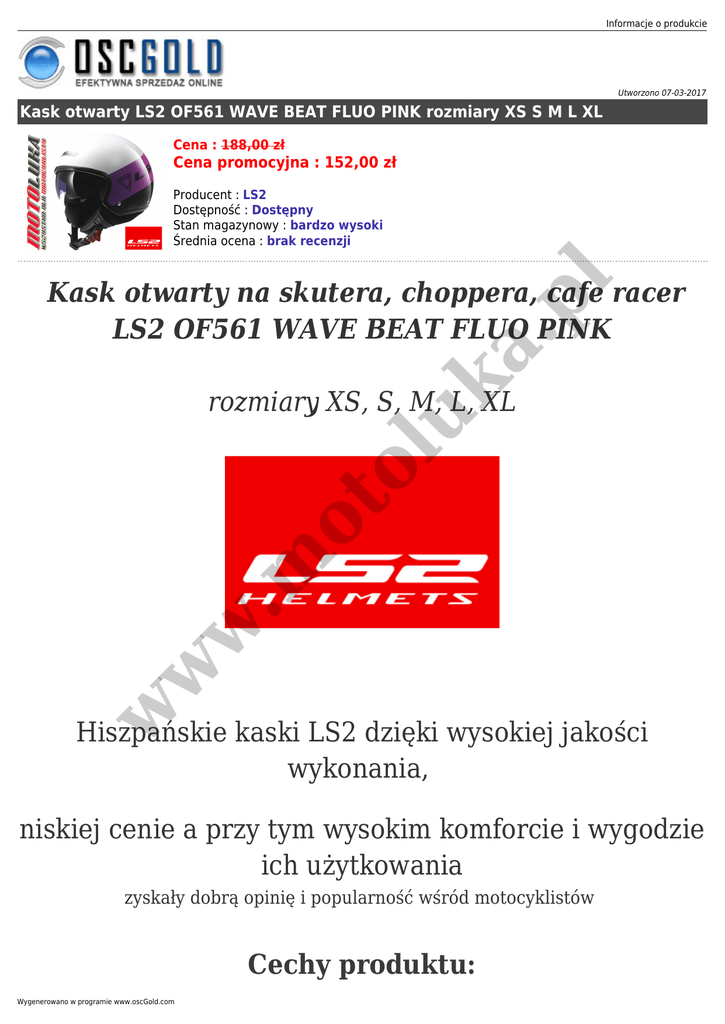 Informacje o produkcie Utworzono 07-03-2017 Kask otwarty LS2 OF561 WAVE BEAT FLUO PINK rozmiary XS S M L XL Cena : 188,00 zł Cena promocyjna : 152,00 zł Producent : LS2 Dostępność : Dostępny Stan magazynowy : bardzo wysoki Średnia ocena : brak recenzji uk a. pl Kask otwarty na skutera, choppera, cafe racer LS2 OF561 WAVE BEAT FLUO PINK w w w .m ot ol rozmiary XS, S, M, L, XL Hiszpańskie kaski LS2 dzięki wysokiej jakości wykonania, niskiej cenie a przy tym wysokim komforcie i wygodzie ich użytkowania zyskały dobrą opinię i popularność wśród motocyklistów Cechy produktu: Wygenerowano w programie www.oscGold.com - aerodynamiczna skorupa wykonana z HPTT termoplast w w w .m ot ol uk a. pl - wyściółka hipoalergiczna, oddychająca wykonana z różnej gęstości pianki dla lepszego dopasowania - kask nie posiada szybki ale jest wyposażony w oryginalną blendę przeciwsłoneczną - zapięcie kasku z funkcją szybkiego zwolnienia klamry - certyfikat bezpieczeństwa ECE 22.05 - homologacja E9 - waga ok 1050 gr .m ot ol uk a. pl Informacje o produkcie w w w Jak dobrać odpowiedni rozmiar kasku ? Posłuż się tabelą poniżej. Wygenerowano w programie www.oscGold.com