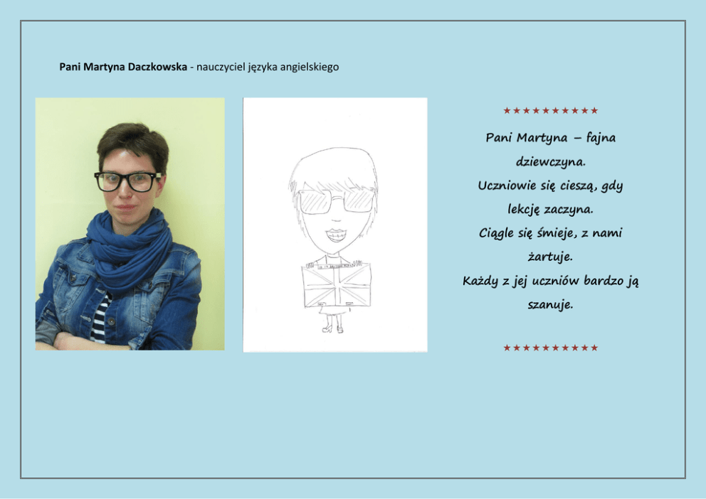 Pani Martyna Daczkowska - nauczyciel języka angielskiego  Pani Martyna – fajna dziewczyna. Uczniowie się cieszą, gdy lekcję zaczyna. Ciągle się śmieje, z nami żartuje. Każdy z jej uczniów bardzo ją szanuje.