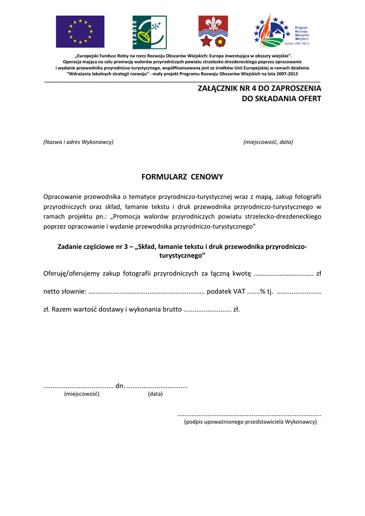 „Europejski Fundusz Rolny na rzecz Rozwoju Obszarów Wiejskich: Europa inwestująca w obszary wiejskie”. Operacja mająca na celu promocję walorów przyrodniczych powiatu strzelecko-drezdeneckiego poprzez opracowanie i wydanie przewodnika przyrodniczo-turystycznego, współfinansowana jest ze środków Unii Europejskiej w ramach działania “Wdrażania lokalnych strategii rozwoju” - mały projekt Programu Rozwoju Obszarów Wiejskich na lata 2007-2013 _________________________________________________________________________________________________________________ ZAŁĄCZNIK NR 4 DO ZAPROSZENIA DO SKŁADANIA OFERT (Nazwa i adres Wykonawcy) (miejscowość, data) FORMULARZ CENOWY Opracowanie przewodnika o tematyce przyrodniczo-turystycznej wraz z mapą, zakup fotografii przyrodniczych oraz skład, łamanie tekstu i druk przewodnika przyrodniczo-turystycznego w ramach projektu pn.: „Promocja walorów przyrodniczych powiatu strzelecko-drezdeneckiego poprzez opracowanie i wydanie przewodnika przyrodniczo-turystycznego” Zadanie częściowe nr 3 – „Skład, łamanie tekstu i druk przewodnika przyrodniczoturystycznego” Oferuję/oferujemy zakup fotografii przyrodniczych za łączną kwotę ………………………….…. zł netto słownie: ............................................................... podatek VAT .......% tj. ........................ zł. Razem wartość dostawy i wykonania brutto .......................... zł. ...................................... dn. ................................. (miejscowość) (data) ................................................................................. (podpis upoważnionego przedstawiciela Wykonawcy)