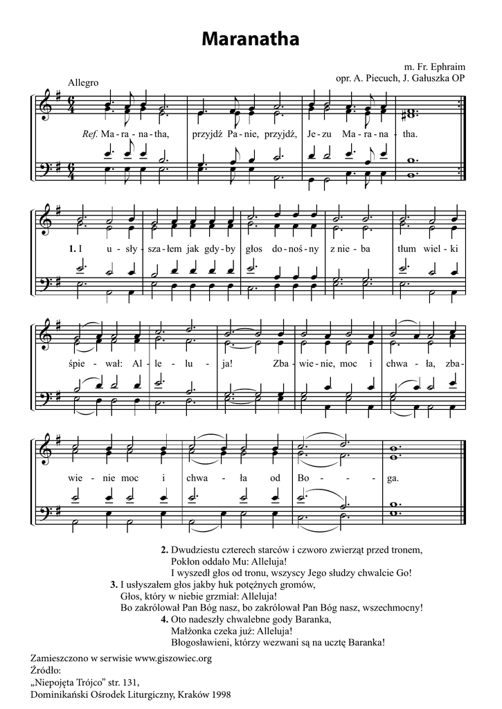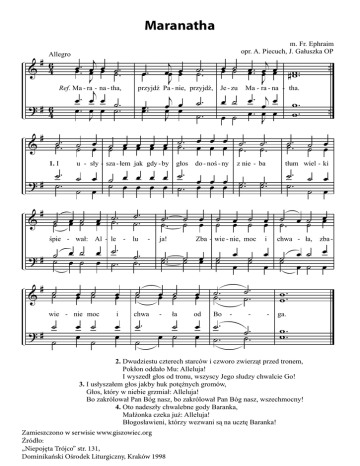 Maranatha ( '' && '' '' ) & )& * Ref. Ma - ra - na - tha, ( '& ' ' )& " # $% '& ' ' )& * # % ! $ Allegro # )& ! )& 1. I )& " # )& ! # '& ' ) ' & '( ' ' ) ' & *' ' przyjd! Pa - nie, przyjd!, '' && Je - zu )& )& u - s"y - sza - "em jak gdy - by g"os do - no# - ny ) ' ) ' '' )) && )& )& ' ) " # )) ' ) ' )& ' )& '' )) wie - nie moc ' ) ' ) )) & & - )) & & )) '' ja! )) '' '' )) '' )) '' i chwa - od ' ' )& ) "a ) ' ) ' ' +& +& )& )& )) && z nie - ba )) '' )& )& ) ' ) ' )) '' )) '' )) ' )) '' & )) ' ) ' ) ' ) ' ) )) & & Bo )& )& - )& )& - )& )& i - chwa - "a, + && + zba - ' ) ' ' ) ' ga. ++ & & 2. Dwudziestu czterech starców i czworo zwierz$t przed tronem, Pok"on odda"o Mu: Alleluja! I wyszed" g"os od tronu, wszyscy Jego s"udzy chwalcie Go! 3. I us"ysza"em g"os jakby huk pot&%nych gromów, G"os, który w niebie grzmia": Alleluja! Bo zakrólowa" Pan Bóg nasz, bo zakrólowa" Pan Bóg nasz, wszechmocny! 4. Oto nadesz"y chwalebne gody Baranka, Ma"%onka czeka ju%: Alleluja! B"ogos"awieni, którzy wezwani s$ na uczt& Baranka! Zamieszczono w serwisie www.giszowiec.org Źródło: „Niepojęta Trójco” str. 131, Dominikański Ośrodek Liturgiczny, Kraków 1998 && t"um wiel - ki )) && Zba - wie - nie, moc )) && && Ma - ra - na - tha. )) ' ' ' ' ) & ' ' ' )) & ' ' ' ' )& ' ' ' & #pie - wa": Al - le - lu ) "# ) ( '' '' * '' )) '' && '( '' + & ' #+& * )) & & ' ' ' )) '' '' '' '' )) && ' ' ' )) && )) '' )) '' )) # ) ! ) ( ' '' ' * m. Fr. Ephraim opr. A. Piecuch, J. Ga"uszka OP