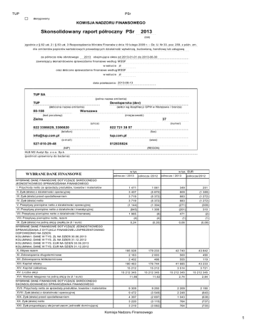TUP PSr skorygowany KOMISJA NADZORU FINANSOWEGO Skonsolidowany raport półroczny PSr 2013 (rok) (zgodnie z § 82 ust. 2 i § 83 ust. 3 Rozporządzenia Ministra Finansów z dnia 19 lutego 2009 r. – Dz. U. Nr 33, poz. 259, z późn. zm.) dla emitentów papierów wartościowyc h prowadząc ych działalność wytwórczą, budowlaną, handlową lub usługową 2013 obejmując e okres od 2013-01-01 do 2013-06-30 za półrocze roku obrotowego zawierający skonsolidowane sprawozdanie finansowe według MSSF w walucie zł oraz skrócone sprawozdanie finansowe według MSSF w walucie zł data przekazania: 2013-08-13 TUP SA (pełna nazwa emitenta) Developerska (dev) TUP (skróc ona nazwa emitenta) 00-108 (sektor wg klasyfikacji GPW w Warszawie / branża) Warszawa (kod poc ztowy) (miejscowość) Zielna 37 (ulic a) (numer) 022 3386629, 3386620 022 721 38 57 (telefon) (fax) [email protected] tup.com.pl (e-mail) (www) 527-010-29-48 012835824 (NIP) (REGON) HLB M2 Audyt Sp. z o.o. Sp.k. (podmiot uprawniony do badania) w tys. WYBRANE DANE FINANSOWE półroc ze / 2013 w tys. EUR półroc ze /2012 półroc ze / 2013 półroc ze/2012 WYBRANE DANE FINANSOWE DOTYCZĄCE SKRÓCONEGO JEDNOSTKOWEGO SPRAWOZDANIA FINANSOWEGO I. Przyc hody netto ze sprzedaży produktów, towarów i materiałów 1 471 1 061 349 II. Zysk (strata) z działalności operacyjnej 3 407 (5 870) 809 (1 389) III. Zysk (strata) przed opodatkowaniem 3 719 (5 372) 883 (1 272) IV. Zysk (strata) netto 3 719 (5 372) 883 (1 272) V. Przepływy pieniężne netto z działalnośc i operacyjnej (1 144) (1 304) (271) (309) 1 308 (201) 310 VI. Przepływy pieniężne netto z działalnośc i inwestyc yjnej (845) VII. Przepływy pieniężne netto z działalnośc i finansowej 1 985 VIII. Przepływy pieniężne netto, razem (8) (4) IX. Zysk (strata) na jedną akc ję zwykłą (w zł / euro) 0,24 (4) (0,35) 471 (1) 0,06 251 (2) (1) (0,08) WYBRANE DANE FINANSOWE DOTYCZĄCE JEDNOSTKOWEGO SPRAWOZDANIA Z SYTUACJI FINANSOWEJ ZAPREZENTOWANO ODPOWIEDNIO NA DZIEŃ: KOLUMNA1: DANE W TYS. ZŁ NA DZIEŃ 30.06.2013 KOLUMNA2; DANE W TYS. ZŁ NA DZIEŃ 31.12.2012 KOLUMNA3; DANE W TYS. EUR NA DZIEŃ 30.06.2013 KOLUMNA4; DANE W TYS. EUR NA DZIEŃ 31.12.2012 X. Aktywa razem 185 028 179 233 42 740 43 842 XI. Zobowiązania długoterminowe 2 163 2 003 500 490 XII. Zobowiązania krótkoterminowe 2 402 486 555 119 180 463 176 744 41 685 43 233 XIII. Kapitał własny XIV. Kapitał zakładowy XV. Liczba akcji XVI. Wartość księgowa na jedną akc ję (w zł / euro) 15 212 15 212 3 514 3 721 15 212 345 15 212 345 15 212 345 15 212 345 2,74 2,84 2 190 11,86 11,62 WYBRANE DANE FINANSOWE DOTYCZĄCE SKRÓCONEGO SKONSOLIDOWANEGO SPRAWOZDANIA FINANSOWEGO XVII. Przyc hody netto ze sprzedaży produktów, towarów i materiałów 9 309 9 250 2 209 XVIII. Zysk (strata) z działalności operacyjnej 9 472 (3 549) 2 248 (840) XIX. Zysk (strata) przed opodatkowaniem 4 397 (2 697) 1 043 (638) XX. Zysk (strata) netto 3 220 (3 115) 764 (737) XXI. Zysk przypadający akcjonariuszom jednostki dominując ej 3 219 (3 082) 764 (730) Komisja Nadzoru Finansowego 1 TUP PSr XXII. Przepływy pieniężne netto z działalnośc i operacyjnej (4 028) 2 882 XXIII. Przepływy pieniężne netto z działalnośc i inwestyc yjnej 8 352 4 561 1 982 1 080 XXIV. Przepływy pieniężne netto z działalnośc i finansowej (5 735) (5 701) (1 361) (1 349) XXV. Przepływy pieniężne netto, razem (1 411) 1 742 (335) 412 (0,20) 0,05 (0,05) XXVI. Zysk (strata) na jedną akc ję zwykłą (w zł / euro) 0,21 (956) 682 WYBRANE DANE FINANSOWE DOTYCZĄCE SKONSOLIDOWANEGO SPRAWOZDANIA Z SYTUCJI FINANSOWEJ ZAPREZENTOWANO ODPOWIEDNIO NA DZIEŃ: KOLUMNA1: DANE W TYS. ZŁ NA DZIEŃ 30.06.2013 KOLUMNA2: DANE W TYS. ZŁ NA DZIEŃ 31.12.2012 KOLUMNA 3: DANE W TYS. EUR NA DZIEŃ 30.06.2013 KOLUMNA 4; DANE W TYS. EUR NA DZIEŃ 31.12.2012 XXVII. Aktywa razem 272 690 271 737 62 989 66 469 XXVIII. Zobowiązania długoterminowe 82 420 59 667 19 038 14 595 XXIX. Zobowiązania krótkoterminowe 13 344 38 364 3 082 9 384 176 926 173 706 40 868 42 490 XXX. Kapitał własny XXXI. Kapitał zakładowy XXXII. Liczba akcji 15 212 15 212 3 514 3 721 15 212 345 15 212 345 15 212 345 15 212 345 2,69 2,79 XXXIII. Wartość księgowa na jedną akc ję (w zł / euro) 11,63 11,42 Do wyliczenia wybranych danych finansowych w euro zastosowano następujące kursy: -dla pozycji sprawozdania z sytuacji finansowej – kurs NBP z dnia 28 czerwca 2013 roku – 1 EUR = 4,3292zł, kurs NBP z dnia 31 grudnia 2012r. – 1 EUR = 4,0882 zł - dla pozycji rachunku zysków i strat oraz przepływów pieniężnych – kurs wyliczony jako średnia kursów NBP, obowiązujących na ostatni dzień każdego miesiąca I półrocza 2013 i 2012 roku, odpowiednio: 1 EUR = 4,2140 zł i 1 EUR = 4,2246 zł. W przypadku prezentowania wybranych danych finansowych z półrocznego skróc onego sprawozdania finansowego dane te należy odpowiednio opisać. Wybrane dane finansowe ze skonsolidowanego bilansu (skonsolidowanego sprawozdania z sytuacji finansowej) lub odpowiednio z bilansu (sprawozdania z sytuacji finansowej) prezentuje się na koniec półroc za bieżąc ego roku obrotowego i na koniec poprzedniego roku obrotowego, co należy odpowiednio opisać . Raport powinien zostać przekazany Komisji Nadzoru Finansowego, spółce prowadzącej rynek regulowany oraz do publicznej wiadomości za pośrednictwem agencji informac yjnej zgodnie z przepisami prawa. ZAWARTOŚĆ RAPORTU Plik Opis Raport za I półrocze 2013.pdf Skróc one jednostkowe i skonsolidowane sprawozdanie finansowe TUP S.A. i Grupy Kapitałowej TUP za I półrocze 2013r. Sprawozdanie_Zarzadu_za I_polroc ze_2013_06.pdf Sprawozdanie Zarządu z działalności Grupy Kapitałowej w I półroczu 2013r. TUP_2013_PSF_MSSF_RAP PL-KSRF_pdf.pdf Raport Niezależnego Biegłego Rewidenta z przeglądu skróc onego śródrocznego sprawozdania finansowego jedkostkowego TUP S.A. i skonsolidowanego Grupy Kapitałowej TUP za I półrocze 2013r. PODPISY OSÓB 