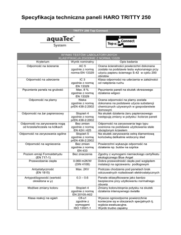 Specyfikacja techniczna paneli HARO TRITTY 250 TRITTY 250 Top Connect Kryterium WYNIKI TESTÓW LABOLATORYJNYCH KLASYFIKACJA ZGODNIE Z NORMĄ 13329 Wynik nominalny Opis badania Odporność na ścieranie AC 5 zgodnie z normą norma EN 13329 Odporność na uderzenie IC 3 zgodnie z normą EN 13329 Max. 8 % zgodnie z normą EN 13329 Niska zgodnie z normą prEN 438-2:2002 Pęcznienie panela na grubość Odporność na plamy Odporność na żar papierosowy Odporność na zarysowania nogą od krzesła/krzesła na kółkach Odporność na zarysowania ogólne Odporność na wgniecenia Poziom emisji Formaldehydu (EN 717-1) Przewodzenie ciepła Stopień 4 zgodnie z normą prEN 438-2:2002 Bez zmian zgodnie z normą EN 424 i 425 Stopień 5 zgodnie z normą prEN 438-2:2002 Bez zmian zgodnie z normą EN 433 Bez znaczenia 0.069 m2K/W (DIN 4108) Ocena ścieralności powierzchni dokonana została na podstawie testu wykonanego przy użyciu papieru ściernego S-42 w cyklu 200 obrotów Klasa odporności na uderzenia w zależności od natężenia ruchu Pęcznienie paneli na skutek okresowego działania wilgoci Ocena odporności na plamy została dokonana na podstawie użycia substancji chemicznych używanych w gospodarstwie domowym Na skutek działania żaru papierosowego następują zmiany w połysku i kolorze paneli Odporność na zarysowania tego typu oceniona na podstawie użytkowania stale obciążonym krzesłem Na skutek zarysowania ostrą diamentową końcówką delikatnie widoczny ślad Powierzchni wykazuje odporność na działanie np. butów na szpilce Zgodny z wymogami niemieckiego certyfikatu ekologicznego Blue Angel Dobra przewodniość ciepła pod względem instalacji na ogrzewaniu podłogowym Antystatyczność (EN 1815) Max. 2KV Podczas chodzenia pod panelach brak odczuwalnych rozładowań elektrostatycznych Antypoślizgowość (wartość określona w μ) 0.3 – 0.6 Możliwe zmiany koloru Stopień 4 zgodnie z normą EN 20105-A02 Cfl-s1 zgodnie z wymogami ISO 13501-1 Panele sklasyfikowane jako bardzo bezpieczne przy użytkowaniu normalnego obuwia Zmiany koloru/stopnia połysku na skutek działania intensywnego światła Klasa reakcji na ogień Wysoce ognioodporne powierzchnie konieczne są w obszarach specjalnych tj. wyjścia ewakuacyjne. Wyrób trudno zapalny Specyfikacja techniczna paneli HARO TRITTY 250 TRITTY 250 Top Connect Konstrukcja Warstwa użytkowa 0.3 mm DPL Warstwa środkowa 9.0 mm HDF AR6 Warstwa spodnia 0.3 mm DPL Grubość całkowita 9.6 mm Wymiary panela 190 mm x 1282 mm Materiał Kryteria Odporność na uginanie N/mm² EN 310 Odporność na rozwarstwienie EN 311 Odporność na rozciąganiepoprz. N/mm² EN 319 Wymagania Wartości typowe --- > 40 N/mm² min. 1.0 N/mm² > 1.3 N/mm² --- > 1.5 N/mm² Symbol Pojedyncza deska Kryteria NOML. value mean value Długość ± 0.5 mm ± 0.5 mm Szerokość ± 0.1 mm ± 0.1 mm Możliwe odchyłki kształtów max. 0.2 mm max. 0.1 mm Możliwe róznice wysokości między elementami max. 0.1 mm max. 0.1 mm max. 0.4 mm max. 0.2 mm --- min. 80 mm Prostolinijność warstwy powierzchniowej Wzdłużne przesunięcie wzoru Poprzeczne przesunięcie wzoru --- Symbol max. 5 mm Revision: 07/2010 Page 2 (2)