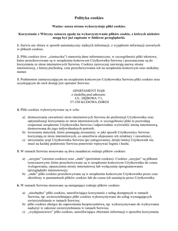 Polityka cookies Ważne: nasza strona wykorzystuje pliki cookies. Korzystanie z Witryny oznacza zgodę na wykorzystywanie plików cookie, z których niektóre mogą być już zapisane w folderze przeglądarki. 1. Serwis nie zbiera w sposób automatyczny żadnych informacji, z wyjątkiem informacji zawartych w plikach cookies. 2. Pliki cookies (tzw. „ciasteczka”) stanowią dane informatyczne, w szczególności pliki tekstowe, które przechowywane są w urządzeniu końcowym Użytkownika Serwisu i przeznaczone są do korzystania ze stron internetowych Serwisu. Cookies zazwyczaj zawierają nazwę strony internetowej, z której pochodzą, czas przechowywania ich na urządzeniu końcowym oraz unikalny numer. 3. Podmiotem zamieszczającym na urządzeniu końcowym Użytkownika Serwisu pliki cookies oraz uzyskującym do nich dostęp jest operator Serwisu: APARTAMENT DĄB z siedzibą pod adresem: UL. DĘBOWA 7/1, 57-350 KUDOWA ZDRÓJ 4. Pliki cookies wykorzystywane są w celu: a) dostosowania zawartości stron internetowych Serwisu do preferencji Użytkownika oraz optymalizacji korzystania ze stron internetowych; w szczególności pliki te pozwalają rozpoznać urządzenie Użytkownika Serwisu i odpowiednio wyświetlić stronę internetową, dostosowaną do jego indywidualnych potrzeb; b) tworzenia statystyk, które pomagają zrozumieć, w jaki sposób Użytkownicy Serwisu korzystają ze stron internetowych, co umożliwia ulepszanie ich struktury i zawartości; c) utrzymanie sesji Użytkownika Serwisu (po zalogowaniu), dzięki której Użytkownik nie musi na każdej podstronie Serwisu ponownie wpisywać loginu i hasła; 5. W ramach Serwisu stosowane są dwa zasadnicze rodzaje plików cookies: a) „sesyjne” (session cookies) oraz „stałe” (persistent cookies). Cookies „sesyjne” są plikami tymczasowymi, które przechowywane są w urządzeniu końcowym Użytkownika do czasu wylogowania, opuszczenia strony internetowej lub wyłączenia oprogramowania (przeglądarki internetowej); b) „stałe” pliki cookies przechowywane są w urządzeniu końcowym Użytkownika przez czas określony w parametrach plików cookies lub do czasu ich usunięcia przez Użytkownika. 6. W ramach Serwisu stosowane są następujące rodzaje plików cookies: a) „niezbędne” pliki cookies, umożliwiające korzystanie z usług dostępnych w ramach Serwisu, np. uwierzytelniające pliki cookies wykorzystywane do usług wymagających uwierzytelniania w ramach Serwisu; b) pliki cookies służące do zapewnienia bezpieczeństwa, np. wykorzystywane do wykrywania nadużyć w zakresie uwierzytelniania w ramach Serwisu; c) „wydajnościowe” pliki cookies, umożliwiające zbieranie informacji o sposobie korzystania ze stron internetowych Serwisu; d) „funkcjonalne” pliki cookies, umożliwiające „zapamiętanie” wybranych przez Użytkownika ustawień i personalizację interfejsu Użytkownika, np. w zakresie wybranego języka lub regionu, z którego pochodzi Użytkownik, rozmiaru czcionki, wyglądu strony internetowej itp.; e) „reklamowe” pliki cookies, umożliwiające dostarczanie Użytkownikom treści reklamowych bardziej dostosowanych do ich zainteresowań. 7. W wielu przypadkach oprogramowanie służące do przeglądania stron internetowych (przeglądarka internetowa) domyślnie dopuszcza przechowywanie plików cookies w urządzeniu końcowym Użytkownika. Użytkownicy Serwisu mogą dokonać w każdym czasie zmiany ustawień dotyczących plików cookies. Ustawienia te mogą zostać zmienione w szczególności w taki sposób, aby blokować automatyczną obsługę plików cookies w ustawieniach przeglądarki internetowej bądź informować o ich każdorazowym zamieszczeniu w urządzeniu Użytkownika Serwisu. Szczegółowe informacje o możliwości i sposobach obsługi plików cookies dostępne są w ustawieniach oprogramowania (przeglądarki internetowej). 8. Operator Serwisu informuje, że ograniczenia stosowania plików cookies mogą wpłynąć na niektóre funkcjonalności dostępne na stronach internetowych Serwisu. 9. Pliki cookies zamieszczane w urządzeniu końcowym Użytkownika Serwisu i wykorzystywane mogą być również przez współpracujących z operatorem Serwisu reklamodawców oraz partnerów. 10. Więcej informacji na temat plików cookies dostępnych jest pod adresem http://www.wszystkoociasteczkach.pl lub w sekcji „Pomoc” w menu przeglądarki internetowej.