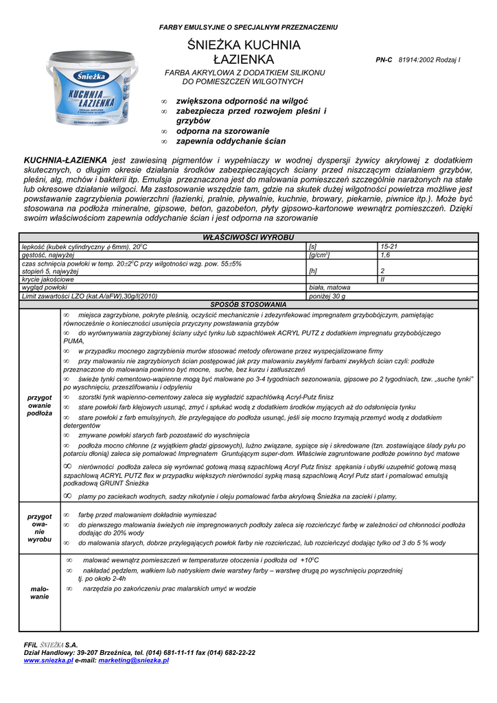 FARBY EMULSYJNE O SPECJALNYM PRZEZNACZENIU ŚNIEŻKA KUCHNIA ŁAZIENKA PN-C 81914:2002 Rodzaj I FARBA AKRYLOWA Z DODATKIEM SILIKONU DO POMIESZCZEŃ WILGOTNYCH • • • • zwiększona odporność na wilgoć zabezpiecza przed rozwojem pleśni i grzybów odporna na szorowanie zapewnia oddychanie ścian KUCHNIA-ŁAZIENKA jest zawiesiną pigmentów i wypełniaczy w wodnej dyspersji żywicy akrylowej z dodatkiem skutecznych, o długim okresie działania środków zabezpieczających ściany przed niszczącym działaniem grzybów, pleśni, alg, mchów i bakterii itp. Emulsja przeznaczona jest do malowania pomieszczeń szczególnie narażonych na stałe lub okresowe działanie wilgoci. Ma zastosowanie wszędzie tam, gdzie na skutek dużej wilgotności powietrza możliwe jest powstawanie zagrzybienia powierzchni (łazienki, pralnie, pływalnie, kuchnie, browary, piekarnie, piwnice itp.). Może być stosowana na podłoża mineralne, gipsowe, beton, gazobeton, płyty gipsowo-kartonowe wewnątrz pomieszczeń. Dzięki swoim właściwościom zapewnia oddychanie ścian i jest odporna na szorowanie WŁAŚCIWOŚCI WYROBU lepkość (kubek cylindryczny φ 6mm), 200C gęstość, najwyżej czas schnięcia powłoki w temp. 20±20C przy wilgotności wzg. pow. 55±5% stopień 5, najwyżej krycie jakościowe wygląd powłoki Limit zawartości LZO (kat.A/aFW),30g/l(2010) SPOSÓB STOSOWANIA [s] [g/cm3] 15-21 1,6 [h] 2 II biała, matowa poniżej 30 g • miejsca zagrzybione, pokryte pleśnią, oczyścić mechanicznie i zdezynfekować impregnatem grzybobójczym, pamiętając równocześnie o konieczności usunięcia przyczyny powstawania grzybów • do wyrównywania zagrzybionej ściany użyć tynku lub szpachlówek ACRYL PUTZ z dodatkiem impregnatu grzybobójczego PUMA, • w przypadku mocnego zagrzybienia murów stosować metody oferowane przez wyspecjalizowane firmy przygot owanie podłoża • przy malowaniu nie zagrzybionych ścian postępować jak przy malowaniu zwykłymi farbami zwykłych ścian czyli: podłoże przeznaczone do malowania powinno być mocne, suche, bez kurzu i zatłuszczeń • świeże tynki cementowo-wapienne mogą być malowane po 3-4 tygodniach sezonowania, gipsowe po 2 tygodniach, tzw. „suche tynki” po wyschnięciu, przeszlifowaniu i odpyleniu • szorstki tynk wapienno-cementowy zaleca się wygładzić szpachlówką Acryl-Putz finisz • • stare powłoki farb klejowych usunąć, zmyć i spłukać wodą z dodatkiem środków myjących aż do odsłonięcia tynku stare powłoki z farb emulsyjnych, źle przylegające do podłoża usunąć, jeśli się mocno trzymają przemyć wodą z dodatkiem detergentów • zmywane powłoki starych farb pozostawić do wyschnięcia • podłoża mocno chłonne (z wyjątkiem gładzi gipsowych), luźno związane, sypiące się i skredowane (tzn. zostawiające ślady pyłu po potarciu dłonią) zaleca się pomalować Impregnatem Gruntującym super-dom. Właściwie zagruntowane podłoże powinno być matowe • nierówności podłoża zaleca się wyrównać gotową masą szpachlową Acryl Putz finisz spękania i ubytki uzupełnić gotową masą szpachlową ACRYL PUTZ flex w przypadku większych nierówności sypką masą szpachlową Acryl Putz start i pomalować emulsją podkadową GRUNT Śnieżka • przygot owanie wyrobu • • • • • malowanie • plamy po zaciekach wodnych, sadzy nikotynie i oleju pomalować farba akrylową Śnieżka na zacieki i plamy, farbę przed malowaniem dokładnie wymieszać do pierwszego malowania świeżych nie impregnowanych podłoży zaleca się rozcieńczyć farbę w zależności od chłonności podłoża dodając do 20% wody do malowania starych, dobrze przylegających powłok farby nie rozcieńczać, lub rozcieńczyć dodając tylko od 3 do 5 % wody malować wewnątrz pomieszczeń w temperaturze otoczenia i podłoża od +100C nakładać pędzlem, wałkiem lub natryskiem dwie warstwy farby – warstwę drugą po wyschnięciu poprzedniej tj. po około 2-4h narzędzia po zakończeniu prac malarskich umyć w wodzie FFiL NIE KA S.A. Dział Handlowy: 39-207 Brzeźnica, tel. (014) 681-11-11 fax (014) 682-22-22 www.sniezka.pl e-mail: [email protected] FARBY EMULSYJNE O SPECJALNYM PRZEZNACZENIU PARAMETRY MALOWANIA DLA POSZCZEGÓLNYCH METOD METODY MALOWANIA pędzel, wałek natrysk pneumatyczny natrysk hydrodynamiczny * lepkość farby [s] postać handlowa postać handlowa PARAMETRY MALOWANIA dodatek rozcieńczalnika średnica dyszy pistoletu [%] [mm] nie stosuje się 0,43÷0,66 ciśnienie natrysku [MPa] - zalecana ilość warstw 2 20÷21 1-2 *-natrysk wykonany na urządzeniach firmy Graco, model 395 ST PRO OKRES GWARANCJI: OPAKOWANIA: WYDAJNOŚĆ: DOSTĘPNE KOLORY: 24 miesiące od daty produkcji z tworzyw sztucznych:1l, 3l, 5l, 10l do 9m2/l przy jednokrotnym malowaniu Biały + 7 kolorów WSKAZANIA BHP i PPOŻ Produkt niepalny. Nie klasyfikowany jako materiał niebezpieczny. W trakcie prac malarskich i po ich zakończeniu pomieszczenie należy wietrzyć do zaniku charakterystycznego zapachu i po tym czasie nadaje się do użytkowania. Wyrób przechowywać w miejscu niedostępnym dla dzieci. Produkt wodorozcieńczalny, chronić przed mrozem i nasłonecznieniem. Temperatura przechowywania od +5 do +30 0C. Szczegółowe informacje zawarte są w karcie charakterystyki preparatu. FFiL NIE KA S.A. Dział Handlowy: 39-207 Brzeźnica, tel. (014) 681-11-11 fax (014) 682-22-22 www.sniezka.pl e-mail: [email protected]