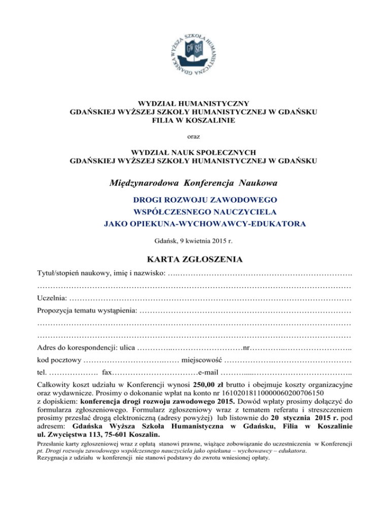 WYDZIAŁ HUMANISTYCZNY GDAŃSKIEJ WYŻSZEJ SZKOŁY HUMANISTYCZNEJ W GDAŃSKU FILIA W KOSZALINIE oraz WYDZIAŁ NAUK SPOŁECZNYCH GDAŃSKIEJ WYŻSZEJ SZKOŁY HUMANISTYCZNEJ W GDAŃSKU Międzynarodowa Konferencja Naukowa DROGI ROZWOJU ZAWODOWEGO WSPÓŁCZESNEGO NAUCZYCIELA JAKO OPIEKUNA-WYCHOWAWCY-EDUKATORA Gdańsk, 9 kwietnia 2015 r. KARTA ZGŁOSZENIA Tytuł/stopień naukowy, imię i nazwisko: ….…………………………………………………………. ………………………………………………………………………………………………………… Uczelnia: ……………………………………………………………………………………………… Propozycja tematu wystąpienia: ……………………………………………………………………… ………………………………………………………………………………………………………… ………………………………………………………………………………………………………… Adres do korespondencji: ulica …………..………………………nr…………..…………………….. kod pocztowy ………………………….…… miejscowość ……………….………………………… tel. ………………. fax……………………………e-mail ……….....……………………………….. Całkowity koszt udziału w Konferencji wynosi 250,00 zł brutto i obejmuje koszty organizacyjne oraz wydawnicze. Prosimy o dokonanie wpłat na konto nr 16102018110000060200706150 z dopiskiem: konferencja drogi rozwoju zawodowego 2015. Dowód wpłaty prosimy dołączyć do formularza zgłoszeniowego. Formularz zgłoszeniowy wraz z tematem referatu i streszczeniem prosimy przesłać drogą elektroniczną (adresy powyżej) lub listownie do 20 stycznia 2015 r. pod adresem: Gdańska Wyższa Szkoła Humanistyczna w Gdańsku, Filia w Koszalinie ul. Zwycięstwa 113, 75-601 Koszalin. Przesłanie karty zgłoszeniowej wraz z opłatą stanowi prawne, wiążące zobowiązanie do uczestniczenia w Konferencji pt. Drogi rozwoju zawodowego współczesnego nauczyciela jako opiekuna – wychowawcy – edukatora. Rezygnacja z udziału w konferencji nie stanowi podstawy do zwrotu wniesionej opłaty. WYDZIAŁ HUMANISTYCZNY GDAŃSKIEJ WYŻSZEJ SZKOŁY HUMANISTYCZNEJ W GDAŃSKU FILIA W KOSZALINIE oraz WYDZIAŁ NAUK SPOŁECZNYCH GDAŃSKIEJ WYŻSZEJ SZKOŁY HUMANISTYCZNEJ W GDAŃSKU Międzynarodowa Konferencja Naukowa DROGI ROZWOJU ZAWODOWEGO WSPÓŁCZESNEGO NAUCZYCIELA JAKO OPIEKUNA-WYCHOWAWCY-EDUKATORA Gdańsk, 9 kwietnia 2015 r. Fakturę VAT proszę wystawić na: Nazwa uczelni/instytucji: …………………………………………………………………………………..… …………………………………………………………………………………...... ulica: ……………………………………………………….. nr…….……………. kod pocztowy …………………………… miejscowość ………………………... tel. ……………………… fax ………………… e-mail …………………………. NIP ……………………………………………………………………………….. Osoba upoważniona do potwierdzenia płatności: …………………………………………………………………………………… Kontakt: tel./fax …………………………………………………………………………………… Upoważniam Gdańską Wyższą Szkołę Humanistyczną do wystawienia faktury bez podpisu odbiorcy za uczestnictwo w Konferencji DROGI ROZWOJU ZAWODOWEGO WSPÓŁCZESNEGO NAUCZYCIELA JAKO OPIEKUNA-WYCHOWAWCY-EDUKATORA ………………………………… data …..……………………............ podpis uczestnika
