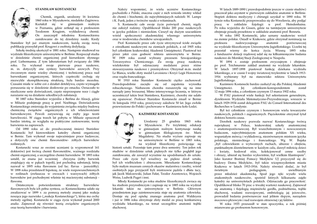 STANISŁAW KOSTANECKI Chemik, organik, urodzony 16 kwietnia 1860 roku w Myszakowie, niedaleko Zagórowa. Kształcił się w gimnazjum realnym w Poznaniu, gdzie zetknął się z profesorem Teodorem Krugiem, wykładowcą chemii. On zaszczepił młodemu Kostaneckiemu zamiłowanie do tej dziedziny nauki. Kiedy Stanisław był juŜ znanym naukowcem, kaŜdą swoją nową publikację przesyłał prof. Krugowi z osobistą dedykacją. Szkołę średnią ukończył w 1881 roku. Następnie studiował na wydziale filozoficznym uniwersytetu w Berlinie. Rozpoczął studia w dziedzinie chemii organicznej pod kierunkiem słynnego prof. Liebermanna. Z tym laboratorium był związany do 1886 roku. Tu wykonał swoje pierwsze prace naukowe, m. in. dotyczyły one syntezy barwników azowych. Przy ówczesnym stanie wiedzy chemicznej i technicznej praca nad barwnikami organicznymi, których cząsteczki cechują się niezwykle skomplikowaną strukturą, była bardzo mozolna. Czasami miała w sobie coś z działań detektywa, często wymagała poruszania się w dziedzinie dosłownie po omacku. Oznaczało to niezliczone serie doświadczeń, często nieprzespane noce i ciągłe naraŜanie się na działanie szkodliwych substancji. W 1887 roku Stanisław wyjeŜdŜa z Berlina do Alzacji, gdzie w Miluzie podejmuje pracę u prof. Noeltinga. Doświadczenia Kostaneckiego zmierzają do wyjaśnienia związku między budową chemiczną związków organicznych a ich właściwościami barwnikowymi. Powoli zarysowują się zręby jego teorii barwliwości. W ciągu trzech lat pobytu w Miluzie opracował bardzo istotną, ze względu na praktyczne zastosowanie, teorię barwienia na zaprawach. Od 1890 roku aŜ do przedwczesnej śmierci Stanisław Kostanecki był kierownikiem katedry chemii organicznej w Bernie. Tam wykonał swoje najwaŜniejsze prace badawcze, a dotyczyły one chemii flawonoidów- Ŝółtych barwników roślinnych. Kostanecki wraz ze swoimi uczniami (a wypromował 161 doktorów) jest twórcą chemii flawonoidów, waŜnego rozdziału chemii organicznej, a szczególnie chemii barwników. W 1893 roku ustalił, Ŝe znana juŜ wcześniej chryzyna (Ŝółty barwnik znajdujący się w pąkach topoli), jest pochodną substancji, którą nazwał w 1895 roku flawonem (od łac. flavus - jasnoŜółty). W 1898 roku przedstawił hipotezę, Ŝe wiele rozpowszechnionych w roślinach (zwłaszcza w owocach i warzywach) Ŝółtych barwników jest pochodnymi właśnie tej macierzystej substancji flawonu. Ostatecznym potwierdzeniem struktury barwników flawonowych była ich pełna synteza, co Kostaneckiemu udało się zrealizować w 1899 r. za pomocą metody znanej jako reakcja nosząca jego nazwisko („reakcja Kostaneckiego”), która ma cechy metody ogólnej. Kostanecki w ciągu Ŝycia wykonał ponad 2000 analiz. Zajmował się równieŜ teorią związków organicznych oraz teorią barwników i barwienia. NaleŜy wspomnieć, Ŝe wielu uczniów Kostaneckiego pochodziło z Polski, znaczna część z nich wniosła istotny wkład do chemii i biochemii; do najwybitniejszych naleŜeli: W. Lampe i K. Funk, jeden z twórców nauki o witaminach. S. Kostanecki całe swoje Ŝycie poświęcił chemii, nigdy nie załoŜył rodziny. Opublikował blisko 200 prac naukowych w języku polskim i niemieckim. Cieszył się duŜym szacunkiem wśród społeczności akademickiej własnego uniwersytetu oraz w środowisku chemików szwajcarskich. Prof. Kostanecki przez całe Ŝycie utrzymywał ścisłe związki z ośrodkami naukowymi na ziemiach polskich, a od 1905 roku był członkiem krakowskiej Akademii Umiejętności. Piastował teŜ przez jakiś czas godność rektora uniwersytetu w Bernie. W 1909 roku został wybrany prezesem Szwajcarskiego Towarzystwa Chemicznego. Za swoją pracę naukową wielokrotnie był odznaczany medalami przez róŜne stowarzyszenia naukowe i przemysłowe. Otrzymał m.in. medal Le Blanca, wielki złoty medal Lavoisiera i KrzyŜ Legii Honorowej oraz rządu francuskiego. W 1910 roku Stanisław Kostanecki cięŜko zachorował. Prawdopodobnie zaczęło się od zapalenia wyrostka robaczkowego. Niebawem choroba rozszerzyła się na inne narządy jamy brzusznej. Mimo intensywnego leczenia, w którym uczestniczył takŜe brat Stanisława, Kazimierz, choroby nie udało się opanować. Profesor Stanisław Kostanecki zmarł w Bernie 16 listopada 1910 roku, przeŜywszy zaledwie 50 lat. Jego zwłoki przewieziono do Polski i pochowano w Kazimierzu koło Łodzi. KAZIMIERZ KOSTANECKI Urodzony 25 grudnia 1863 roku w Myszakowie. Po trzyletniej edukacji w gimnazjum realnym kontynuuje naukę w gimnazjum filologicznym św. Marii Magdaleny. Na studia wyŜsze zapisuje się na uniwersytecie w Berlinie w 1883 roku, na wydział filozoficzny poświęcając się historii sztuki. Pozostaje tam przez dwa semestry. Ten jeden rok studiów w dziedzinie sztuk pięknych nie tylko pogłębił jego zamiłowania, ale zawaŜył wyraźnie na upodobaniach do sztuki. Przez całe Ŝycie był wraŜliwy na piękno dzieł sztuki, był ich wielbicielem i zbieraczem. Mieszkanie Kostaneckiego było małym muzeum cennych okazów malarstwa i rzeźby, wśród osobistych jego przyjaciół byli mistrzowie pędzla i dłuta tacy, jak Jacek Malczewski, Julian Fałat, Teodor Axentowicz, Wojciech Weiss, Ludwik Puget i inni. Młody Kostanecki po roku studiów filozoficznych zwraca się ku studiom przyrodniczym i zapisuje się w 1885 roku na wydział lekarski takŜe na uniwersytecie w Berlinie. Głównym przedmiotem jego zainteresowania staje się anatomia człowieka. Dostaje się pod opiekę znanego anatoma prof. Waldeyera i juŜ w 1886 roku otrzymuje złoty medal za pracę konkursową wydziału lekarskiego, na temat szczegółów anatomii trąbki słuchowej. W latach 1889-1890 ( prawdopodobnie jeszcze w czasie studiów) pracował jako asystent w pierwszym zakładzie anatomii w Berlinie. Stopień doktora medycyny i chirurgii uzyskał w 1890 roku. W tymŜe roku Kostanecki przeprowadza 