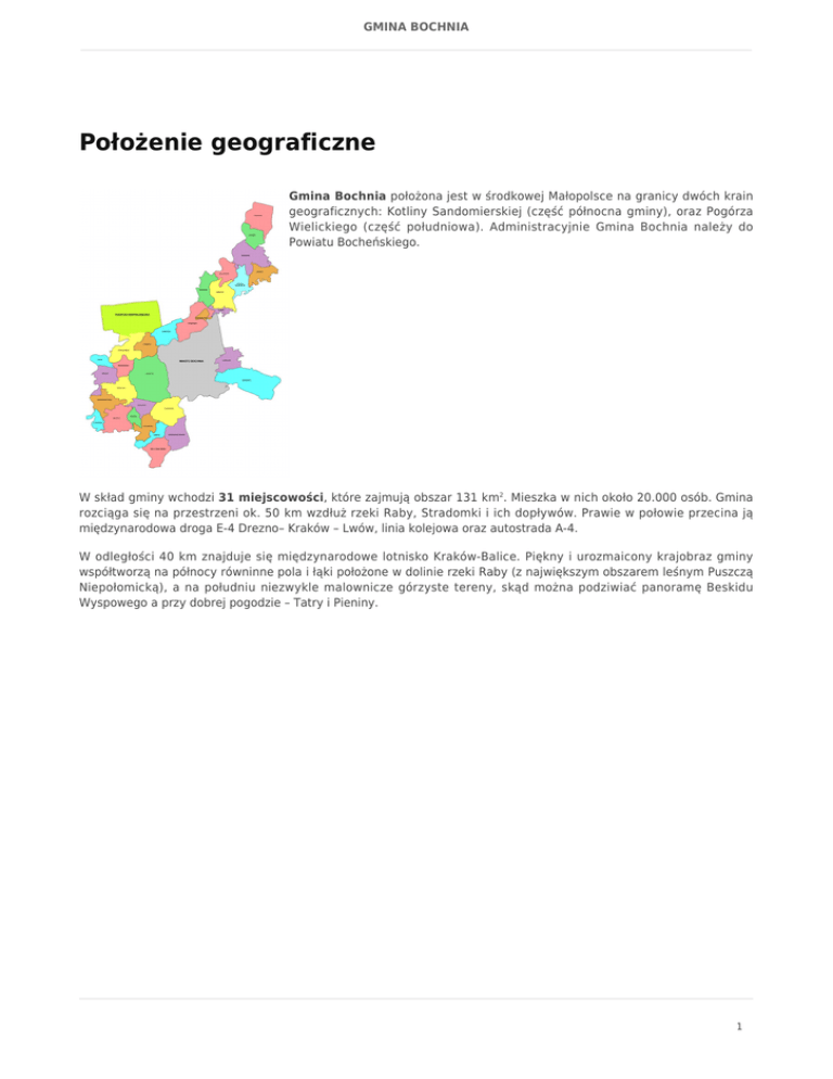 GMINA BOCHNIA Położenie geograficzne Gmina Bochnia położona jest w środkowej Małopolsce na granicy dwóch krain geograficznych: Kotliny Sandomierskiej (część północna gminy), oraz Pogórza Wielickiego (część południowa). Administracyjnie Gmina Bochnia należy do Powiatu Bocheńskiego. W skład gminy wchodzi 31 miejscowości, które zajmują obszar 131 km2. Mieszka w nich około 20.000 osób. Gmina rozciąga się na przestrzeni ok. 50 km wzdłuż rzeki Raby, Stradomki i ich dopływów. Prawie w połowie przecina ją międzynarodowa droga E-4 Drezno– Kraków – Lwów, linia kolejowa oraz autostrada A-4. W odległości 40 km znajduje się międzynarodowe lotnisko Kraków-Balice. Piękny i urozmaicony krajobraz gminy współtworzą na północy równinne pola i łąki położone w dolinie rzeki Raby (z największym obszarem leśnym Puszczą Niepołomicką), a na południu niezwykle malownicze górzyste tereny, skąd można podziwiać panoramę Beskidu Wyspowego a przy dobrej pogodzie – Tatry i Pieniny. 1