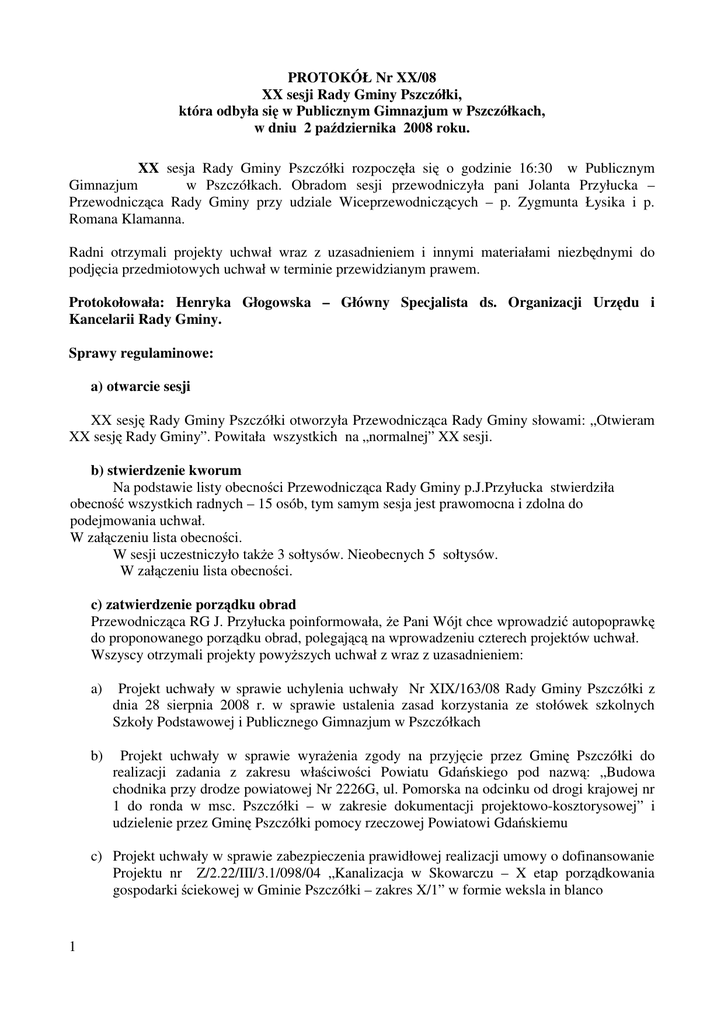 PROTOKÓŁ Nr XX/08 XX sesji Rady Gminy Pszczółki, która odbyła się w Publicznym Gimnazjum w Pszczółkach, w dniu 2 października 2008 roku. XX sesja Rady Gminy Pszczółki rozpoczęła się o godzinie 16:30 w Publicznym Gimnazjum w Pszczółkach. Obradom sesji przewodniczyła pani Jolanta Przyłucka – Przewodnicząca Rady Gminy przy udziale Wiceprzewodniczących – p. Zygmunta Łysika i p. Romana Klamanna. Radni otrzymali projekty uchwał wraz z uzasadnieniem i innymi materiałami niezbędnymi do podjęcia przedmiotowych uchwał w terminie przewidzianym prawem. Protokołowała: Henryka Głogowska – Główny Specjalista ds. Organizacji Urzędu i Kancelarii Rady Gminy. Sprawy regulaminowe: a) otwarcie sesji XX sesję Rady Gminy Pszczółki otworzyła Przewodnicząca Rady Gminy słowami: „Otwieram XX sesję Rady Gminy”. Powitała wszystkich na „normalnej” XX sesji. b) stwierdzenie kworum Na podstawie listy obecności Przewodnicząca Rady Gminy p.J.Przyłucka stwierdziła obecność wszystkich radnych – 15 osób, tym samym sesja jest prawomocna i zdolna do podejmowania uchwał. W załączeniu lista obecności. W sesji uczestniczyło także 3 sołtysów. Nieobecnych 5 sołtysów. W załączeniu lista obecności. c) zatwierdzenie porządku obrad Przewodnicząca RG J. Przyłucka poinformowała, że Pani Wójt chce wprowadzić autopoprawkę do proponowanego porządku obrad, polegającą na wprowadzeniu czterech projektów uchwał. Wszyscy otrzymali projekty powyższych uchwał z wraz z uzasadnieniem: a) Projekt uchwały w sprawie uchylenia uchwały Nr XIX/163/08 Rady Gminy Pszczółki z dnia 28 sierpnia 2008 r. w sprawie ustalenia zasad korzystania ze stołówek szkolnych Szkoły Podstawowej i Publicznego Gimnazjum w Pszczółkach b) Projekt uchwały w sprawie wyrażenia zgody na przyjęcie przez Gminę Pszczółki do realizacji zadania z zakresu właściwości Powiatu Gdańskiego pod nazwą: „Budowa chodnika przy drodze powiatowej Nr 2226G, ul. Pomorska na odcinku od drogi krajowej nr 1 do ronda w msc. Pszczółki – w zakresie dokumentacji projektowo-kosztorysowej” i udzielenie przez Gminę Pszczółki pomocy rzeczowej Powiatowi Gdańskiemu c) Projekt uchwały w sprawie zabezpieczenia prawidłowej realizacji umowy o dofinansowanie Projektu nr Z/2.22/III/3.1/098/04 „Kanalizacja w Skowarczu – X etap porządkowania gospodarki ściekowej w Gminie Pszczółki – zakres X/1” w formie weksla in blanco 1 d) Projekt uchwały w sprawie udzielenia pełnomocnictwa Dyrektorowi Szkoły Podstawowej im. Bohaterów Ziemi Gdańskiej w Pszczółkach – Pani Marzenie Biernackiej do realizacji projektu konkursowego pt. „Otwórz swój umysł – projekt wyrównywania szans uczniów z klas 1-6 Szkoły Podstawowej w Pszczółkach. Zapytała radnych, czy są propozycje dot. porządku obrad. Propozycji nie zgłoszono. Przewod. RG J. Przyłucka zarządziła głosowanie nad przyjęciem proponowanego porządku obrad wraz z wprowadzoną autopoprawką. Obecnych – 15 radnych. Wynik głosowania: za – 15, przeciw i wstrzymujących się nie było. Rada Gminy zatwierdziła zaproponowany porządek obrad. Porządek obrad XX sesji Rady Gminy Pszczółki z dnia 2 października 2008 r. w Publicznym Gimnazjum w Pszczółkach: 1. Sprawy regulaminowe: a) otwarcie sesji, b) stwierdzenie kworum, c) przedstawienie porządku obrad, d) przyjęcie protokołów XV, XVI, XVII, XVIII, XIX sesji, e) interpelacje i zapytania radnych oraz zapytania sołtysów, f) odpowiedzi na interpelacje i zapytania. 2. Informacja o przebiegu wykonania budżetu Gminy Pszczółki w I półroczu 2008 roku – referuje Skarbnik Gminy p. J. Żbikowska. 3. Informacja o przebiegu wykonania budżetu Gminnej Biblioteki Publicznej w Pszczółkach w I półroczu 2008 roku – referuje Dyrektor GBP p. B. Tuźnik. 4. Rozpatrzenie i podjęcie następujących uchwał: a) Projekt uchwały w sprawie zmiany budżetu gminy Pszczółki na 2008 rok – referuje Skarbnik Gminy p. J. Żbikowska. b) Projekt uchwały w sprawie nadania nazwy ulicy w Pszczółkach (prywatna droga wewnętrzna, stanowiąca działkę nr 11/18) – referuje Wójt Gminy p. H. Brejwo. c) Projekt uchwały w sprawie nadania nazwy ulicy w Różynach (prywatna droga wewnętrzna, stanowiąca działkę nr 223/13) – referuje Wójt Gminy p. H. Brejwo. d) Projekt uchwały w sprawie nadania nazwy ulicy w Różynach (prywatna droga wewnętrzna, stanowiąca działkę nr 214/5) – referuje Wójt Gminy p. H. Brejwo. e) sprawie nadania nazwy ulicy w Różynach (prywatna droga wewnętrzna, stanowiąca działkę nr 200/21) – referuje Wójt Gminy p. H. Brejwo. f) Projekt uchwały w sprawie nadania nazw ulicom w sołectwie Ostrowite (obręb Skowarcz) – referuje Wójt Gminy p. H. Brejwo., 2 g) Projekt uchwały w sprawie nadania nazwy ulicy w Skowarczu (droga gminna stanowiąca działkę nr 324) – referuje Wójt Gminy p. H. Brejwo. h) Projekt nieodpłatnego przekazania urządzeń stanowiących wyposażenie budynku kotłowni, znajdującego się na działce nr 737 przy ul. Rataja w Pszczółkach – referuje Wójt Gminy p. H. Brejwo. i) Projekt uchwały w sprawie nabycia działki nr 46/2 cz. w Pszczółkach przez Gminę Pszczółki z przeznaczeniem na poszerzenie ul. Szkolnej – referuje Wójt Gminy p. H. Brejwo. j) Projekt uchwały w sprawie sprzedaży w formie ustnego nieograniczonego niezabudowanej działki nr 414/3 położonej w miejscowości Pszczółki – referuje Wójt Gminy p. H. Brejwo. k) Projekt uchwały w sprawie upoważnienia Wójta do podpisania umowy partnerskiej z gmina Trąbki Wielkie i Gmina Skarszewy dotyczącej realizacji projektu pn. „Cysterski Szlak Rowerowy” Budowa ścieżki rowerowej w gminach Pszczółki – Trąbki Wielkie – Skarszewy – referuje Wójt Gminy p. H. Brejwo. l) Projekt uchwały w sprawie wyrażenia zgody na realizację projektu pn. „Lepszy Urząd. Profesjonalna i efektywna administracja samorządowa” oraz upoważnienia Wójta do pod