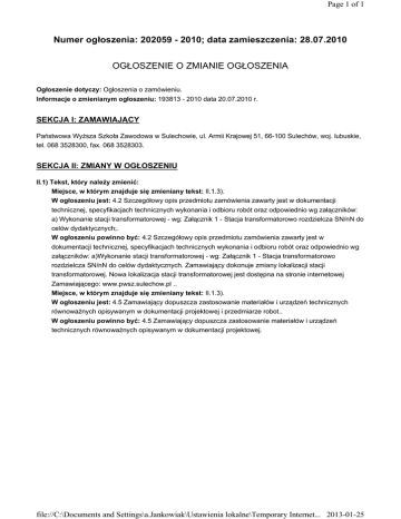 Page 1 of 1 Numer ogłoszenia: 202059 - 2010; data zamieszczenia: 28.07.2010 OGŁOSZENIE O ZMIANIE OGŁOSZENIA Ogłoszenie dotyczy: Ogłoszenia o zamówieniu. Informacje o zmienianym ogłoszeniu: 193813 - 2010 data 20.07.2010 r. SEKCJA I: ZAMAWIAJĄCY Państwowa Wyższa Szkoła Zawodowa w Sulechowie, ul. Armii Krajowej 51, 66-100 Sulechów, woj. lubuskie, tel. 068 3528300, fax. 068 3528303. SEKCJA II: ZMIANY W OGŁOSZENIU II.1) Tekst, który należy zmienić: Miejsce, w którym znajduje się zmieniany tekst: II.1.3). W ogłoszeniu jest: 4.2 Szczegółowy opis przedmiotu zamówienia zawarty jest w dokumentacji technicznej, specyfikacjach technicznych wykonania i odbioru robót oraz odpowiednio wg załączników: a) Wykonanie stacji transformatorowej - wg: Załącznik 1 - Stacja transformatorowo rozdzielcza SN/nN do celów dydaktycznych;. W ogłoszeniu powinno być: 4.2 Szczegółowy opis przedmiotu zamówienia zawarty jest w dokumentacji technicznej, specyfikacjach technicznych wykonania i odbioru robót oraz odpowiednio wg załączników: a)Wykonanie stacji transformatorowej - wg: Załącznik 1 - Stacja transformatorowo rozdzielcza SN/nN do celów dydaktycznych. Zamawiający dokonuje zmiany lokalizacji stacji transformatorowej. Nowa lokalizacja stacji transformatorowej jest dostępna na stronie internetowej Zamawiającego: www.pwsz.sulechow.pl .. Miejsce, w którym znajduje się zmieniany tekst: II.1.3). W ogłoszeniu jest: 4.5 Zamawiający dopuszcza zastosowanie materiałów i urządzeń technicznych równoważnych opisywanym w dokumentacji projektowej i przedmiarze robot.. W ogłoszeniu powinno być: 4.5 Zamawiający dopuszcza zastosowanie materiałów i urządzeń technicznych równoważnych opisywanym w dokumentacji projektowej. file://C:\Documents and Settings\a.Jankowiak\Ustawienia lokalne\Temporary Internet... 2013-01-25