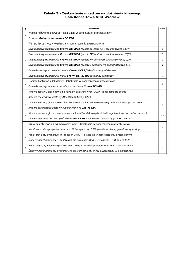 Tabela 3 - Zestawienie urządzeń nagłośnienia kinowego Sala Koncertowa NFM Wrocław lp Urządzenie ilość Procesor dźwięku kinowego - lokalizacja w pomieszczeniu projekcyjnym 1 Procesor Dolby Laboratories CP 750 1 Wzmacniacze mocy - lokalizacja w pomieszczeniu aparaturowym 2 Dwukanałowy wzmacniacz Crown DSi6000 (sekcje LF zestawów zaekranowych L/C/P) 3 Dwukanałowy wzmacniacz Crown DSi6000 (sekcje MF zestawów zaekranowych L/C/P) 3 Dwukanałowy wzmacniacz Crown DSi2000 (sekcje HF zestawów zaekranowych L/C/P) 3 Dwukanałowy wzmacniacz Crown DSi2000 (zestawy zaekranowe subniskotonowe LFE) 2 Ośmiokanałowy wzmacniacz mocy Crown DCi 8/600 (kolumny efektowe) 2 Dwukanałowy wzmacniacz mocy Crown DCi 2/600 (kolumny efektowe) 1 Monitor kontrolno-odsłuchowy - lokalizacja w pomieszczeniu projekcyjnym 3 Ośmiokanałowy monitor kontrolno-odsłuchowy Crown DSi-8M 1 Kinowe zestawy głośnikowe dla kanałów zaekranowych L/C/P - lokalizacja na scenie 4 Kinowe zaekranowe zestawy JBL ScreenArray 5742 3 Kinowe zestawy głośnikowe subniskotonowe dla kanału zaekranowego LFE - lokalizacja na scenie 5 Kinowe zaekranowe zestawy subniskotonowe JBL 4642A 2 Kinowe zestawy głośnikowe ścienne dla kanałów efektowych - lokalizacja frontony balkonów poziom 1 6 Kinowe efektowe zestawy głośnikowe JBL 8350 z uchwytami instalacyjnymi JBL 2517 18 Szafa aparaturowa dla wzmacniaczy mocy - lokalizacja w pomieszczeniu aparaturowym 7 Metalowa szafa sprzętowa typu rack 19" o wysokości 32U, panele zasilania, panel wentylacyjny 1 Panel przyłączy sygnałowych Procesor Dolby - lokalizacja w pomieszczeniu projekcyjnym 8 Ścienny panel przyłączy sygnałowych dla procesora Dolby wyposażony w 8 gniazd XLR 1 Panel przyłączy sygnałowych Procesor Dolby - lokalizacja w pomieszczeniu aparaturowym 9 Ścienny panel przyłączy sygnałowych dla wzmacniaczy mocy wyposażony w 8 gniazd XLR 1