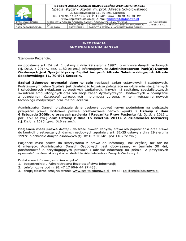 SYSTEM ZARZĄDZANIA BEZPIECZEŃSTWEM INFORMACJI Specjalistyczny Szpital im. prof. Alfreda Sokołowskiego ul. Sokołowskiego 11, 70-891 Szczecin tel. +48 91 44 27 435/ 91 44 17 604 fax.: +48 91 46-20-494 www.szpitalzdunowo.pl; e-mail:[email protected] TYTUŁ DOKUMENTU: WERSJA: DATA ZATWIERDZENIA: INSTRUKCJA OGÓLNA OCHRONY DANYCH OSOBOWYCH –ZAŁĄCZNIK NR 1 3,0 OPRACOWAŁ: ADMINISTRATOR BEZPIECZEŃSTWA INFORMACJI 01.01.2016r. ZATWIERDZIŁ DYREKTOR SZPITALA- ADMINISTRATOR DANYCH NR DOKUMENTU D -SZBI - I - 1 INFORMACJA ADMINISTRATORA DANYCH ogólne Szanowny Pacjencie, na podstawie art. 24 ust. 1 ustawy z dnia 29 sierpnia 1997r. o ochronie danych osobowych (tj. Dz.U. z 2014r., poz. 1182 ze zm.) informujemy, że Administratorem Pani(a) Danych Osobowych jest Specjalistyczny Szpital im. prof. Alfreda Sokołowskiego, ul. Alfreda Sokołowskiego 11, 70-891 Szczecin. Szpital Zdunowo gromadzi dane w celu realizacji zadań ustawowych i statutowych. Podstawowym celem Szpitala jest działalność lecznicza polegająca na udzielaniu stacjonarnych i całodobowych świadczeń zdrowotnych szpitalnych, innych niż szpitalne, specjalistycznych świadczeń ambulatoryjnych oraz realizacja zadań dydaktycznych i badawczych w powiązaniu z udzielaniem świadczeń zdrowotnych i promocją zdrowia, w tym wdrażanie nowych technologii medycznych oraz metod leczenia. Administrator Danych przekazuje dane osobowe upoważnionym podmiotom na podstawie przepisów prawa. Podstawa prawna przetwarzania danych wynika z Ustawy z dnia 6 listopada 2008r. o prawach pacjenta i Rzeczniku Praw Pacjenta (tj. Dz.U. z 2012r., poz. 159 ze zm.) oraz Ustawy z dnia 15 kwietnia 2011r. o działalności leczniczej (tj. Dz.U. z 2015r.,poz. 618 ze zm.). Pacjencie masz prawo dostępu do treści swoich danych, prawo ich poprawiania oraz prawo do kontroli przetwarzanych danych osobowych zgodnie z art. 32-35 ustawy z dnia 29 sierpnia 1997r. o ochronie danych osobowych (tj. Dz.U. z 2014r., poz.1182 ze zm.). Pacjencie masz prawo do skorzystania z prawa do informacji, nie częściej niż raz na 6 miesięcy. Administrator Danych Osobowych jest obowiązany, w terminie 30 dni, poinformować o przysługujących prawach i udzielić informacji na piśmie. Z powyższych uprawnień możesz skorzystać w siedzibie Administratora Danych Osobowych. Dodatkowe informacje można uzyskać: 1. bezpośrednio u Administratora Bezpieczeństwa Informacji; 2. telefonicznie pod nr 91 47 17 604/ 44 27 435; 3. drogą elektroniczną na stronie www.szpitalzdunowo.pl; email: [email protected].