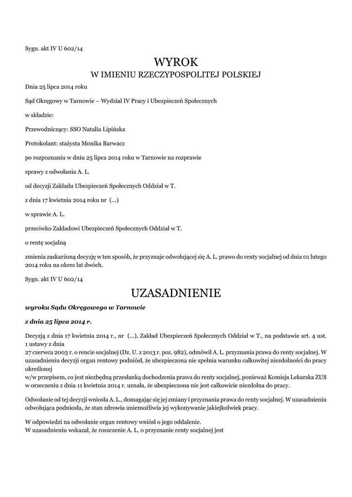 Sygn. akt IV U 602/14 WYROK W IMIENIU RZECZYPOSPOLITEJ POLSKIEJ Dnia 25 lipca 2014 roku Sąd Okręgowy w Tarnowie – Wydział IV Pracy i Ubezpieczeń Społecznych w składzie: Przewodniczący: SSO Natalia Lipińska Protokolant: stażysta Monika Barwacz po rozpoznaniu w dniu 25 lipca 2014 roku w Tarnowie na rozprawie sprawy z odwołania A. L. od decyzji Zakładu Ubezpieczeń Społecznych Oddział w T. z dnia 17 kwietnia 2014 roku nr (...) w sprawie A. L. przeciwko Zakładowi Ubezpieczeń Społecznych Oddział w T. o rentę socjalną zmienia zaskarżoną decyzję w ten sposób, że przyznaje odwołującej się A. L. prawo do renty socjalnej od dnia 01 lutego 2014 roku na okres lat dwóch. Sygn. akt IV U 602/14 UZASADNIENIE wyroku Sądu Okręgowego w Tarnowie z dnia 25 lipca 2014 r. Decyzją z dnia 17 kwietnia 2014 r., nr (...), Zakład Ubezpieczeń Społecznych Oddział w T., na podstawie art. 4 ust. 1 ustawy z dnia 27 czerwca 2003 r. o rencie socjalnej (Dz. U. z 2013 r. poz. 982), odmówił A. L. przyznania prawa do renty socjalnej. W uzasadnieniu decyzji organ rentowy podniósł, że ubezpieczona nie spełnia warunku całkowitej niezdolności do pracy określonej w/w przepisem, co jest niezbędną przesłanką dochodzenia prawa do renty socjalnej, ponieważ Komisja Lekarska ZUS w orzeczeniu z dnia 11 kwietnia 2014 r. uznała, że ubezpieczona nie jest całkowicie niezdolna do pracy. Odwołanie od tej decyzji wniosła A. L., domagając się jej zmiany i przyznania prawa do renty socjalnej. W uzasadnieniu odwołująca podniosła, że stan zdrowia uniemożliwia jej wykonywanie jakiejkolwiek pracy. W odpowiedzi na odwołanie organ rentowy wniósł o jego oddalenie. W uzasadnieniu wskazał, że roszczenie A. L. o przyznanie renty socjalnej jest w świetle orzeczenia Komisji Lekarskiej ZUS z dnia 11 kwietnia 2014 r. bezzasadne- stosownie do treści art. 4 ust. 1 ustawy z dnia 27 czerwca 2003 r. o rencie socjalnej, bowiem odwołująca nie spełnia przesłanek określonych w/w przepisem, z kolei odwołanie nie wnosi żadnych nowych okoliczności, które miałyby wpływ na zmianę tego orzeczenia. Bezsporne w niniejszej sprawie było, że A. L., urodzona (...) r., z zawodu jest technikiem żywienia, ukończyła dwuletnie pomaturalne studium informatyczne i podjęła naukę w policealnym studium administracyjnym, które z trudem ukończyła bez zdobycia tytułu- z uwagi na chorobę. Od 26 stycznia 2007 r. do 31 stycznia 2014 r. wnioskodawczyni pobierała rentę socjalną. W dniu 31 grudnia 2013 r. wystąpiła do organu rentowego z wnioskiem o ponowne przyznanie jej prawa do tego świadczenia. Zaskarżoną decyzją z dnia 17 kwietnia 2014 r. ZUS Oddział w T. odmówił wnioskodawczyni przyznania prawa do renty socjalnej, ponieważ Komisja Lekarska ZUS w orzeczeniu z dnia 11 kwietnia 2014 r. uznała, że ubezpieczona nie jest całkowicie niezdolna do pracy. (okoliczności bezsporne) Nadto Sąd ustalił następujący stan faktyczny sprawy: Lekarz Orzecznik ZUS w opinii lekarskiej z dnia 24 marca 2014 r. stwierdził u wnioskodawczyni: • wrodzony przerost nadnerczy, • zaburzenia wielogruczołowe, • skrócenie kończyny dolnej prawej, • otyłość olbrzymią. W konsekwencji, uznał, że ubezpieczona jest nadal całkowicie niezdolna do pracy na okres do 31 stycznia 2017 r. Na skutek zarzutu wadliwości, sprawa skierowana została do Komisji Lekarskiej ZUS, która w opinii lekarskiej z dnia 11 kwietnia 2014 r. rozpoznała u wnioskodawczyni: • otyłość olbrzymią, • zespół nadnerczowo- płciowy w przebiegu wrodzonego niedoboru 21- hydroksylazy, • wrodzony przerost nadnerczy, • subkliniczną niedoczynność tarczycy, • zespół metaboliczny, • endometriozę- stan po dwukrotnym leczeniu operacyjnym ginekologicznym. Orzeczenie to legło u podstaw wydania zaskarżonej decyzji. dowód: • orzeczenie Lekarza Orzecznika ZUS z dnia 24.03.2014 r.- k. 28 cz. I akt ZUS, • orzeczenie Komisji Lekarskiej ZUS z dnia 11.04.2014 r.- k. 30 cz. I akt ZUS, W celu ustalenia, czy odwołująca jest całkowicie niezdolna do pracy oraz kiedy powstała u niej ewentualna całkowita niezdolność do pracy, Sąd dopuścił dowód z opinii biegłego lekarza sądowego: lek. med. M. B.- specjalisty chorób wewnętrznych i endokrynologa. W wydanej opinii biegły specjalista chorób wewnętrznych i endokrynolog zdiagnozował u odwołującej: • zespół nadnerczowo- płciowy w przebiegu wrodzonego niedoboru 21- hydroksylazy, • wrodzony przerost nadnerczy z zespołem utraty soli, • niedoczynność tarczycy, • zespół metaboliczny, • otyłość olbrzymią, • hyperlipidemię, • usunięcie torbieli endometrialnej jamy Douglasa, • usunięcie przydatków lewych, • bielactwo, • nietrzymanie moczu, • żylaki kończyn dolnych, • zespól bólowy kręgosłupa i stawów obwodowych. W oparciu o przeprowadzone badanie oraz wyniki badań specjalistycznych uznał, że odwołująca jest osobą całkowicie niezdolną do pracy od 1 lutego 2014 r. na okres dwóch lat. W uzasadnieniu opinii podał, że obecnie ograniczenia wydolnościowe badanej wynikają z jej olbrzymiej otyłości, narastającej w szybkim czasie (od 2012 r. wzrost wagi o około 30 kilogramów). Aktualnie waga opiniowanej przekracza 180 kilogramów. Próba podania w/w większych dawek hormonów, celem uzyskania spadku wagi, zakończyła się niepowodzeniem z powodu wystąpienia działań ubocznych w układzie sercowo- naczyniowym pod postacią tachyarytmii. Niewydolność nadnerczowa jest prawidłowo wyrównana suplementacją doustną. Nie występują objawy niedoborowe i objawy dekompensacji. Do tej pory nie było potrzeby hospitalizacji badanej z powodu niedoborów hormonalnych, zaburzeń świadomości czy zaburzeń elektrolitowych. Odwołująca nie może poruszać się sprawnie z uwagi na otyłość. Utrzymanie przez dłuższy czas niezmiennej pozycji wyzwala u niej bóle mięśni z ich usztywnieniem bólowym. Otyłość będąca obrazem 