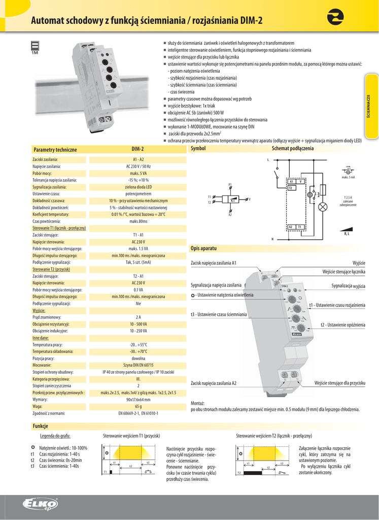 Automat schodowy z funkcją ściemniania / rozjaśniania DIM-2 służy do ściemniania żarówek i oświetleń halogenowych z transformatorem inteligentne sterowanie oświetleniem, funkcja stopniowego rozjaśniania i ściemniania ! wejście sterujące dla przycisku lub łącznika ! ustawienie wartości wykonuje się potencjometrami na panelu przednim modułu, za pomocą którego można ustawić: - poziom natężenia oświetlenia - szybkość rozjaśnienia (czas rozjaśniania) - szybkość ściemniania (czas ściemniania) - czas świecenia ! parametry czasowe można dopasować wg potrzeb ! wyjście bezstykowe: 1x triak ! obciążenie AC 5b (żarówki) 500 W ! możliwość równoległego łączenia przycisków do sterowania ! wykonanie 1-MODUŁOWE, mocowanie na szynę DIN ! zaciski dla przewodu 2x2.5mm2 ! ochrana przeciw przekroczeniu temperatury wewnątrz aparatu (odłączy wyjście + sygnalizacja miganiem diody LED) ! Zaciski zasilania: Napięcie zasilania: Pobór mocy: Tolerancja napięcia zasilania: Sygnalizacja zasilania: Ustawienie czasu: Dokładność czasowa: Dokładność powtórzeń: Koeficjent temperatury: Czas powtórzenia: Sterowanie T1 (łącznik - przełączny) Zaciski sterujące: Napięcie sterowania: Pobór mocy wejścia sterującego: Długość impulsu sterującego: Podłączenie sygnalizacji: Sterowanie T2 (przycisk) Zaciski sterujące: Napięcie sterowania: Pobór mocy wejścia sterującego: Długość impulsu sterującego: Podłączenie sygnalizacji: Wyjście: Prąd znamionowy: Obciążenie rezystancyji: Obciążenie indukcyjne: Inne dane: Temperatura pracy: Temperatura składowania: Pozycja pracy: Mocowanie: Stopień ochrony obudowy: Kategoria przepięciowa: Stopień zanieczyszczenia Przekrój przew. przyłączeniowych : Wymiary: Waga: Zgodność z normami: Symbol DIM-2 Parametry techniczne A1 - A2 AC 230 V / 50 Hz maks. 5 VA -15 %; +10 % zielona dioda LED potencjometrem 10 % - przy ustawieniu mechanicznym 5 % - stabilność wartości nastawionej 0.01 % /°C, wartość bazowa = 20°C maks.80ms Schemat podłączenia L maks. 5 mA A1 A1 V T2 T1 T2 T 2.5 A zalecane zabezpieczenie V A2 A2 T1 R, L T1 - A1 AC 230 V maks. 1.5 VA min.100 ms /maks. nieograniczona Tak, 5 szt. (5mA) N Opis aparatu Wyjście Zacisk napięcia zasilania A1 V A1 T2 - A1 AC 230 V 0.1 VA min.100 ms /maks. nieograniczona Nie Wejście sterujące łącznika T2 Sygnalizacja napięcia zasilania Sygnalizacja wyjścia - Ustawienie natężenia oświetlenia t1 - Ustawienie czasu rozjaśnienia t3 - Ustawienie czasu ściemniania 2A 10 - 500 VA 10 - 250 VA t2 - Ustawienie opóźnienia -20.. +55°C -30.. +70°C dowolna Szyna DIN EN 60715 IP 40 ze strony panelu czołowego / IP 10 zaciski III. 2 maks.2x 2.5, maks.1x4/ z gilzą maks. 1x2.5, 2x1.5 90x17.6x64 mm 65 g EN 60669-2-1, EN 61010-1 A2 Zacisk napięcia zasilania A2 T1 Wejście sterujące dla przycisku Montaż: po obu stronach modułu zalecamy zostawić miejsce min. 0.5 modułu (9 mm) dla lepszego chłodzenia. Funkcje Legenda do grafu: Sterowanie wejściem T1 (przycisk) Natężenie oświetl.: 10-100% t1 Czas rozjaśnienia: 1-40 s t2 Czas świecenia: 0s-20min t3 Czas ściemnienia: 1-40s t3 t1 t2 T1 Sterowanie wejściem T2 (łącznik - przełączny) Naciśnięcie przycisku rozpoczyna cykl rozjaśnienie - świecenie - ściemnianie. Ponowne naciśnięcie przycisku (w czasie trwania cyklu) przedłuży czas świecenia. t3 t1 t2 T2 Załączenie łącznika rozpocznie cykl, który zatrzyma się na ustawionym poziomie. Po wyłączeniu łącznika cykl zostanie ukończony. ŚCIEMNIACZE !