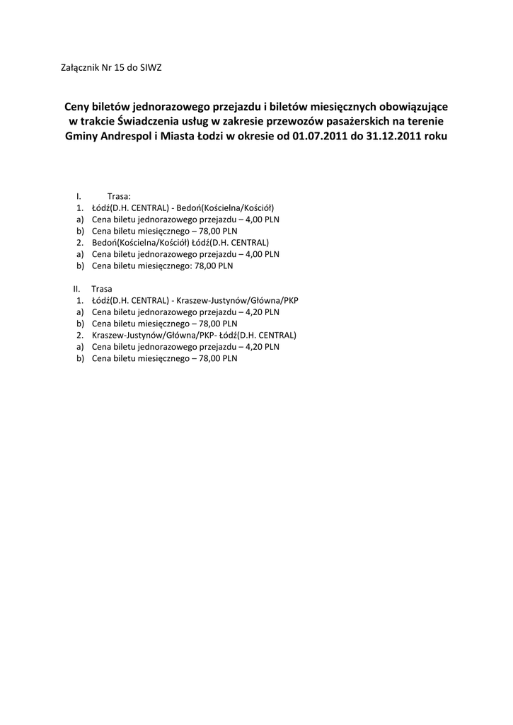 Załącznik Nr 15 do SIWZ Ceny biletów jednorazowego przejazdu i biletów miesięcznych obowiązujące w trakcie Świadczenia usług w zakresie przewozów pasażerskich na terenie Gminy Andrespol i Miasta Łodzi w okresie od 01.07.2011 do 31.12.2011 roku I. 1. a) b) 2. a) b) II. 1. a) b) 2. a) b) Trasa: Łódź(D.H. CENTRAL) - Bedoo(Kościelna/Kościół) Cena biletu jednorazowego przejazdu – 4,00 PLN Cena biletu miesięcznego – 78,00 PLN Bedoo(Kościelna/Kościół) Łódź(D.H. CENTRAL) Cena biletu jednorazowego przejazdu – 4,00 PLN Cena biletu miesięcznego: 78,00 PLN Trasa Łódź(D.H. CENTRAL) - Kraszew-Justynów/Główna/PKP Cena biletu jednorazowego przejazdu – 4,20 PLN Cena biletu miesięcznego – 78,00 PLN Kraszew-Justynów/Główna/PKP- Łódź(D.H. CENTRAL) Cena biletu jednorazowego przejazdu – 4,20 PLN Cena biletu miesięcznego – 78,00 PLN