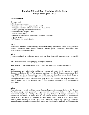 Protokół XII sesji Rady Dzielnicy Wielki Kack