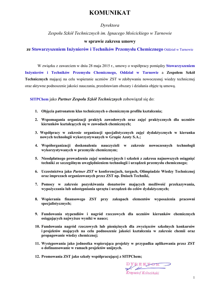 KOMUNIKAT Dyrektora Zespołu Szkół Technicznych im. Ignacego Mościckiego w Tarnowie w sprawie zakresu umowy ze Stowarzyszeniem Inżynierów i Techników Przemysłu Chemicznego Oddział w Tarnowie W związku z zawarciem w dniu 28 maja 2015 r., umowy o współpracy pomiędzy Stowarzyszeniem Inżynierów i Techników Przemysłu Chemicznego, Oddział w Tarnowie a Zespołem Szkół Technicznych mającej na celu wspieranie uczniów ZST w zdobywaniu nowoczesnej wiedzy technicznej oraz aktywne podnoszenie jakości nauczania, przedstawiam obszary i działania objęte tą umową. SITPChem jako Partner Zespołu Szkół Technicznych zobowiązał się do: 1. Objęcia patronatem klas technicznych o chemicznym profilu kształcenia; 2. Wspomagania organizacji praktyk zawodowych oraz zajęć praktycznych dla uczniów kierunków kształcących się w zawodach chemicznych; 3. Współpracy w zakresie organizacji specjalistycznych zajęć dydaktycznych w kierunku nowych technologii wykorzystywanych w Grupie Azoty S.A.; 4. Współorganizacji doskonalenia nauczycieli wykorzystywanych w przemyśle chemicznym; w zakresie nowoczesnych technologii 5. Nieodpłatnego prowadzenia zajęć seminaryjnych i szkoleń z zakresu najnowszych osiągnięć techniki ze szczególnym uwzględnieniem technologii i urządzeń przemysłu chemicznego; 6. Uczestnictwa jako Partner ZST w konferencjach, targach, Olimpiadzie Wiedzy Technicznej oraz imprezach organizowanych przez ZST np. Dniach Techniki, 7. Pomocy w zakresie pozyskiwania donatorów mających możliwość przekazywania, wypożyczania lub udostępniania sprzętu i urządzeń do celów dydaktycznych; 8. Wspierania finansowego specjalistycznych; ZST przy zakupach elementów wyposażenia pracowni 9. Fundowania stypendiów i nagród rzeczowych dla uczniów kierunków chemicznych osiągających najwyższe wyniki w nauce; 10. Fundowania nagród rzeczowych lub pieniężnych dla zwycięzców szkolnych konkursów i projektów mających na celu podnoszenie jakości kształcenia w zakresie chemii oraz propagowanie wiedzy chemicznej; 11. Występowania jako jednostka wspierająca projekty w przypadku aplikowania przez ZST o dofinansowanie w ramach projektów unijnych. 12. Promowania ZST jako szkoły współpracującej z SITPChem; 1