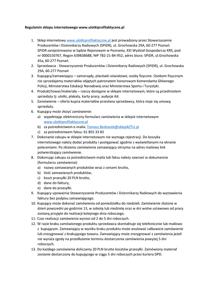 Regulamin sklepu internetowego www.ulotkiprofilaktyczne.pl 1. Sklep internetowy www.ulotkiprofilaktyczne.pl jest prowadzony przez Stowarzyszenie Producentów i Dziennikarzy Radiowych (SPiDR), ul. Grochowska 29A, 60-277 Poznań. SPiDR zarejestrowano w Sądzie Rejonowym w Poznaniu, XXI Wydział Gospodarczy KRS, pod nr 0000150767, Regon 639838688, NIP 782-21-84-952, adres biura: SPiDR, ul.Grochowska 45a, 60-277 Poznań. 2. Sprzedawca - Stowarzyszenie Producentów i Dziennikarzy Radiowych (SPiDR), ul. Grochowska 29A, 60-277 Poznań 3. Kupujący/zamawiający – samorządy, placówki oświatowe, osoby fizyczne. Osobom fizycznym nie sprzedajemy materiałów objętych patronatem honorowym Komendanta Głównego Policji, Ministerstwa Edukacji Narodowej oraz Ministerstwa Sportu i Turystyki. 4. Produkt/towar/materiały – rzeczy dostępne w sklepie internetowym, które są przedmiotem sprzedaży tj: ulotki, plakaty, karty pracy, audycje itd. 5. Zamówienie – oferta kupna materiałów przesłana sprzedawcy, która staje się umową sprzedaży. 6. Kupujący może złożyć zamówienie: a) wypełniając elektroniczny formularz zamówienia w sklepie internetowym www.ulotkiprofilaktyczne.pl b) za pośrednictwem e-maila: [email protected] c) za pośrednictwem faksu: 61 855 33 83 7. Dokonanie zakupu w sklepie internetowym nie wymaga rejestracji. Do koszyka internetowego należy dodać produkty i postępować zgodnie z wyświetlanymi na ekranie poleceniami. Po złożeniu zamówienia zamawiający otrzyma na adres mailowy link potwierdzający zamówienie. 8. Dokonując zakupu za pośrednictwem maila lub faksu należy zawrzeć w dokumencie (formularzu zamówienia): a) nazwy zamawianych produktów wraz z cenami brutto, b) ilość zamawianych produktów, c) koszt przesyłki 20 PLN brutto, d) dane do faktury, e) dane do przesyłki. 9. Kupujący upoważnia Stowarzyszenie Producentów i Dziennikarzy Radiowych do wystawienia faktury bez podpisu zamawiającego. 10. Kupujący może dokonać zamówienia od poniedziałku do niedzieli. Zamówienie złożone w dzień powszedni po godzinie 13, w sobotę lub niedzielę oraz w dni wolne ustawowo od pracy zostaną przyjęte do realizacji kolejnego dnia roboczego. 11. Czas realizacji zamówienia wynosi od 2 do 5 dni roboczych. 12. W razie braku zamówionego produktu sprzedawca skontaktuje się telefonicznie lub mailowo z kupującym. Zamawiający w wyniku braku produktu może anulować całkowicie zamówienie lub zrezygnować z brakującego towaru. Zamawiający może zrezygnować z zamówienia jeżeli nie wyraża zgody na przedłużenie terminu dostarczenia zamówienia powyżej 5 dni roboczych. 13. Do każdego zamówienia doliczamy 20 PLN brutto kosztów przesyłki. Zamówiony materiał zostanie dostarczony do kupującego w ciągu 5 dni roboczych przez kuriera DPD. 14. Istnieje możliwość bezpłatnego odbioru zamówionych materiałów w siedzibie firmy: SPiDR, ul. Grochowska 45a, 60-277 Poznań. W tym celu należy skontaktować się ze sprzedawcą mailowo bądź telefonicznie. 15. Zamówienie może zostać anulowane przez sprzedawcę jeżeli: a)kupujący zamówił towar, który nie mieści się w określonych przez sprzedawcę limitach (minimalna ilość zamówienia), b)kupujący będący osobą fizyczną zamówił materiały objęte patronatem honorowym wyszczególnionym w punkcie 3. c) sprzedawca nie może zrealizować zamówienia z powodu braku produktu. 16. Liczba zamówionych materiałów nie może być mniejsza niż: a) 25 sztuk – ulotki, karty pracy b) 1 sztuka – plakaty, scenariusze zajęć, audycje edukacyjne, zawieszki odblaskowe, książki, gadżety. 17. Za zamówione materiały należy zapłacić przelewem zwykłym lub internetowym. Do paczki dołączamy fakturę. Przelew należy zrealizować dopiero po otrzymaniu paczki z materiałami i fakturą. Termin płatności faktury – do 14 dni. 18. Kupujący może odstąpić od umowy sprzedaży bez podania przyczyny w terminie do 14 dni od momentu otrzymania zamówionego materiału. 19. Kupujący odstępując od umowy sprzedaży zobowiązuje się do zwrotu zamówionych materiałów do sprzedawcy na własny koszt. Zamówiony towar nie może być uszkodzony. Do paczki należy dołączyć oświadczenie o odstąpieniu umowy zawartej na odległość oraz dowód zakupu.