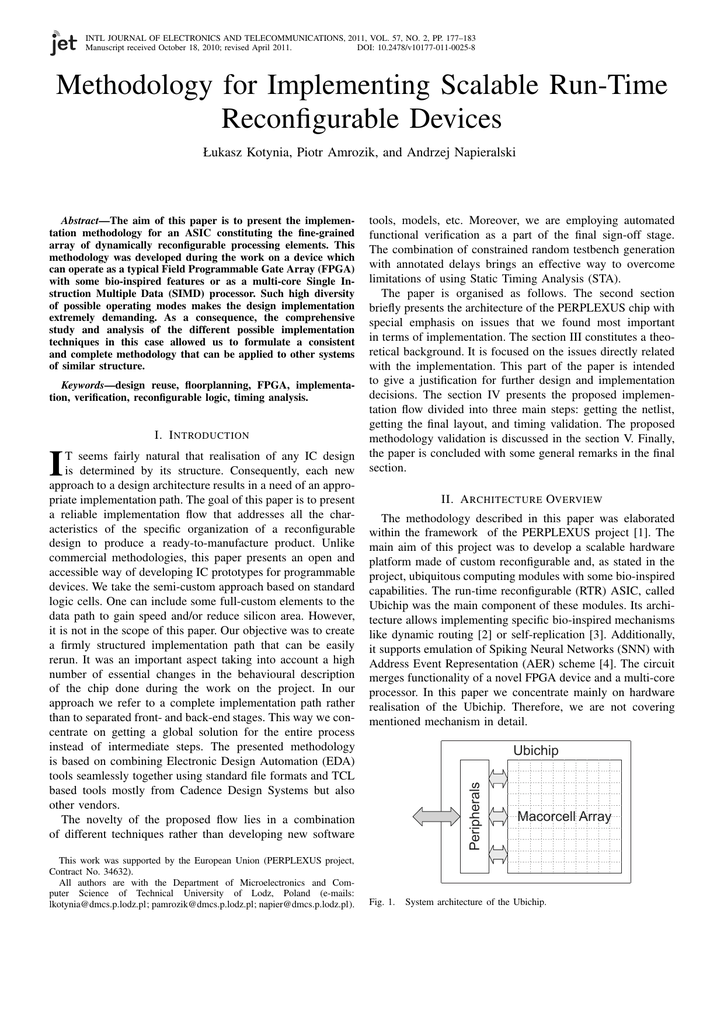 INTL JOURNAL OF ELECTRONICS AND TELECOMMUNICATIONS, 2011, VOL. 57, NO. 2, PP. 177–183 Manuscript received October 18, 2010; revised April 2011. DOI: 10.2478/v10177-011-0025-8 Methodology for Implementing Scalable Run-Time Reconfigurable Devices Łukasz Kotynia, Piotr Amrozik, and Andrzej Napieralski Keywords—design reuse, floorplanning, FPGA, implementation, verification, reconfigurable logic, timing analysis. I. I NTRODUCTION I T seems fairly natural that realisation of any IC design is determined by its structure. Consequently, each new approach to a design architecture results in a need of an appropriate implementation path. The goal of this paper is to present a reliable implementation flow that addresses all the characteristics of the specific organization of a reconfigurable design to produce a ready-to-manufacture product. Unlike commercial methodologies, this paper presents an open and accessible way of developing IC prototypes for programmable devices. We take the semi-custom approach based on standard logic cells. One can include some full-custom elements to the data path to gain speed and/or reduce silicon area. However, it is not in the scope of this paper. Our objective was to create a firmly structured implementation path that can be easily rerun. It was an important aspect taking into account a high number of essential changes in the behavioural description of the chip done during the work on the project. In our approach we refer to a complete implementation path rather than to separated front- and back-end stages. This way we concentrate on getting a global solution for the entire process instead of intermediate steps. The presented methodology is based on combining Electronic Design Automation (EDA) tools seamlessly together using standard file formats and TCL based tools mostly from Cadence Design Systems but also other vendors. The novelty of the proposed flow lies in a combination of different techniques rather than developing new software This work was supported by the European Union (PERPLEXUS project, Contract No. 34632). All authors are with the Department of Microelectronics and Computer Science of Technical University of Lodz, Poland (e-mails: [email protected]; [email protected]; [email protected]). tools, models, etc. Moreover, we are employing automated functional verification as a part of the final sign-off stage. The combination of constrained random testbench generation with annotated delays brings an effective way to overcome limitations of using Static Timing Analysis (STA). The paper is organised as follows. The second section briefly presents the architecture of the PERPLEXUS chip with special emphasis on issues that we found most important in terms of implementation. The section III constitutes a theoretical background. It is focused on the issues directly related with the implementation. This part of the paper is intended to give a justification for further design and implementation decisions. The section IV presents the proposed implementation flow divided into three main steps: getting the netlist, getting the final layout, and timing validation. The proposed methodology validation is discussed in the section V. Finally, the paper is concluded with some general remarks in the final section. II. A RCHITECTURE OVERVIEW The methodology described in this paper was elaborated within the framework of the PERPLEXUS project [1]. The main aim of this project was to develop a scalable hardware platform made of custom reconfigurable and, as stated in the project, ubiquitous computing modules with some bio-inspired capabilities. The run-time reconfigurable (RTR) ASIC, called Ubichip was the main component of these modules. Its architecture allows implementing specific bio-inspired mechanisms like dynamic routing [2] or self-replication [3]. Additionally, it supports emulation of Spiking Neural Networks (SNN) with Address Event Representation (AER) scheme [4]. The circuit merges functionality of a novel FPGA device and a multi-core processor. In this paper we concentrate mainly on hardware realisation of the Ubichip. Therefore, we are not covering mentioned mechanism in detail. Ubichip Peripherals Abstract—The aim of this paper is to present the implementation methodology for an ASIC constituting the fine-grained array of dynamically reconfigurable processing elements. This methodology was developed during the work on a device which can operate as a typical Field Programmable Gate Array (FPGA) with some bio-inspired features or as a multi-core Single Instruction Multiple Data (SIMD) processor. Such high diversity of possible operating modes makes the design implementation extremely demanding. As a consequence, the comprehensive study and analysis of the different possible implementation techniques in this case allowed us to formulate a consistent and complete methodology that can be applied to other systems of similar structure. Fig. 1. Macorcell Array System architecture of the Ubichip. 178 Ł. KOTYNIA, P. AMROZIK, A. NAPIERALSKI From the system point of view, the mentioned ASIC comprises an array 10 by 10 of configurable elements called Macrocells and some peripherals including modules responsible for configuration, control, and communication with the external world – see Fig.1. In this paper we focus on the array of the Macrocells, since it is the key part of the chip. The array of the Macrocells can operate in two different modes. In the first mode it acts as an FPGA device designed to facilitate bioinspired behaviours. In the other mode, each Macrocell can be seen as a 16-bit processor which makes the array a multicore processor operating in a Single Instruction Multiple Data (SIMD) manner. Ubicell Macrocell SRDR unit Input switchbox Ubicell Ubicell Ubicell ALU LUT/Memory/ ALU Regs Flags switchbox Output switchbox Ubicell (a) (b) Fig. 2. Schematic organization of (a) Macrocell and (b) Ubicell (connection between ALU, LUT/Memory/ALU Regs section and