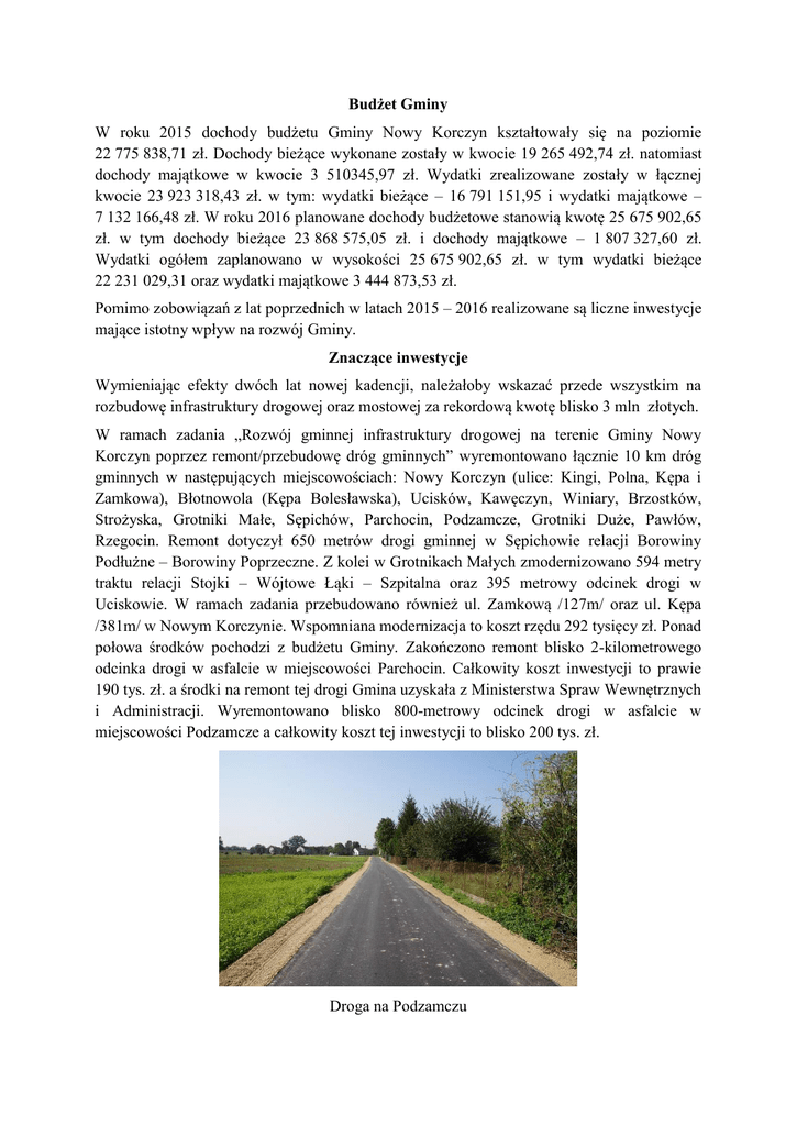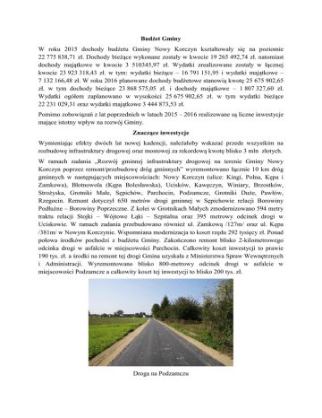 Budżet Gminy W roku 2015 dochody budżetu Gminy Nowy Korczyn kształtowały się na poziomie 22 775 838,71 zł. Dochody bieżące wykonane zostały w kwocie 19 265 492,74 zł. natomiast dochody majątkowe w kwocie 3 510345,97 zł. Wydatki zrealizowane zostały w łącznej kwocie 23 923 318,43 zł. w tym: wydatki bieżące – 16 791 151,95 i wydatki majątkowe – 7 132 166,48 zł. W roku 2016 planowane dochody budżetowe stanowią kwotę 25 675 902,65 zł. w tym dochody bieżące 23 868 575,05 zł. i dochody majątkowe – 1 807 327,60 zł. Wydatki ogółem zaplanowano w wysokości 25 675 902,65 zł. w tym wydatki bieżące 22 231 029,31 oraz wydatki majątkowe 3 444 873,53 zł. Pomimo zobowiązań z lat poprzednich w latach 2015 – 2016 realizowane są liczne inwestycje mające istotny wpływ na rozwój Gminy. Znaczące inwestycje Wymieniając efekty dwóch lat nowej kadencji, należałoby wskazać przede wszystkim na rozbudowę infrastruktury drogowej oraz mostowej za rekordową kwotę blisko 3 mln złotych. W ramach zadania „Rozwój gminnej infrastruktury drogowej na terenie Gminy Nowy Korczyn poprzez remont/przebudowę dróg gminnych” wyremontowano łącznie 10 km dróg gminnych w następujących miejscowościach: Nowy Korczyn (ulice: Kingi, Polna, Kępa i Zamkowa), Błotnowola (Kępa Bolesławska), Ucisków, Kawęczyn, Winiary, Brzostków, Strożyska, Grotniki Małe, Sępichów, Parchocin, Podzamcze, Grotniki Duże, Pawłów, Rzegocin. Remont dotyczył 650 metrów drogi gminnej w Sępichowie relacji Borowiny Podłużne – Borowiny Poprzeczne. Z kolei w Grotnikach Małych zmodernizowano 594 metry traktu relacji Stojki – Wójtowe Łąki – Szpitalna oraz 395 metrowy odcinek drogi w Uciskowie. W ramach zadania przebudowano również ul. Zamkową /127m/ oraz ul. Kępa /381m/ w Nowym Korczynie. Wspomniana modernizacja to koszt rzędu 292 tysięcy zł. Ponad połowa środków pochodzi z budżetu Gminy. Zakończono remont blisko 2-kilometrowego odcinka drogi w asfalcie w miejscowości Parchocin. Całkowity koszt inwestycji to prawie 190 tys. zł. a środki na remont tej drogi Gmina uzyskała z Ministerstwa Spraw Wewnętrznych i Administracji. Wyremontowano blisko 800-metrowy odcinek drogi w asfalcie w miejscowości Podzamcze a całkowity koszt tej inwestycji to blisko 200 tys. zł. Droga na Podzamczu Wyremontowano również następujące odcinki dróg: 1/ Rzegocin – Badrzychowice – Strożyska za kwotę 190 tys. zł. 2/ Nowy Korczyn – Grotniki Duże za kwotę 113 tys. zł. 3/Winiary – rz. Wisła za kwotę 97 tys. zł. Droga w Rzegocinie Zmodernizowano także 800-metrowy odcinek drogi Górnowola – Kawęczyn, gdzie całkowity koszt realizacji tego zadania wynosi ponad 260 tys. zł. Środki na realizację tego zadania pochodzą w części z Ministerstwa Spraw Wewnętrznych oraz budżetu gminy. Wiele wysiłków i cierpliwości wymagało zrealizowanie zadania polegającego na remoncie mostów w miejscowościach Czarkowy i Żukowice, które ważne są głownie dla miejscowych rolników. Teraz w miejscu starych, mocno zniszczonych mostów, stoją prawie nowe ze stalową konstrukcją, mają długość 43 i 45 metrów, nośność po 10 ton. Most czarkowski W ramach prowadzonej działalności komunalnej w 2015 r. gmina Nowy Korczyn zakupiła za kwotę 166 tys. zł. koparkę gąsienicową Doosan DX60R, dzięki której udało się odtworzyć ponad 30 km rowów na terenie gminy. Dzięki dobrze układającej się współpracy z Marszałkiem Województwa Adamem Jarubasem otrzymano nieodpłatnie z Wojewódzkiego Ośrodka Ruchu Drogowego w Kielcach samochód ciężarowy marki STAR –MAN TRUCKS, który zastąpił wysłużonego 30-letniego Stara 200, a wykorzystywany jest na działania statutowe gminy, poprawiając m.in. bezpieczeństwo w komunikacji samochodowej. Po wielu latach oczekiwania remontu doczekała się także sala Urzędu Stanu Cywilnego przy ulicy Buskiej, gdzie odbywają się śluby, spotykają się pary małżeńskie świętujące jubileusze wspólnego życia, odbywają się sesje Rady Gminy. W ramach remontu odnowiono i pomalowano ściany oraz sufit, wymieniona została instalacja elektryczna oraz stolarka drzwiowa, położono także panele podłogowe. Jedną z istotniejszych prac wykonanych w ramach remontu było usunięcie zbędnego i szpecącego podestu, co pozwoliło na znaczne powiększenie sali. W 2015 roku gmina zatroszczyła się również o podniesienie standardu świadczenia usług kulturalnych poprzez dokonanie remontu i wyposażenia świetlic w następujących miejscowościach: Pawłów, Sępichów, Badrzychowice, Grotniki Małe, Czarkowy, Stary i Nowy Korczyn, Parchocin oraz Błotnowola. Prace remontowe polegały m.in. na wymianie stolarki drzwiowej i okiennej, wymianie pokrycia dachowego, wykonaniu elewacji zewnętrznej, malowaniu pomieszczeń, wymianie posadzki. Ponadto zwiększone zostało wyposażenie świetlic. Łączna wartość prac remontowych wraz z wykonaniem dokumentacji i nadzorem inwestorskim to blisko 770 tys. złotych. Gmina czyni starania w kierunku realizacji następnego etapu rewitalizacji. Opracowany już został, przy udziale Funduszu Spójności w ramach PO PT, Program Rewitalizacji Gminy Nowy Korczyn na lata 2016 – 2020. Utworzony zostanie Komitet Rewitalizacyjny składający się z przedstawicieli różnych środowisk dla których ważny jest rozwój Gminy nowy Korczyn. Świetlica w Czarkowach Ochrona środowiska naturalnego Gmina Nowy Korczyn, dbając o ochronę środowiska naturalnego, zleciła opracowanie dokumentacji technicznej na realizację przedsięwzięcia pn. „Budowa kanalizacji sanitarnej w miejscowości Górnowola wraz z przebudową oczyszczalni ścieków w Grotnikach Dużych. Realizowany jest również II etap programu pn. „Instalacja systemów energii odnawialnej na budynkach użyteczności publicznej i domach prywatnych w gminach powiatu buskiego i pińczowskiego, współfinansowanego ze środków Szwajcarsko Polsk