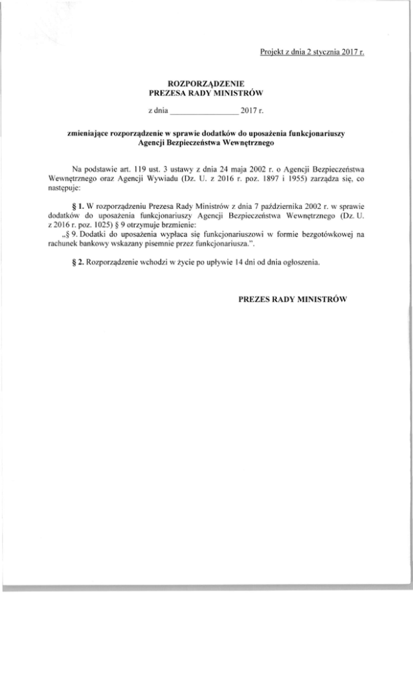 Projekt z dnia 2 stycznia 2017 r. ROZPORZĄDZENIE PREZESA RADY MINISTRÓW z dnia 2017 r. zmieniające rozporządzenie w sprawie dodatków do uposażenia funkcjonariuszy Agencji Bezpieczeństwa Wewnętrznego N a podstawie art. 119 ust. 3 ustawy z dnia 24 maja 2002 r. o Agencji Bezpieczeństwa Wewnętrznego oraz Agencji Wywiadu (Dz. U . z 2016 r. poz. 1897 i 1955) zarządza się, co następuje: § 1. W rozporządzeniu Prezesa Rady Ministrów z dnia 7 października 2002 r. w sprawie dodatków do uposażenia funkcjonariuszy Agencji Bezpieczeństwa Wewnętrznego (Dz. U . z 2016 r. poz. 1025) § 9 otrzymuje brzmienie: „§ 9. Dodatki do uposażenia wypłaca się funkcjonariuszowi w formie bezgotówkowej na rachunek bankowy wskazany pisemnie przez funkcjonariusza.". § 2. Rozporządzenie wchodzi w życie po upływie 14 dni od dnia ogłoszenia. PREZES R A D Y M I N I S T R Ó W UZASADNIENIE Przedmiotowa nowelizacja rozporządzenia zmienia brzmienie § 9 rozporządzenia Prezesa Rady Ministrów z dnia 7 października 2002 r. w sprawie dodatków do uposażenia funkcjonariuszy Agencji Bezpieczeństwa Wewnętrznego (Dz. U . z 2016 r. poz. 1025). Konieczność zmiany brzmienia ww. przepisu przedmiotowego rozporządzenia wynika z wprowadzania w Agencji Bezpieczeństwa Wewnętrznego obrotu bezgotówkowego w zakresie wypłaty funkcjonariuszom wszelkich świadczeń pieniężnych. W nowym prawnym wypłata dodatków do uposażenia przysługujących funkcjonariuszowi stanie Agencji Bezpieczeństwa Wewnętrznego będzie następowała w formie bezgotówkowej na wskazany pisemnie rachunek bankowy. Dane statystyczne posiadane przez Agencję Bezpieczeństwa Wewnętrznego wskazują, iż tylko 1,5% funkcjonariuszy Agencji Bezpieczeństwa Wewnętrznego pobiera dodatki do uposażenia formie w Bezpieczeństwa gotówkowej Wewnętrznego. w kasie właściwej jednostki Pozostała część funkcjonariuszy organizacyjnej Agencji Agencji Bezpieczeństwa Wewnętrznego otrzymuje dodatki do uposażenia w formie przelewu na wskazany rachunek bankowy. Mając powyższe na uwadze należy stwierdzić, iż utrzymywanie w Agencji Bezpieczeństwa Wewnętrznego obrotu gotówkowego dla nielicznej grupy funkcjonariuszy jest działaniem nieekonomicznym oraz nieracjonalnym. Ponadto przyczynia się do generowania nieproporcjonalnie dużych nakładów pracy i czasu oraz kosztów związanych z zaangażowaniem funkcjonariuszy do obsługi tej formy płatności. Przedmiotowy przewidzianym w projekt rozporządzenia przepisach dotyczących nie podlega sposobu notyfikacji zgodnie z trybem funkcjonowania krajowego sytemu notyfikacji norm i aktów prawnych, ponieważ nie zawiera przepisów technicznych. Przedmiotowy projekt rozporządzenia nie był przedstawiany instytucjom i organom Unii Europejskiej lub Europejskiemu Bankowi Centralnemu, celem uzyskania opinii, dokonania konsultacji albo uzgodnienia, ponieważ przepisy przedmiotowego projektu rozporządzenia pozostają poza zakresem prawa Unii Europejskiej. Projekt rozporządzenia będzie podlegał udostępnieniu na stronie podmiotowej A B W w Biuletynie Informacji Publicznej, zgodnie z art. 5 ustawy z dnia 7 lipca 2005 r. o działalności lobbingowej w procesie stanowienia prawa (Dz. U . poz. 1414, z późn. zm.). Zgodnie z § 52 uchwały nr 190 Rady Ministrów z dnia 29 października 2013 r. Regulamin pracy Rady Ministrów ( M . P . z 2016 r. poz. 1006 i 1024) projekt będzie podlegał udostępnieniu w Biuletynie Informacji Publicznej na stronie podmiotowej Rządowego Centrum Legislacji, w serwisie Rządowy Proces Legislacyjny. Przedmiot projektowanej regulacji pozostaje poza zakresem prawa Unii Europejskiej. Nazwa projektu Projekt rozporządzenia Prezesa Rady Ministrów zmieniającego rozporządzenie w sprawie dodatków do uposażenia funkcjonariuszy Agencji Bezpieczeństwa Wewnętrznego Ministerstwo wiodące i ministerstwa współpracujące Kancelaria Prezesa Rady Ministrów; Szef Agencji Bezpieczeństwa Wewnętrznego Osoba odpowiedzialna za projekt w randze Ministra, Sekretarza Stanu lub Podsekretarza Stanu Szef A B W prof. dr hab. Piotr Pogonowski Data sporządzenia 2 stycznia 2017 r. Źródło: upoważnienie ustawowe art. 119 ust. 3 ustawy z dnia 24 maja 2002 r. o Agencji Bezpieczeństwa Wewnętrznego oraz Agencji Wywiadu (Dz. U . z 2016 r. poz. 1897 i 1955) Nr w wykazie prac: 102 Kontakt do opiekuna merytorycznego projektu Dyrektor Biura Prawnego A B W Teresa Rdzanowska tel. 22 58 57 233; e-mail b.pravvnetfabw.gov.pl 1. Jaki problem jest rozwiązywany? Projekt rozporządzenia Prezesa Rady Ministrów zmieniającego rozporządzenie w sprawie dodatków do uposażenia funkcjonariuszy Agencji Bezpieczeństwa Wewnętrznego ma na celu wprowadzenie w Agencji Bezpieczeństwa Wewnętrznego wyłącznie bezgotówkowej formy wypłaty funkcjonariuszom dodatków do uposażenia. 2. Rekomendowane rozwiązanie, w tym planowane narzędzia interwencji, i oczekiwany efekt Projekt rozporządzenia Prezesa Rady Ministrów zmieniającego rozporządzenie w sprawie dodatków do uposażenia funkcjonariuszy Agencji Bezpieczeństwa Wewnętrznego wprowadza bezgotówkowy sposób wypłaty funkcjonariuszowi A B W dodatków do uposażenia na rachunek bankowy wskazany pisemnie przez tego funkcjonariusza. 3. Jak problem został rozwiązany w innych krajach, w szczególności krajach członkowskich OECD/UE? Z uwagi na to, że zakres proponowanych regulacji dotyczy szczegółowych aspektów wewnętrznych A B W , nie jest możliwe podanie rozwiązań przyjętych w innych krajach. 4. Podmioty, na które oddziałuje projekt Grupa funkcjonariusze A B W Wielkość Około 1,5% funkcjonariuszy ABW Źródło danych system baz danych Biura Finansów A B W Oddziaływanie Wypłata funkcjonariuszowi A B W dodatków do uposażenia wyłącznie na rachunek bankowy wskazany przez tego funkcjonariusza 5. Informacje na temat zakresu, czasu trwania i podsumowanie wyników konsultacji Z uwagi na wąski zakres podmiotowy oddziaływania projektu proj