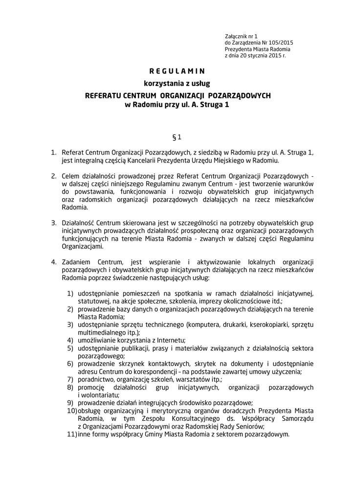 Załącznik nr 1 do Zarządzenia Nr 105/2015 Prezydenta Miasta Radomia z dnia 20 stycznia 2015 r. REGULAMIN korzystania z usług REFERATU CENTRUM ORGANIZACJI POZARZĄDOWYCH w Radomiu przy ul. A. Struga 1 §1 1. Referat Centrum Organizacji Pozarządowych, z siedzibą w Radomiu przy ul. A. Struga 1, jest integralną częścią Kancelarii Prezydenta Urzędu Miejskiego w Radomiu. 2. Celem działalności prowadzonej przez Referat Centrum Organizacji Pozarządowych w dalszej części niniejszego Regulaminu zwanym Centrum - jest tworzenie warunków do powstawania, funkcjonowania i rozwoju obywatelskich grup inicjatywnych oraz radomskich organizacji pozarządowych działających na rzecz mieszkańców Radomia. 3. Działalność Centrum skierowana jest w szczególności na potrzeby obywatelskich grup inicjatywnych prowadzących działalność prospołeczną oraz organizacji pozarządowych funkcjonujących na terenie Miasta Radomia - zwanych w dalszej części Regulaminu Organizacjami. 4. Zadaniem Centrum, jest wspieranie i aktywizowanie lokalnych organizacji pozarządowych i obywatelskich grup inicjatywnych działających na rzecz mieszkańców Radomia poprzez świadczenie następujących usług: 1) udostępnianie pomieszczeń na spotkania w ramach działalności inicjatywnej, statutowej, na akcje społeczne, szkolenia, imprezy okolicznościowe itd.; 2) prowadzenie bazy danych o organizacjach pozarządowych działających na terenie Miasta Radomia; 3) udostępnianie sprzętu technicznego (komputera, drukarki, kserokopiarki, sprzętu multimedialnego itp.); 4) umożliwianie korzystania z Internetu; 5) udostępnianie publikacji, prasy i materiałów związanych z działalnością sektora pozarządowego; 6) prowadzenie skrzynek kontaktowych, skrytek na dokumenty i udostępnianie adresu Centrum do korespondencji – na podstawie zawartej umowy użyczenia; 7) poradnictwo, organizację szkoleń, warsztatów itp.; 8) promocję działalności grup inicjatywnych, organizacji pozarządowych i wolontariatu; 9) prowadzenie działań integrujących środowisko pozarządowe; 10) obsługę organizacyjną i merytoryczną organów doradczych Prezydenta Miasta Radomia, w tym Zespołu Konsultacyjnego ds. Współpracy Samorządu z Organizacjami Pozarządowymi oraz Radomskiej Rady Seniorów; 11) inne formy współpracy Gminy Miasta Radomia z sektorem pozarządowym. §2 1. Centrum czynne jest od poniedziałku do piątku, w godzinach od 730 do 1900. W okresie letnim tj. w lipcu i sierpniu Centrum czynne jest w godzinach od 730 do 1530. Zastrzega się możliwość zmiany godzin pracy Centrum. 2. W budynku zajmowanym przez Centrum, do dyspozycji Organizacji, znajdują się 2 pomieszczenia, w tym: 1) sala konferencyjno - szkoleniowa na około 30 osób, 2) sala komputerowa. 3. Pomieszczenia udostępnianie są nieodpłatnie. 4. Udostępnianie pomieszczeń innym wnioskodawcom, niż wymienieni w § 1 ust. 3, możliwe jest w przypadkach realizacji przedsięwzięć związanych z rozwojem miasta Radomia, po uprzednim wyrażeniu zgody przez Kierownika Centrum. 5. Udostępnianie pomieszczeń odbywa się według kolejności zgłoszeń i zgodnie z harmonogramem spotkań, od poniedziałku do piątku, w godzinach od 730 do 1845 ( w okresie letnim tj. w lipcu i sierpniu w godzinach od 730 do 1515). 6. Korzystanie z usług świadczonych przez Centrum w soboty możliwe jest wyłącznie w przypadkach uzasadnionych interesem społecznym, po uprzednim złożeniu przez Organizację właściwego zapotrzebowania, o którym mowa w § 3 ust. 1 pkt. 2 Regulaminu oraz zatwierdzeniu zapotrzebowania przez Kierownika Centrum. §3 1. Organizacje ubiegające się o udostępnienie pomieszczeń Centrum zobowiązane są do: 1) uzgodnienia z Kierownikiem Centrum dogodnego dla Organizacji i możliwego do zarezerwowania terminu; 2) złożenia pisemnego zapotrzebowania na korzystanie z pomieszczeń w proponowanym terminie wraz z oświadczeniem o zapoznaniu się z Regulaminem oraz zobowiązaniem do jego przestrzegania – wzór zapotrzebowania stanowi Załącznik nr 1 do Regulaminu. 2. Zapotrzebowanie na korzystanie z pomieszczeń Centrum może być zgłoszone przez Organizację osobiście, za pośrednictwem fax-u, poczty elektronicznej lub tradycyjnej. 3. Zatwierdzone terminy oraz zakres korzystania z pomieszczeń i usług Centrum umieszczane są w harmonogramie spotkań, który dostępny jest w placówce na tablicy ogłoszeń oraz na stronie internetowej Miasta Radomia www.radom.pl w zakładce: organizacje pozarządowe – COP – kalendarz spotkań. 4. W przypadku zgłoszeń złożonych przez kilka Organizacji, zawierających zapotrzebowanie pokrywające się terminami bądź zakresem usług, decyduje kolejność zgłoszeń. 5. Centrum zastrzega sobie możliwość wprowadzania zmian w harmonogramie spotkań, po dokonaniu uzgodnień z Organizacjami. 6. Organizacje zgłaszające zapotrzebowanie na salę zobowiązane są do przestrzegania ustalonego czasu spotkań oraz powiadamiania pracowników Centrum o jego odwołaniu lub ewentualnych innych zmianach w zapotrzebowaniu. §4 1. Osoby korzystające z pomieszczeń Centrum zobowiązane są do przestrzegania przepisów porządkowych w szczególności instrukcji BHP i PPOŻ właściwych dla pomieszczeń użyteczności publicznej oraz podporządkowania się uwagom i zaleceniom pracowników Centrum. 2. Korzystający z pomieszczeń Centrum zobowiązani są do dbałości o używane mienie i ponoszą odpowiedzialność za przypadkową bądź celową utratę lub uszkodzenie urządzeń i sprzętu jeżeli są one używane w sposób sprzeczny z przeznaczeniem. 3. Odpowiedzialność za udostępnione urządzenia i sprzęt spoczywa na korzystającym, który zobowiązany jest eksploatować lokal, urządzenia i sprzęt Centrum w sposób niepowodujący jego uszkodzenie. 4. Organizacje korzystające z pomieszczeń Centrum przejmują odpowiedzialność za przestrzeganie Regulaminu Centrum przez pozostałe osoby biorące udział w i