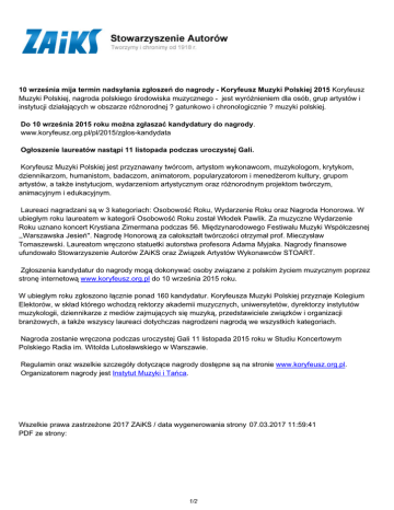 10 września mija termin nadsyłania zgłoszeń do nagrody - Koryfeusz Muzyki Polskiej 2015 Koryfeusz Muzyki Polskiej, nagroda polskiego środowiska muzycznego - jest wyróżnieniem dla osób, grup artystów i instytucji działających w obszarze różnorodnej ? gatunkowo i chronologicznie ? muzyki polskiej. Do 10 września 2015 roku można zgłaszać kandydatury do nagrody. www.koryfeusz.org.pl/pl/2015/zglos-kandydata Ogłoszenie laureatów nastąpi 11 listopada podczas uroczystej Gali. Koryfeusz Muzyki Polskiej jest przyznawany twórcom, artystom wykonawcom, muzykologom, krytykom, dziennikarzom, humanistom, badaczom, animatorom, popularyzatorom i menedżerom kultury, grupom artystów, a także instytucjom, wydarzeniom artystycznym oraz różnorodnym projektom twórczym, animacyjnym i edukacyjnym. Laureaci nagradzani są w 3 kategoriach: Osobowość Roku, Wydarzenie Roku oraz Nagroda Honorowa. W ubiegłym roku laureatem w kategorii Osobowość Roku został Włodek Pawlik. Za muzyczne Wydarzenie Roku uznano koncert Krystiana Zimermana podczas 56. Międzynarodowego Festiwalu Muzyki Współczesnej ,,Warszawska Jesień''. Nagrodę Honorową za całokształt twórczości otrzymał prof. Mieczysław Tomaszewski. Laureatom wręczono statuetki autorstwa profesora Adama Myjaka. Nagrody finansowe ufundowało Stowarzyszenie Autorów ZAiKS oraz Związek Artystów Wykonawców STOART. Zgłoszenia kandydatur do nagrody mogą dokonywać osoby związane z polskim życiem muzycznym poprzez stronę internetową www.koryfeusz.org.pl do 10 września 2015 roku. W ubiegłym roku zgłoszono łącznie ponad 160 kandydatur. Koryfeusza Muzyki Polskiej przyznaje Kolegium Elektorów, w skład którego wchodzą rektorzy akademii muzycznych, uniwersytetów, dyrektorzy instytutów muzykologii, dziennikarze z mediów zajmujących się muzyką, przedstawiciele związków i organizacji branżowych, a także wszyscy laureaci dotychczas nagrodzeni nagrodą we wszystkich kategoriach. Nagroda zostanie wręczona podczas uroczystej Gali 11 listopada 2015 roku w Studiu Koncertowym Polskiego Radia im. Witolda Lutosławskiego w Warszawie. Regulamin oraz wszelkie szczegóły dotyczące nagrody dostępne są na stronie www.koryfeusz.org.pl. Organizatorem nagrody jest Instytut Muzyki i Tańca. Wszelkie prawa zastrzeżone 2017 ZAiKS / data wygenerowania strony 07.03.2017 11:59:41 PDF ze strony: 1/2 http://www.zaiks.org.pl/1010,111,10_wrzesnia_mija_termin_nadsylania_zgloszen_do_nagrody_-_koryfeusz_muzyki_ 2/2